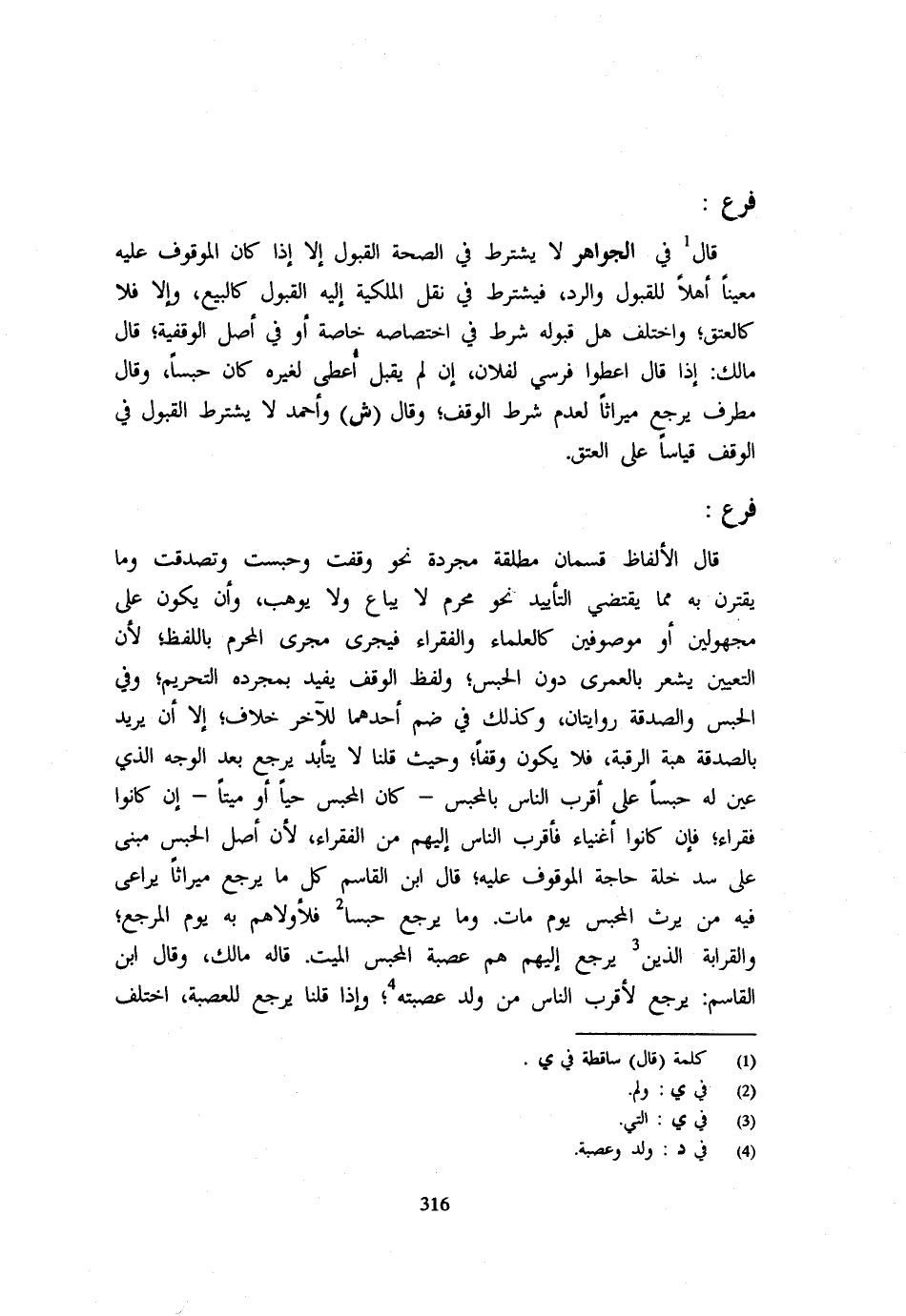 فَرْعٌ - قَالَ الْأَلْفَاظُ قِسْمَانِ مُطْلَقَةٌ مُجَرَّدَةٌ نَحْوَ وَقَفْتُ وَحَبَسْتُ وَتَصَدَّقْتُ وَمَا يَقْتَرِنُ بِهِ مِمَّا يَقْتَضِي التأييد نَحْوَ مُحَرَّمٌ لَا يُبَاعُ وَلَا يُوهَبُ وَأَنْ يَكُونَ عَلَى مَجْهُولِينَ أَوْ مَوْصُوفِينَ كَالْعُلَمَاءِ وَالْفُقَرَاءِ فَيَجْرِي مَجْرَى الْمُحَرَّمِ بِاللَّفْظِ لِأَنَّ التَّعْيِينَ يُشْعِرُ بِالْعُمْرَى دُونَ الْحَبْسِ وَلَفْظُ الْوَقْفِ يُفِيدُ بِمَجْرَدِهِ التَّحْرِيمَ وَفِي الْحَبْسِ وَالصَّدَقَةِ رِوَايَتَانِ وَكَذَلِكَ فِي ضَمِّ أَحَدِهِمَا لِلْآخَرِ خِلَافٌ إِلَّا أَنْ يُرِيدَ بِالصَّدَقَةِ هِبَةَ الرَّقَبَةِ فَلَا يَكُونُ وَقْفًا وَحَيْثُ قُلْنَا لَا يَتَأَبَّدُ يَرْجِعُ بَعْدَ الْوَجْهِ الَّذِي عَيَّنَ لَهُ حَبْسًا عَلَى أَقْرَبِ النَّاسِ بِالْمُحْبِسِ - كَانَ الْمُحْبِسُ حَيًّا أَوْ مَيِّتًا - إِنْ كَانُوا فُقَرَاءَ فَإِنْ كَانُوا أَغْنِيَاءَ فَأَقْرَبُ النَّاسِ إِلَيْهِمْ مِنَ الْفُقَرَاءِ لِأَنَّ أَصْلَ الْحَبْسِ مَبْنِيٌّ عَلَى سَدِّ خَلَّةِ حَاجَةِ الْمَوْقُوفِ عَلَيْهِ قَالَ ابْنُ الْقَاسِمِ كُلُّ مَا يَرْجِعُ مِيرَاثًا يُرَاعَى فِيهِ مَنْ يَرِثُ الْمُحْبِسَ يَوْمَ مَاتَ وَمَا يَرْجِعُ حَبْسًا فَلِأَوْلَاهُمْ بِهِ يَوْمَ الْمَرْجِعِ وَالْقَرَابَةُ الَّذِينَ يَرْجِعُ إِلَيْهِمْ هُمْ عَصَبَةُ الْمُحْبِسِ الْمَيِّتِ قَالَهُ مَالِكٌ وَقَالَ ابْنُ الْقَاسِمِ يَرْجِعُ لِأَقْرَبِ النَّاسِ من ولد عصبته وَإِذَا قُلْنَا يَرْجِعُ لِلْعَصَبَةِ اخْتُلِفَ