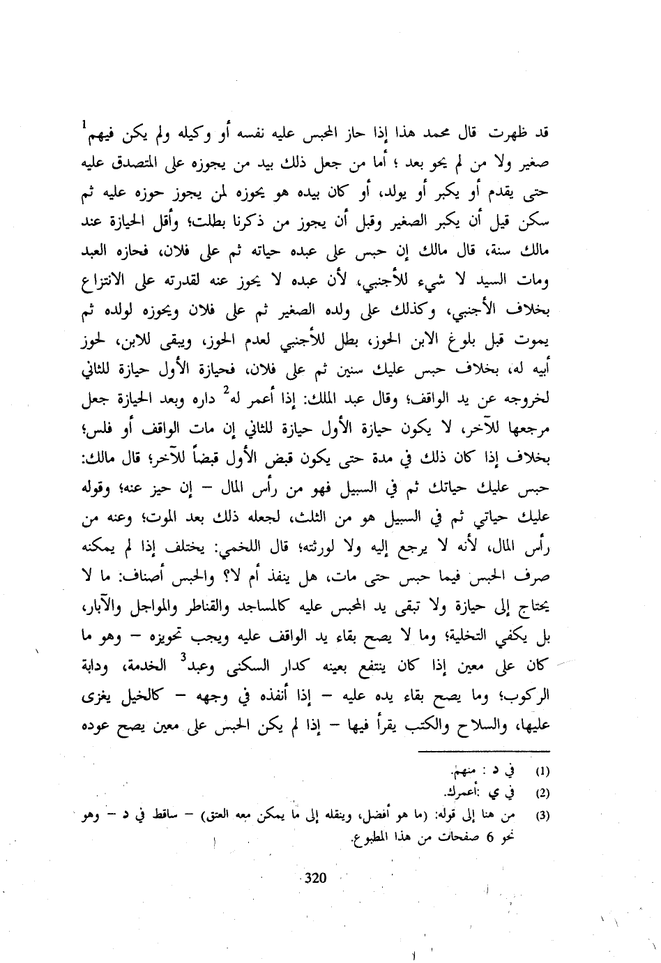 قَدْ ظَهَرَتْ قَالَ مُحَمَّدٌ هَذَا إِذَا حَازَ الْمُحْبَسُ عَلَيْهِ نَفْسُهُ أَوْ وَكِيلُهُ وَلَمْ يَكُنْ فيهم صَغِير وَلَا من لم يحو بَعْدُ أَمَّا مَنْ جَعَلَ ذَلِكَ بِيَدِ مَنْ يجوزه عَلَى الْمُتَصَدَّقِ عَلَيْهِ حَتَّى يَقْدُمَ أَوْ يَكْبُرَ أَوْ يُولَدَ أَوْ كَانَ بِيَدِهِ هُوَ يُحَوِّزُهُ لِمَنْ يَجُوزُ حَوْزُهُ عَلَيْهِ ثُمَّ سَكَنَ قَبْلَ أَن يكبر الصَّغِير وَقبل أَن يجوز مَنْ ذَكَرْنَا بَطَلَتْ وَأَقَلُّ الْحِيَازَةِ عِنْدَ مَالِكٍ سنة قَالَ مَالك إِنْ حَبَسَ عَلَى عَبْدِهِ حَيَاتَهُ ثُمَّ عَلَى فُلَانٍ فَحَازَهُ الْعَبْدُ وَمَاتَ السَّيِّدُ لَا شَيْءَ لِلْأَجْنَبِيِّ لِأَنَّ عَبْدَهُ لَا يَحُوزُ عَنْهُ لِقُدْرَتِهِ عَلَى الِانْتِزَاعِ بِخِلَافِ الْأَجْنَبِيِّ وَكَذَلِكَ عَلَى وَلَدِهِ الصَّغِيرِ ثُمَّ عَلَى فُلَانٍ وَيُحَوِّزُهُ لِوَلَدِهِ ثُمَّ يَمُوتُ قَبْلَ بُلُوغِ الِابْنِ الْحَوْزَ بَطَلَ لِلْأَجْنَبِيِّ لِعَدَمِ الْحَوْزِ وَيَبْقَى لِلِابْنِ لِحَوْزِ أَبِيهِ لَهُ بِخِلَافِ حَبْسٌ عَلَيْكَ سِنِينَ ثُمَّ عَلَى فُلَانٍ فَحِيَازَةُ الْأَوَّلِ حِيَازَةٌ لِلثَّانِي لِخُرُوجِهِ عَنْ يَدِ الْوَاقِفِ وَقَالَ عَبْدُ الْمَلِكِ إِذَا أَعْمَرَ لَهُ دَاره وَبعد الْحِيَازَة جعل مرجعها للْآخر لَا يكون حِيَازَة الأول حِيَازَة للثَّانِي إِن مَاتَ الْوَاقِفُ أَوْ فَلِسَ بِخِلَافِ إِذَا كَانَ ذَلِكَ فِي مُدَّةٍ حَتَّى يَكُونَ قَبْضُ الْأَوَّلِ قَبْضًا لِلْآخَرِ قَالَ مَالِكٌ حَبَسَ عَلَيْكَ حَيَاتَكَ ثُمَّ فِي السَّبِيلِ فَهُوَ مِنْ رَأْسِ الْمَالِ - إِنْ حَيَّزَ عَنْهُ وَقَوْلُهُ عَلَيْكَ حَيَاتِي ثُمَّ فِي السَّبِيلِ هُوَ مِنَ الثُّلُثِ لِجَعْلِهِ ذَلِكَ بَعْدَ الْمَوْتِ وَعَنْهُ مِنْ رَأْسِ الْمَالِ لِأَنَّهُ لَا يَرْجِعُ إِلَيْهِ وَلَا لِوَرَثَتِهِ قَالَ اللَّخْمِيُّ يَخْتَلِفُ إِذَا لَمْ يُمْكِنُهُ صَرْفُ الْحَبْسِ فِيمَا حَبَسَ حَتَّى مَاتَ هَلْ يَنْفُذُ أَمْ لَا وَالْحَبْس أَصْنَاف مَا لَا يحْتَاج إِلَى حِيَازَة وَلَا تَبْقَى يَدُ الْمُحْبَسِ عَلَيْهِ كَالْمَسَاجِدِ وَالْقَنَاطِرِ وَالْمَوَاجِلِ وَالْآبَارِ بَلْ يَكْفِي التَّخْلِيَةُ وَمَا لَا يَصِحُّ بَقَاءُ يَدِ الْوَاقِفِ عَلَيْهِ وَيَجِبُ تَحْوِيزُهُ - وَهُوَ مَا كَانَ عَلَى مُعَيَّنٍ إِذَا كَانَ يَنْتَفِعُ بِعَيْنِهِ كَدَارِ السُّكْنَى وَعَبْدِ الْخِدْمَةِ وَدَابَّةِ الرُّكُوبِ وَمَا يَصِحُّ بَقَاءُ يَدِهِ عَلَيْهِ - إِذَا أَنْفَذَهُ فِي وَجْهِهِ - كَالْخَيْلِ يُغْزَى عَلَيْهَا وَالسِّلَاحِ وَالْكُتُبِ يُقْرَأُ فِيهَا - إِذَا لَمْ يَكُنِ الْحَبْسُ عَلَى مُعَيَّنٍ يَصِحُّ عَوْدُهُ