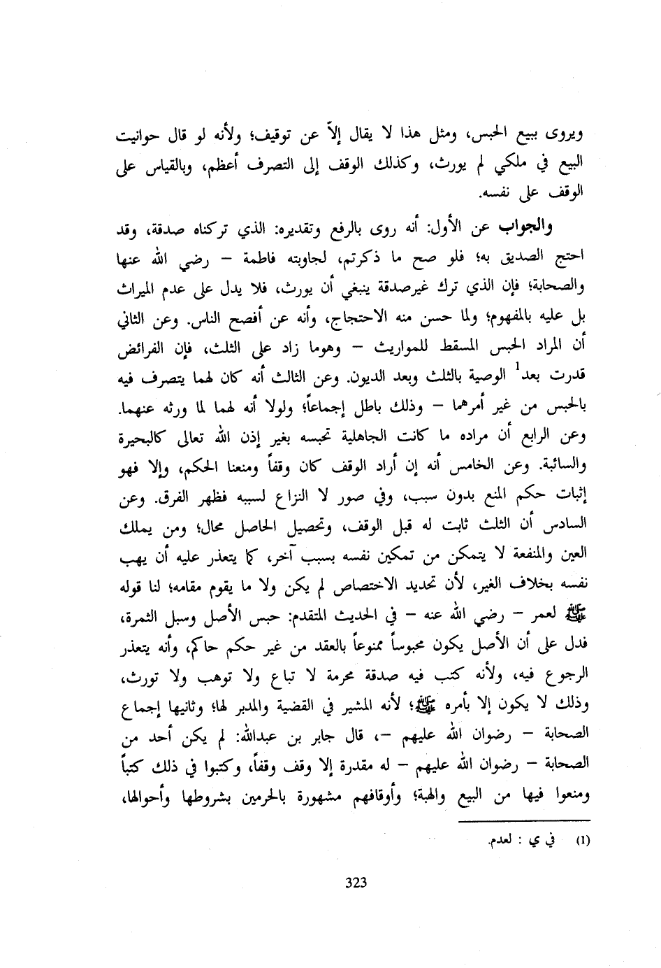 وَالْجَوَابُ عَنِ الْأَوَّلِ أَنَّهُ رُوِيَ بِالرَّفْعِ وَتَقْدِيرُهُ الَّذِي تَرَكْنَاهُ صَدَقَةٌ وَقَدِ احْتَجَّ الصِّدِّيقُ بِهِ فَلَوْ صَحَّ مَا ذَكَرْتُمْ لَجَاوَبَتْهُ فَاطِمَةُ - رَضِيَ اللَّهُ عَنْهَا وَالصَّحَابَةُ فَإِنَّ الَّذِي تَرَكَ غَيْرَ صَدَقَةٍ يَنْبَغِي أَنْ يُوَرَّثَ فَلَا يَدُلُّ عَلَى عَدَمِ الْمِيرَاثِ بَلْ عَلَيْهِ بِالْمَفْهُومِ وَلِمَا حَسُنَ مِنْهُ الِاحْتِجَاجُ وَأَنَّهُ عَنْ أَفْصَحِ النَّاسِ وَعَنِ الثَّانِي أَنَّ الْمُرَادَ الْحَبْسُ الْمُسْقِطُ لِلْمَوَارِيثِ - وَهُوَ مَا زَادَ عَلَى الثُّلُثِ فَإِنَّ الْفَرَائِضَ قُدِّرَتْ بَعْدَ الْوَصِيَّةِ بِالثُّلُثِ وَبَعْدَ الدُّيُونِ وَعَنِ الثَّالِثِ أَنَّهُ كَانَ لَهُمَا يَتَصَرَّفُ فِيهِ بِالْحَبْسِ مِنْ غَيْرِ أَمْرِهِمَا - وَذَلِكَ بَاطِلٌ إِجْمَاعًا وَلَوْلَا أَنَّهُ لَهُمَا لَمَا وَرِثَهُ عَنْهُمَا وَعَنِ الرَّابِعِ أَنَّ مُرَادَهُ مَا كَانَتِ الْجَاهِلِيَّةُ تَحْبِسُهُ بِغَيْرِ إِذْنِ اللَّهِ تَعَالَى كَالْبَحِيرَةِ وَالسَّائِبَةِ وَعَنِ الْخَامِسِ أَنَّهُ إِنْ أَرَادَ الْوَقْفَ كَانَ وَقْفًا وَمَنَعْنَا الْحُكْمَ وَإِلَّا فَهُوَ إِثْبَاتُ حُكْمِ الْمَنْعِ بِدُونِ سَبَب وَفِي صور لَا النِّزَاعِ لِسَبَبِهِ فَظَهَرَ الْفَرْقُ وَعَنِ السَّادِسِ أَنَّ الثُّلُثَ ثَابِتٌ لَهُ قَبْلَ الْوَقْفِ وَتَحْصِيلُ الْحَاصِلِ مُحَالٌ وَمَنْ يَمْلِكُ الْعَيْنَ وَالْمَنْفَعَةَ لَا يَتَمَكَّنُ مِنْ تَمْكِينِ نَفْسِهِ بِسَبَبٍ آخَرَ كَمَا يَتَعَذَّرُ عَلَيْهِ أَنْ يَهَبَ نَفْسَهُ بِخِلَافِ الْغَيْرِ لِأَنَّ تَحْدِيدَ الِاخْتِصَاصِ لَمْ يَكُنْ وَلَا مَا يَقُومُ مَقَامَهُ لَنَا قَوْلُهُ - صَلَّى اللَّهُ عَلَيْهِ وَسَلَّم َ - لِعُمَرَ - رَضِيَ اللَّهُ عَنْهُ - فِي الْحَدِيثِ الْمُتَقَدِّمِ حَبِّسِ الْأَصْلَ وَسَبِّلِ الثَّمَرَةَ فَدَلَّ عَلَى أَنَّ الْأَصْلَ يَكُونُ مَحْبُوسًا مَمْنُوعًا بِالْعَقْدِ مِنْ غَيْرِ حُكْمِ حَاكِمٍ وَأَنَّهُ يَتَعَذَّرُ الرُّجُوعُ فِيهِ وَلِأَنَّهُ كَتَبَ فِيهِ صَدَقَةٌ مُحَرَّمَةٌ لَا تُبَاعُ وَلَا تُوهَبُ وَلَا تُورَثُ وَذَلِكَ لَا يَكُونُ إِلَّا بأَمْره - صَلَّى اللَّهُ عَلَيْهِ وَسَلَّم َ - لِأَنَّهُ الْمُشِيرُ فِي الْقَضِيَّةِ وَالْمُدَبَّرُ لَهَا وَثَانِيهَا إِجْمَاعُ الصَّحَابَةِ - رِضْوَانُ اللَّهِ عَلَيْهِمْ - قَالَ جَابِرُ بْنُ عَبْدِ اللَّهِ لَمْ يَكُنْ أَحَدٌ مِنَ الصَّحَابَةِ - رِضْوَانُ اللَّهِ عَلَيْهِمْ - لَهُ مَقْدِرَةٌ إِلَّا وَقَفَ وَقْفًا وَكَتَبُوا فِي ذَلِكَ كُتُبًا وَمَنَعُوا فِيهَا مِنَ الْبَيْعِ وَالْهِبَةِ وَأَوْقَافُهُمْ مَشْهُورَةٌ بِالْحَرَمَيْنِ بشروطها وَأَحْوَالهَا