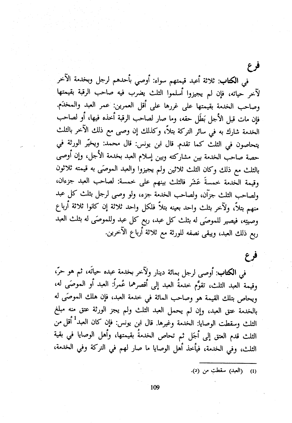 فِي الْكِتَابِ ثَلَاثَةُ أَعْبُدٍ قِيمَتُهُمْ سَوَاءٌ أوصى بأحدهم لرجل وبخدمة الْآخَرِ لِآخَرَ حَيَاتَهُ فَإِنْ لَمْ يُجِيزُوا أَسْلَمُوا الثُّلُثَ يَضْرِبُ فِيهِ صَاحِبُ الرَّقَبَةِ بِقِيمَتِهَا وَصَاحِبُ الْخِدْمَةِ بِقِيمَتِهَا عَلَى غَرَرِهَا عَلَى أَقَلِّ الْعُمْرَيْنِ عُمْرِ الْعَبْدِ وَالْمُخْدَمِ فَإِنْ مَاتَ قَبْلَ الْأَجَلِ بَطَلَ حَقُّهُ وَمَا صَارَ لِصَاحِبِ الرَّقَبَةِ أَخَذَهُ فِيهَا أَوْ لِصَاحِبِ الْخِدْمَةِ شَارَكَ بِهِ فِي سَائِرِ التَّرِكَةِ بَتْلًا وَكَذَلِكَ إِنْ وَصَّى مَعَ ذَلِك الآخر بِالثُّلثِ يتحاصون فِي الثُّلُث كَمَا تَقَدَّمَ قَالَ ابْنُ يُونُسَ قَالَ مُحَمَّدٌ وَيُخَيَّرُ الْوَرَثَةُ فِي حِصَّةِ صَاحِبِ الْخِدْمَةِ بَيْنَ مُشَارَكَتِهِ وَبَيْنَ إِسْلَامِ الْعَبْدِ بِخِدْمَةِ الْأَجَلِ وَإِنْ أَوْصَى بِالثُّلُثِ مَعَ ذَلِكَ وَكَانَ الثُّلُثُ ثَلَاثِينَ وَلَمْ يُجِيزُوا وَالْعَبْدُ الْمُوصَى بِهِ قِيمَتُهُ ثَلَاثُونَ وَقِيمَةُ الْخِدْمَةِ خَمْسَةَ عَشَرَ فَالثُّلُثُ بَيْنَهُمْ عَلَى خَمْسَة لصَاحب العَبْد جزءان وَلِصَاحِب الثُّلُث جزآن وَلِصَاحِبِ الْخِدْمَةِ جُزْءٌ وَلَوْ وَصَّى لِرَجُلٍ بِثُلُثِ كُلِّ عَبْدٍ مِنْهُمْ بَتْلًا وَلِآخَرَ بِثُلُثٍ وَاحِدٍ بِعَيْنِهِ بَتْلًا فَلِكُلِّ وَاحِدٍ ثَلَاثَةٌ إِنْ كَانُوا ثَلَاثَةَ أَرْبَاعِ وَصِيَّتِهِ فَيَصِيرُ لِلْمُوصَى لَهُ بِثُلُثِ كُلِّ عَبْدٍ رُبُعُ كُلِّ عَبْدٍ وَلِلْمُوصَى لَهُ بِثُلُثِ الْعَبْدِ رُبُعُ ذَلِكَ الْعَبْدِ وَيَبْقَى نِصْفُهُ لِلْوَرَثَةِ مَعَ ثَلَاثَةِ أَرْبَاعِ الْآخَرِينَ