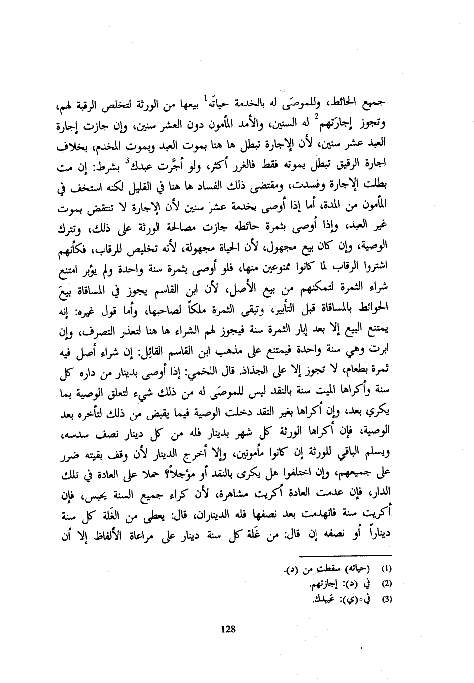 جَمِيعُ الْحَائِطِ وَلِلْمُوصَى لَهُ بِالْخِدْمَةِ حَيَاتَهُ بَيْعُهَا من الْوَرَثَة لتخلص الرَّقَبَة لَهُم وَتجوز اجارتهم لَهُ السِّنِينَ وَالْأَمَدَ الْمَأْمُونَ دُونَ الْعَشْرِ سِنِينَ وَإِنْ جَازَتْ إِجَارَةُ الْعَبْدِ عَشْرَ سِنِينَ لِأَنَّ الْإِجَارَة تبطل هَاهُنَا بِمَوْتِ الْعَبْدِ وَبِمَوْتِ الْمُخْدَمِ بِخِلَافِ إِجَارَةِ الرَّقِيقِ تبطل بِمَوْتِهِ فَقَط فلغرر أَكْثَرُ وَلَوْ أَجَّرْتَ عَبْدَكَ بِشَرْطٍ إِنْ مُتُّ بطلت الاجارة وفسدت وَمُقْتَضى ذَلِك الْفساد هَاهُنَا فِي الْقَلِيلِ لَكِنَّهُ اسْتَخَفَّ فِي الْمَأْمُونِ مِنَ الْمُدَّةِ أَمَّا إِذَا أَوْصَى بِخِدْمَةِ عَشْرِ سِنِينَ لِأَنَّ الْإِجَارَةَ لَا تَنْتَقِضُ بِمَوْتِ غَيْرِ الْعَبْدِ وَإِذَا أَوْصَى بِثَمَرَةِ حَائِطِهِ جَازَتْ مُصَالَحَةُ الْوَرَثَةِ عَلَى ذَلِكَ وَتُتْرَكُ الْوَصِيَّةُ وَإِنْ كَانَ بَيْعَ مَجْهُولٍ لِأَنَّ الْحَيَاةَ مَجْهُولَةٌ لِأَنَّهُ تَخْلِيصٌ لِلرِّقَابِ فَكَأَنَّهُمُ اشْتَرَوُا الرِّقَابَ لَمَّا كَانُوا مَمْنُوعِينَ مِنْهَا فَلَو أوصى بثمرة سنة وَاحِدَة وَلم يؤبر امْتَنَعَ شِرَاءُ الثَّمَرَةِ لِتَمَكُّنِهِمْ مِنْ بَيْعِ الْأَصْلِ لِأَن أبن الْقَاسِم يُجَوِّزُ فِي الْمُسَاقَاةِ بَيْعَ الْحَوَائِطِ بِالْمُسَاقَاةِ قَبْلَ التَّأْبِيرِ وَتَبْقَى الثَّمَرَةُ مِلْكًا لِصَاحِبِهَا وَأَمَّا قَوْلُ غَيْرِهِ إِنَّهُ يَمْتَنِعُ الْبَيْعُ إِلَّا بَعْدَ إِبَارِ الثَّمَرَة سنة فَيجوز لَهُم الشِّرَاء هَاهُنَا لِتَعَذُّرِ التَّصَرُّفِ وَإِنْ أُبِّرَتْ وَهِيَ سَنَةٌ وَاحِدَةٌ فَيَمْتَنِعُ عَلَى مَذْهَبِ ابْنِ الْقَاسِمِ الْقَائِلِ إِنَّ شِرَاء اصل فِيهِ ثمرو بِطَعَام وَلَا تَجُوزُ إِلَّا عَلَى الْجِذَاذِ قَالَ اللَّخْمِيُّ إِذَا أَوْصَى بِدِينَارٍ مِنْ دَارِهِ كُلَّ سَنَةٍ وَأَكَرَاهَا الْمَيِّتُ سَنَةً بِالنَّقْدِ لَيْسَ لِلْمُوصَى لَهُ مِنْ ذَلِكَ شَيْءٌ لِتَعَلُّقِ الْوَصِيَّةِ بِمَا يُكْرَى بَعْدُ وَإِنْ أَكْرَاهَا بِغَيْرِ النَّقْدِ دَخَلَتِ الْوَصِيَّةُ فِيمَا يَقْبِضُ مِنْ ذَلِكَ لِتَأَخُّرِهِ بَعْدَ الْوَصِيَّةِ فَإِنْ أَكْرَاهَا الْوَرَثَةُ كُلَّ شَهْرٍ بِدِينَارٍ فَلَهُ مِنْ كُلِّ دِينَارٍ نِصْفُ سُدُسِهِ وَيُسَلِّمُ الْبَاقِيَ لِلْوَرَثَةِ إِنْ كَانُوا مَأْمُونِينَ وَإِلَّا أَخْرَجَ الدِّينَارَ لِأَنَّ وَقْفَ بَقِيَّتِهِ ضَرَرٌ عَلَى جَمِيعِهِمْ وَإِنِ اخْتَلَفُوا هَلْ يُكْرَى بِالنَّقْدِ أَوْ مُؤَجَّلًا حَمْلًا عَلَى الْعَادَةِ فِي تِلْكَ الدَّارِ فَإِنْ عُدِمَتِ الْعَادَةُ أُكْرِيَتْ مُشَاهَرَةً لِأَنَّ كِرَاءَ جَمِيعِ السَّنَةِ يُحْبَسُ فَإِنْ أُكْرِيَتْ سَنَةً فَانْهَدَمَتْ بَعْدَ نِصْفِهَا فَلَهُ الدينارإن قَالَ يُعْطَى مِنَ الْغَلَّةِ كُلَّ سَنَةٍ دِينَارًا أَو نصفه إِن قَالَ مِنْ غَلَّةٍ كُلِّ سَنَةٍ دِينَارٌ عَلَى مُرَاعَاةِ الْأَلْفَاظِ إِلَّا أَنْ