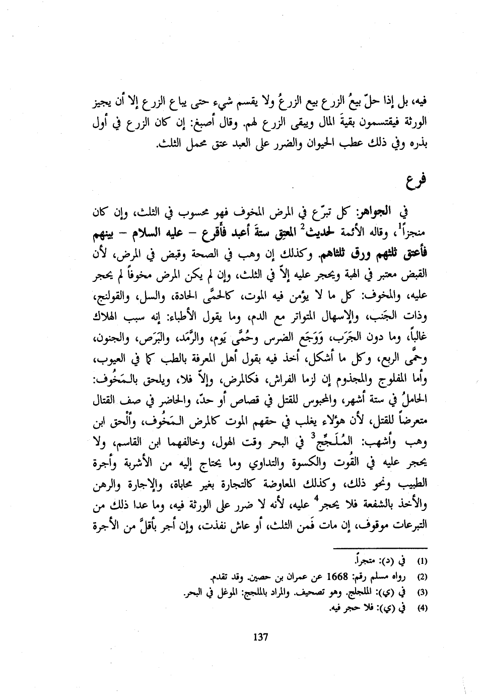 فِي الْجَوَاهِرِ كُلُّ تَبَرُّعٍ فِي الْمَرَضِ الْمَخُوفِ فَهُوَ مَحْسُوبٌ فِي الثُّلُثِ وَإِنْ كَانَ مُنْجِزًا وَقَالَهُ الْأَئِمَّةُ لِحَدِيثِ الْمُعْتِقِ سِتَّةَ أعبد فأقرع - صَلَّى اللَّهُ عَلَيْهِ وَسَلَّم َ - بَيْنَهُمْ فَأُعْتِقَ ثُلُثُهُمْ وَرُقَّ ثُلُثَاهُمْ وَكَذَلِكَ إِنْ وَهَبَ فِي الصِّحَّةِ وَقَبَضَ فِي الْمَرَضِ لِأَنَّ الْقَبْضَ مُعْتَبَرٌ فِي الْهِبَةِ وَيُحْجَرُ عَلَيْهِ إِلَّا فِي الثُّلُثِ وَإِنْ لَمْ يَكُنِ الْمَرَضُ مَخُوفًا لَمْ يَحْجُرْ عَلَيْهِ وَالْمَخُوفُ كُلُّ مَا لَا يُؤمن فِيهِ الْمَوْت كالحمى الْحَادَّةِ وَالسُّلِّ وَالْقُولَنْجِ وَذَاتِ الْجَنْبِ وَالْإِسْهَالِ الْمُتَوَاتِرِ مَعَ الدَّمِ وَمَا يَقُولُ الْأَطِبَّاءُ إِنَّهُ سَبَبُ الْهَلَاكِ غَالِبًا وَمَا دُونَ الْجَرَبِ وَوَجِعِ الضِّرْسِ وَحُمَّى يَوْمٍ وَالرَّمَدِ وَالْبَرَصِ وَالْجُنُونِ وَحُمَّى الرِّبْعِ وَكُلِّ مَا أَشْكَلَ أَخَذَ فِيهِ بِقَوْلِ أَهْلِ الْمَعْرِفَةِ بِالطِّبِّ كَمَا فِي الْعُيُوبِ وَأَمَّا الْمَفْلُوجُ وَالْمَجْذُومُ إِنْ لَزِمَا الْفِرَاشَ فَكَالْمَرَضِ وَإِلَّا فَلَا وَيلْحق بلمخوف الْحَامِلُ فِي سِتَّةِ أَشْهُرٍ وَالْمَحْبُوسُ لِلْقَتْلِ فِي قِصَاصٍ أَوْ حَدٍّ وَالْحَاضِرُ فِي صَفِّ الْقِتَالِ مُتَعَرِّضًا لِلْقَتْلِ لِأَنَّ هَؤُلَاءِ يَغْلِبُ فِي حَقِّهِمُ الْمَوْتُ كَالْمَرَضِ الْمَخُوفِ وَأَلْحَقَ ابْنُ وَهْبٍ وَأَشْهَبُ الْمُلَجِّجُ فِي الْبَحْرِ وَقْتَ الْهَوْلِ وَخَالَفَهُمَا ابْنُ الْقَاسِمِ وَلَا يُحْجَرُ عَلَيْهِ فِي الْقُوتِ وَالْكُسْوَةِ وَالتَّدَاوِي وَمَا يَحْتَاجُ إِلَيْهِ مِنَ الْأَشْرِبَةِ وَأُجْرَةِ الطَّبِيبِ وَنَحْوِ ذَلِكَ وَكَذَلِكَ الْمُعَاوَضَةُ كَالتِّجَارَةِ بِغَيْرِ محاباه إلاجارة وَالرَّهْنُ وَالْأَخْذُ بِالشُّفْعَةِ فَلَا يُحْجَرُ عَلَيْهِ لِأَنَّهُ لَا ضَرَر على الْوَرَثَة فِيهِ وَمَا عدا ذَلِك من التَّبَرُّعَات مَوْقُوف وَإِن مَاتَ فَمِنَ الثُّلُثِ أَوْ عَاشَ نَفَذَتْ وَإِنْ أَجَّرَ بِأَقَلَّ مِنَ الْأُجْرَةِ