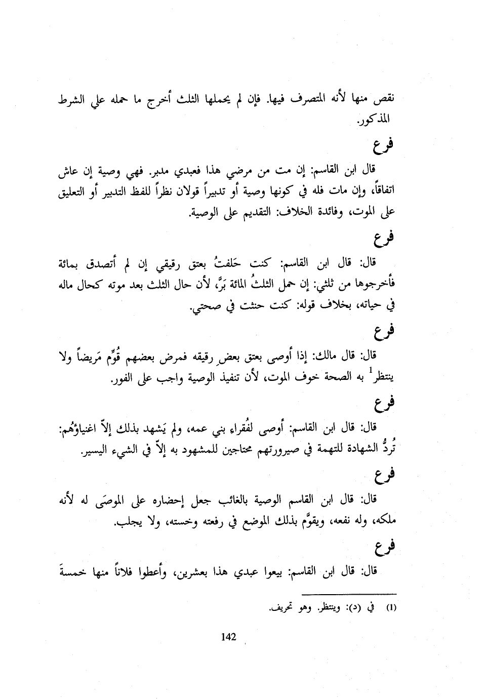 قَال قَال ابْنُ الْقَاسِمِ الْوَصِيَّةُ بِالْغَائِبِ جُعِلَ إِحْضَارُهُ عَلَى الْمُوصَى لَهُ لِأَنَّهُ مِلْكُهُ وَلَهُ نَفْعُهُ وَيُقَوَّمُ بِذَلِكَ الْمَوْضِعِ فِي رِفْعَتِهِ وَخِسَّتِهِ وَلَا يُجْلَبُ