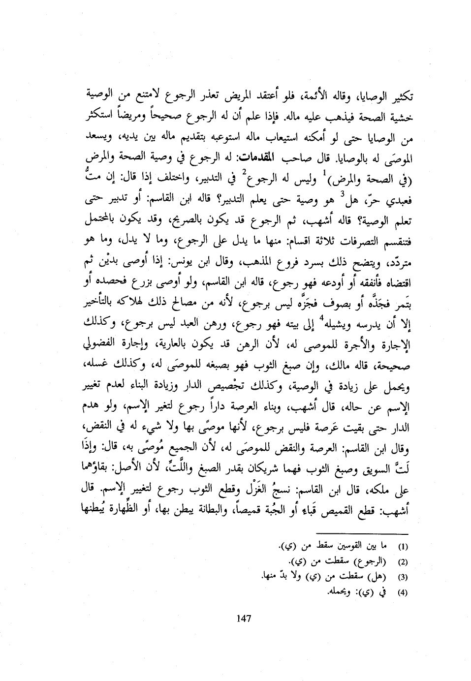 تَكْثِيرِ الْوَصَايَا وَقَالهُ الْأَئِمَّةُ فَلَوِ اعْتَقَدَ الْمَرِيضُ تَعَذُّرَ الرُّجُوعِ لَامْتَنَعَ مِنَ الْوَصِيَّةِ خَشْيَةَ الصِّحَّةِ فَيَذْهَبُ عَلَيْهِ مَالُهُ فَإِذَا عَلِمَ أَنَّ لَهُ الرُّجُوعَ صَحِيحًا وَمَرِيضًا اسْتَكْثَرَ مِنَ الْوَصَايَا حَتَّى لَوْ أَمْكَنَهُ اسْتِيعَابُ مَالِهِ اسْتَوْعَبَهُ بِتَقْدِيمِ مَالِهِ بَيْنَ يَدَيْهِ وَيَسْعَدُ الْمُوصَى لَهُ بِالْوَصَايَا قَال صَاحِب الْمُقَدِّمَات لَهُ الرُّجُوعُ فِي وَصِيَّةِ الصِّحَّةِ وَالْمَرَض فِي الصِّحَّةِ وَالْمَرَضِ وَلَيْسَ لَهُ الرُّجُوعُ فِي التَّدْبِيرِ وَاخْتُلِفَ إِذَا قَال إِنْ مُتُّ فَعَبْدِي حُرٌّ هَلْ هُوَ وَصِيَّةٌ حَتَّى يُعْلَمَ التَّدْبِيرُ قَالهُ ابْنُ الْقَاسِمِ أَوْ تَدْبِيرٌ حَتَّى تُعْلَمَ الْوَصِيَّةُ قَالهُ أَشْهَب ثُمَّ الرُّجُوعُ قَدْ يَكُونُ بِالصَّرِيحِ وَقد يكون بالمحتمل فتقسم التَّصَرُّفَاتُ ثَلَاثَةَ أَقْسَامٍ مِنْهَا مَا يَدُلُّ عَلَى الرُّجُوعِ وَمَا لَا يَدُلُّ وَمَا هُوَ مُتَرَدِّدٌ وَيَتَّضِحُ ذَلِكَ بِسَرْدِ فِرُوعِ الْمَذْهَبِ وَقَال ابْنُ يُونُسَ إِذَا أَوْصَى بِدَيْنٍ ثُمَّ اقْتَضَاهُ فَأَنْفَقَهُ أَوْ أَوْدَعَهُ فَهُوَ رُجُوعٌ قَالهُ ابْنُ الْقَاسِمِ وَلَو أوصى بزرع فحصده أَو بِتَمْر فجذه أَوْ بِصُوفٍ فَجَزَّهُ لَيْسَ بِرُجُوعٍ لِأَنَّهُ مِنْ مَصَالِحِ ذَلِكَ لِهَلَاكِهِ بِالتَّأْخِيرِ إِلَّا أَنْ يَدْرُسَهُ وَيَشِيلَهُ إِلَى بَيْتِهِ فَهُوَ رُجُوعٌ وَرَهْنُ الْعَبْدِ لَيْسَ بِرُجُوعٍ وَكَذَلِكَ الْإِجَارَةُ وَالْأُجْرَةُ لِلْمُوصَى لَهُ لِأَنَّ الرَّهْنَ قَدْ يَكُونُ بِالْعَارِيَةِ وَإِجَارَةُ الْفُضُولِيِّ صَحِيحَةٌ قَالهُ مَالِك وَإِنْ صَبَغَ الثَّوْبَ فَهُوَ بِصِبْغِهِ لِلْمُوصَى لَهُ وَكَذَلِكَ غَسْلُهُ وَيُحْمَلُ عَلَى زِيَادَةٍ فِي الْوَصِيَّةِ وَكَذَلِكَ تَجْصِيصُ الدَّارِ وَزِيَادَةُ الْبِنَاءِ لِعَدَمِ تَغْيِيرِ الِاسْمِ عَنْ حَالِهِ قَال أَشْهَب وَبِنَاءُ الْعَرْصَةِ دَارًا رُجُوعٌ لِتَغْيِيرِ الِاسْمِ وَلَوْ هَدَمَ الدَّارَ حَتَّى بَقِيَتْ عَرْصَةً فَلَيْسَ بِرُجُوعٍ لِأَنَّهَا مُوصًى بِهَا وَلَا شَيْءَ لَهُ فِي النَّقْض وَقَالَ ابْن الْقَاسِم الْعَرَصَة وَالنَّقْص لِلْمُوصَى لَهُ لِأَنَّ الْجَمِيعَ مُوصًى بِهِ قَال وَإِذَا لَتَّ السَّوِيقَ وَصَبَغَ الثَّوْبَ فَهُمَا شَرِيكَانِ بِقَدْرِ الصَّبْغِ وَاللَّتِّ لِأَنَّ الْأَصْلَ بَقَاؤُهُمَا عَلَى مِلْكِهِ قَال ابْنُ الْقَاسِمِ نَسْجُ الْغَزْلِ وَقَطْعُ الثَّوْبِ رُجُوعٌ لِتَغْيِيرِ الِاسْمِ قَال أَشْهَب قَطْعُ الْقَمِيصِ قَبَاءً أَوِ الْجُبَّةِ قَمِيصًا وَالْبِطَانَةُ يُبَطَّنُ بِهَا أَوِ الظِّهَارَةُ يُبَطِّنُهَا