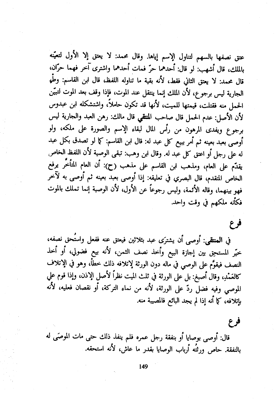 عتق نصفهَا بِالسَّهْمِ لتناول الِاسْم اياها وَقَال مُحَمَّدٌ لَا يُعْتَقُ إِلَّا الْأَوَّلُ لِتَعَيُّنِهِ بِالْمِلْكِ قَال أَشْهَب لَوْ قَال أَحَدُهُمَا حُرٌّ فَمَاتَ أَحَدُهُمَا وَاشْتَرَى آخَرَ فَهُمَا حُرَّانِ قَال مُحَمَّد لَا يُعْتَقُ الثَّانِي فَقَطْ لِأَنَّهُ بَقِيَّةُ مَا تَنَاوَلَهُ اللَّفْظُ قَال ابْنُ الْقَاسِمِ وَطْءُ الْجَارِيَةِ لَيْسَ بِرُجُوعٍ لِأَنَّ الْمِلْكَ إِنَّمَا يَنْتَقِلُ عِنْدَ الْمَوْتِ فَإِذا وقفت بَعْدَ الْمَوْتِ لِتَبَيُّنِ الْحَمْلِ مِنْهُ فَقُتِلَتْ قِيمَتُهَا للْمَيت لِأَنَّهَا قد تكون حَامِلا واشتشكله ابْنُ عَبْدُوسٍ لِأَنَّ الْأَصْلَ عَدَمُ الْحَمْلِ قَال صَاحِب الْمُنْتَقَى قَال مَالِك رَهْنُ الْعَبْدِ وَالْجَارِيَةِ لَيْسَ بِرُجُوعٍ وَيُفْدَى الْمَرْهُونُ مِنْ رَأْسِ الْمَالِ لِبَقَاءِ الِاسْمِ وَالصُّورَةِ عَلَى مِلْكِهِ وَلَوْ أَوْصَى بِعَبْدٍ بِعَيْنِهِ ثُمَّ أَمَرَ بِبَيْعِ كُلِّ عَبْدٍ لَهُ قَال ابْنُ الْقَاسِمِ كَمَا لَوْ تَصَدَّقَ بِكُلِّ عَبْدٍ لَهُ عَلَى رَجُلٍ أَوْ أَعْتَقَ كُلَّ عَبْدٍ لَهُ وَقَال ابْنُ وَهْب تَبْقَى الْوَصِيَّةُ لِأَنَّ اللَّفْظَ الْخَاصَّ يُقَدَّمُ عَلَى الْعَامِّ وَمَذْهَبُ ابْنِ الْقَاسِمِ عَلَى مَذْهَبِ ح أَنَّ الْعَامَّ الْمُتَأَخِّرَ يَرْفَعُ الْخَاصَّ الْمُتَقَدِّمَ قَال الْبَصْرِيُّ فِي تَعْلِيقِهِ إِذَا أَوْصَى بِعَبْدٍ بِعَيْنِهِ ثُمَّ أَوْصَى بِهِ لِآخَرَ فَهُوَ بَيْنَهُمَا وَقَالهُ الْأَئِمَّةُ وَلَيْسَ رُجُوعًا عَنِ الْأَوَّلِ لِأَنَّ الْوَصِيَّةَ إِنَّمَا تُمْلَكُ بِالْمَوْتِ فَكَأَنَّهُ مَلَكَهُمْ فِي وَقْتٍ وَاحِدٍ