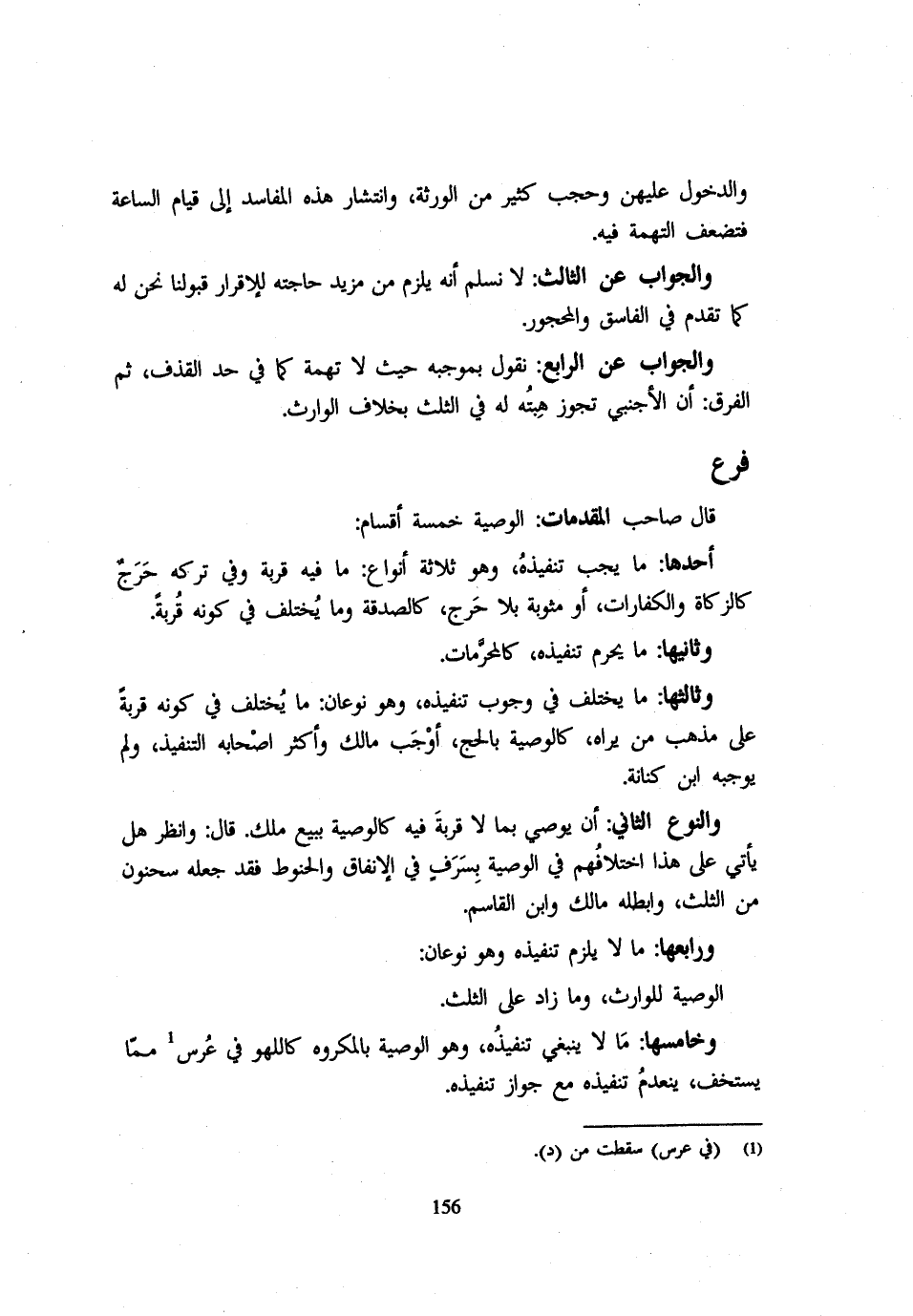 قَال صَاحِب الْمُقَدِّمَات الْوَصِيَّةُ خَمْسَةُ أَقْسَامٍ أَحَدُهَا مَا يَجِبُ تَنْفِيذُهُ وَهُوَ ثَلَاثَةُ أَنْوَاعٍ مَا فِيهِ قربَة وَفِي تَرْكِهِ حَرَجٌ كَالزَّكَاةِ وَالْكَفَّارَاتِ أَوْ مَثُوبَةٌ بِلَا حَرَجٍ كَالصَّدَقَةِ وَمَا يُخْتَلَفُ فِي كَوْنِهِ قُرْبَةً وَثَانِيهَا مَا يَحْرُمُ تَنْفِيذُهُ كَالْمُحَرَّمَاتِ وَثَالِثُهَا مَا يُخْتَلَفُ فِي وُجُوبِ تَنْفِيذِهِ وَهُوَ نَوْعَانِ مَا يُخْتَلَفُ فِي كَوْنِهِ قُرْبَةً عَلَى مَذْهَبِ مَنْ يَرَاهُ كَالْوَصِيَّةِ بِالْحَجِّ أَوْجَبَ مَالِك وَأَكْثَرُ أَصْحَابِهِ التَّنْفِيذَ وَلَمْ يُوجِبْهُ ابْنُ كِنَانَةَ وَالنَّوْعُ الثَّانِي أَنْ يُوصِيَ بِمَا لَا قُرْبَةَ فِيهِ كَالْوَصِيَّةِ بِبَيْعِ مِلْكٍ قَال وَانْظُرْ هَلْ يَأْتِي عَلَى هَذَا اخْتِلَافُهُمْ فِي الْوَصِيَّةِ بِسَرَفٍ فِي الإتفاق وَالْحَنُوطِ فَقَدْ جَعَلَهُ سَحْنُون مِنَ الثُّلُثِ وَأَبْطَلَهُ مَالِك وَابْنُ الْقَاسِمِ وَرَابِعُهَا مَا لَا يَلْزَمُ تَنْفِيذُهُ وَهُوَ نَوْعَانِ الْوَصِيَّةُ لِلْوَارِثِ وَمَا زَادَ على الثُّلُث وخامسها لَا يَنْبَغِي تَنْفِيذُهُ وَهُوَ الْوَصِيَّةُ بِالْمَكْرُوهِ كَاللَّهْوِ فِي عرس مِمَّا يستخف يَنْعَدِم تَنْفِيذُهُ مَعَ جَوَازِ تَنْفِيذِهِ