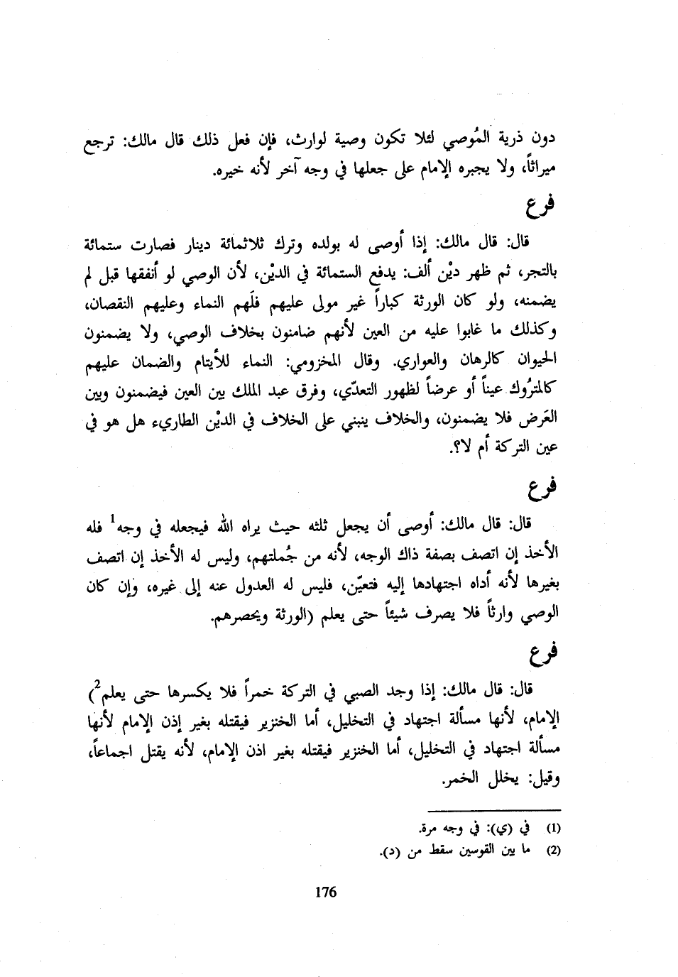 قَال قَال مَالِك إِذَا أَوْصَى لَهُ بِوَلَدِهِ وَتَرَكَ ثَلَاثَمِائَةِ دِينَارٍ فَصَارَتْ سِتَّمِائَةٍ بِالتَّجْرِ ثُمَّ ظَهَرَ دَيْنٌ أَلْفٌ يَدْفَعُ السِّتَّمِائَةِ فِي الدَّيْنِ لِأَنَّ الْوَصِيَّ لَوْ أنفقها قبل لَمْ يَضْمَنْهُ وَلَوْ كَانَ الْوَرَثَةُ كِبَارًا غَيْر مُوَلًّى عَلَيْهِمْ فَلَهُمُ النَّمَاءُ وَعَلَيْهِمُ النُّقْصَانُ وَكَذَلِكَ مَا غَابُوا عَلَيْهِ مِنَ الْعَيْنِ لِأَنَّهُمْ ضَامِنُونَ بِخِلَاف الْوَصِيّ وَلَا يضمون الْحَيَوَان كالرهان والعواري وَقَالَ الْمَخْزُومِيُّ النَّمَاءُ لِلْأَيْتَامِ وَالضَّمَانُ عَلَيْهِمْ كَالْمَتْرُوكِ عَيْنًا أَوْ عَرَضًا لِظُهُورِ التَّعَدِّي وَفَرَّقَ عَبْدُ الْمَلِكِ بَيْنَ الْعَيْنِ فَيُضَمَّنُونَ وَبَيْنَ الْعَرَضِ فَلَا يُضَمَّنُونَ وَالْخلاف يَنْبَنِي على الْخلاف فِي الدّين الطاريء هَلْ هُوَ فِي عَيْنِ التَّرِكَةِ أَمْ لَا
