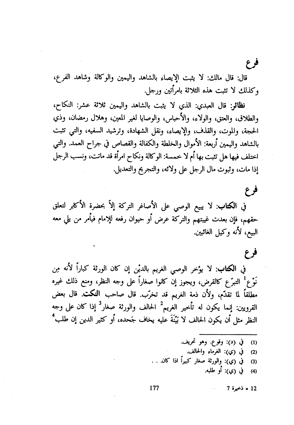 قَال قَال مَالِك لَا يَثْبُتُ الْإِيصَاءُ بِالشَّاهِدِ وَالْيَمِينِ وَالْوَكَالَةِ وَشَاهِدِ الْفَرْعِ وَكَذَلِكَ لَا تَثْبُتُ هَذِهِ الثَّلَاثَةُ بِامْرَأَتَيْنِ وَرَجُلٍ نَظَائِرُ قَال الْعَبْدِيُّ الَّذِي لَا يَثْبُتُ بِالشَّاهِدِ وَالْيَمِينِ ثَلَاثَةَ عَشَرَ النِّكَاحُ وَالطَّلَاقُ وَالْعِتْقُ وَالْوَلَاءُ وَالْأَحْبَاسُ وَالْوَصَايَا لِغَيْر الْمُعَيَّنِ وَهِلَالُ رَمَضَانَ وَذِي الْحِجَّةِ وَالْمَوْتُ وَالْقَذْفُ وَالْإِيصَاءُ وَنَقْلُ الشَّهَادَةِ وَتَرْشِيدُ السَّفِيهِ وَالَّتِي تَثْبُتُ بِالشَّاهِدِ وَالْيَمِينِ أَرْبَعَةٌ الْأَمْوَالُ وَالْخُلْطَةُ وَالْكَفَالَةُ وَالْقَصَاصُ فِي جِرَاحِ الْعَمْدِ وَالَّتِي اخْتُلِفَ فِيهَا هَلْ تَثْبُتُ بِهَا أَمْ لَا خَمْسَةٌ الْوَكَالَةُ وَنِكَاح امْرَأَة قد مَاتَت وَنسب الرجل إِذا مَاتَ وَثُبُوتُ مَالِ الرَّجُلِ عَلَى وَلَائِهِ وَالتَّجْرِيحُ وَالتَّعْدِيلُ