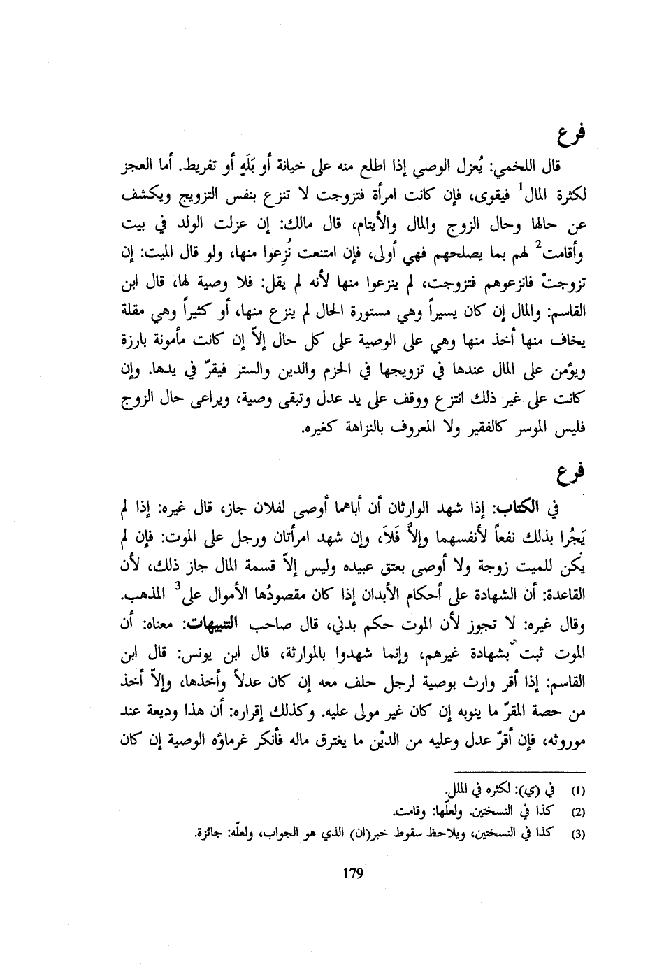 قَالَ اللَّخْمِيّ يعْزل الْوَصِيّ إِذا طلع مِنْهُ عَلَى خِيَانَةٍ أَوْ بَلَهٍ أَوْ تَفْرِيطٍ أَمَّا الْعَجْزُ لِكَثْرَةِ الْمَالِ فَيَقْوَى فَإِنْ كَانَتِ أمراة تزوجت لَا تُنْزَعُ بِنَفْسِ التَّزْوِيجِ وَيُكْشَفُ عَنْ حَالِهَا وَحَالِ الزَّوْجِ وَالْمَالِ وَالْأَيْتَامِ قَال مَالِك إِنْ عزلت الْوَلَد فِي بَيت وأقامت لَهُمْ بِمَا يُصْلِحُهُمْ فَهِيَ أَوْلَى فَإِنِ امْتَنَعَتْ نَزَعُوا مِنْهَا وَلَوْ قَال الْمَيِّتُ إِنْ تَزَوَّجَتْ فانزعوهم فَتَزَوَّجَتْ لَمْ يَنْزِعُوا مِنْهَا لِأَنَّهُ لَمْ يَقُلْ فَلَا وَصِيَّة لَهَا قَال ابْنُ الْقَاسِمِ وَالْمَالُ إِنْ كَانَ يَسِيرا وَهِي مستورة الْحَال لم ينْزع فِيهَا أَوْ كَثِيرًا وَهِيَ مُقِلَّةٌ يُخَافُ مِنْهَا أُخِذَ مِنْهَا وَهِيَ عَلَى الْوَصِيَّةِ عَلَى كُلِّ حَالٍ إِلَّا إِن كَانَت مأمونه بارزة وَيُؤْمَنُ عَلَى الْمَالِ عِنْدَهَا فِي تَزْوِيجِهَا فِي الْحَزْمِ وَالدَّيْنِ وَالسِّتْرِ فَيُقَرُّ فِي يَدِهَا وَإِنْ كَانَتْ عَلَى غَيْر ذَلِكَ انْتُزِعَ وَوُقِفَ عَلَى يَدِ عَدْلٍ وَتَبَقَى وَصِيَّةً وَيُرَاعَى حَالُ الزَّوْجِ فَلَيْسَ الْمُوسِرُ كَالْفَقِيرِ وَلَا الْمَعْرُوفُ بِالنَّزَاهَةِ كَغَيْرهِ