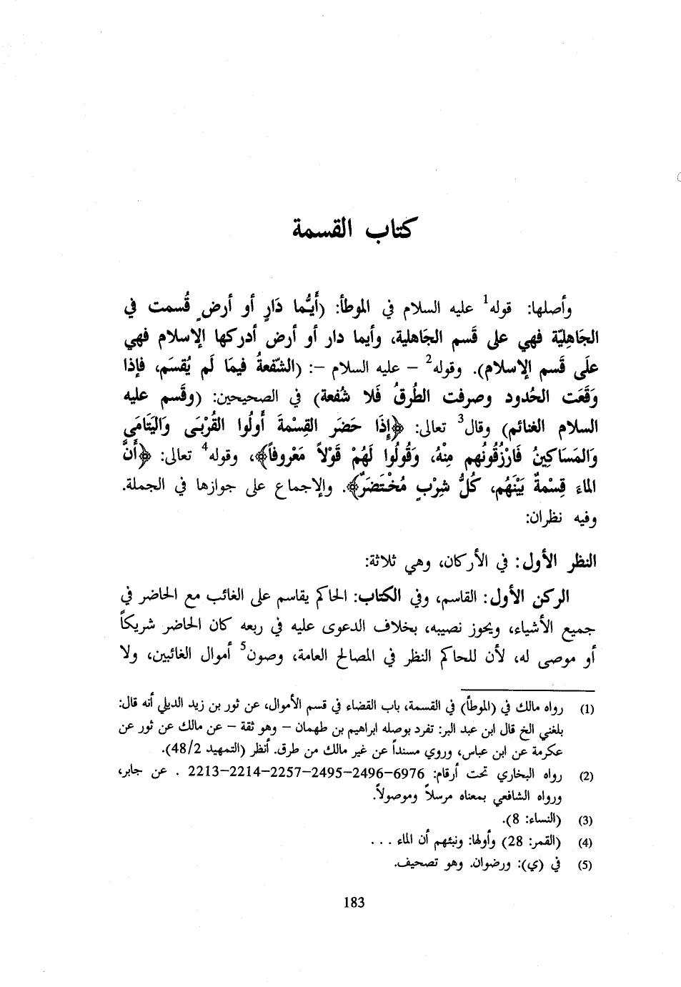 وَأَصلهَا قَوْله - صَلَّى اللَّهُ عَلَيْهِ وَسَلَّم َ - فِي الْمُوَطَّأ أَيّمَا دَار أَو أَرض قسمت فِي الْجَاهِلِيَّةِ فَهِيَ عَلَى قَسْمِ الْجَاهِلِيَّةِ وَأَيُّمَا دَار أَو ارْض ادركها الْإِسْلَام فَهِيَ على قسم الْإِسْلَام وَقَوله - صَلَّى اللَّهُ عَلَيْهِ وَسَلَّم َ - الشُّفْعَةُ فِيمَا لَمْ يُقْسَمْ فَإِذَا وَقَعَتِ الْحُدُودُ وَصُرِفَتِ الطُّرُقُ فَلَا شُفْعَةَ فِي الصَّحِيحَيْنِ وَقَسَمَ - صَلَّى اللَّهُ عَلَيْهِ وَسَلَّم َ - الْغَنَائِم وَقَالَ تَعَالَى {إِذا حضر الْقِسْمَة أولُوا الْقُرْبَى واليتامى وَالْمَسَاكِين فارزقونهم مِنْهُ وَقُولُوا لَهُم قولا مَعْرُوفا} وقَوْله تَعَالَى {أَنَّ الْمَاءَ قِسْمَةٌ بَيْنَهُمْ كُلُّ شرب مُخْتَصر} والاجماع على جَوَازهَا فِي الْجُمْلَة} وَفِيهِ نَظَرَانِ النَّظَرُ الْأَوَّلُ فِي الْأَرْكَانِ وَهِيَ ثَلَاثَةٌ الرُّكْنُ الْأَوَّلُ الْقَاسِمُ وَفِي الْكِتَابِ الْحَاكِمُ يقاسم عل الْغَائِب مَعَ الْحَاضِر فِي جَمِيع الاشياء وَيجوز نَصِيبُهُ بِخِلَافِ الدَّعْوَى عَلَيْهِ فِي رُبُعِهِ كَانَ الْحَاضِرُ شَرِيكًا أَوْ مُوصًى لَهُ لِأَنَّ لِلْحَاكِمِ النَّظَرَ فِي الْمَصَالِحِ الْعَامَّةِ وَصَوْنَ أَمْوَالِ الْغَائِبِينَ وَلَا