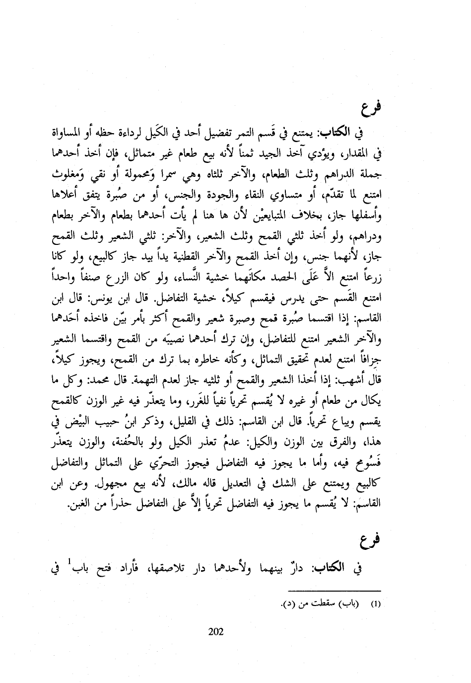 فِي الْكِتَابِ يُمْتَنَعُ فِي قَسْمِ التَّمْرِ تَفْضِيلُ أَحَدٍ فِي الْكَيْلِ لِرَدَاءَةِ حَظِّهِ أَوِ المساواه فِي الْمِقْدَار وَلَا يُؤَدِّي آخِذُ الْجَيِّدِ ثَمَنًا لِأَنَّهُ بَيْعُ طَعَامٍ غَيْر مُتَمَاثِلٍ فَإِنْ أَخَذَ أَحَدُهُمَا جُمْلَةَ الدَّرَاهِمِ وَثُلُثَ الطَّعَام وَالْآخر ثُلُثَاهُ وَهِي سمرا وَمَحْمُولَةٌ أَوْ نَقِيٌّ وَمَغْلُوثٌ امْتَنَعَ لِمَا تَقَدَّمَ أَوْ مُتَسَاوِي النَّقَاءِ وَالْجَوْدَةِ وَالْجِنْسِ أَوْ مِنْ صبرَة ينْفق أَعْلَاهَا وَأَسْفَلُهَا جَازَ بِخِلَافِ الْمُتَبَايِعَيْنِ لِأَنَّ هَاهُنَا لَمْ يَأْتِ أَحَدُهُمَا بِطَعَامٍ وَالْآخَرُ بِطَعَامٍ وَدَرَاهِمَ وَلَوْ أَخَذَ ثُلُثَيِ الْقَمْحِ وَثُلُثَ الشَّعِيرِ وَالْآخَرُ ثُلُثَيِ الشَّعِيرِ وَثُلُثَ الْقَمْحِ جَازَ لِأَنَّهُمَا جِنْسٌ وَإِنْ أَخَذَ الْقَمْحَ وَالْآخَرُ الْقُطْنِيَّةَ يَدًا بِيَدٍ جَازَ كَالْبَيْعِ وَلَوْ كَانَا زَرْعًا امْتَنَعَ إِلَّا عَلَى الْحَصْدِ مَكَانَهُمَا خَشْيَةَ النَّسَاءِ وَلَوْ كَانَ الزَّرْعُ صِنْفًا وَاحِدًا امْتَنَعَ الْقَسْمُ حَتَّى يُدْرَسَ فَيُقَسَّمَ كَيْلًا خَشْيَةَ التَّفَاضُلِ قَالَ ابْنُ يُونُسَ قَالَ ابْنُ الْقَاسِمِ إِذَا اقْتَسَمَا صُبْرَةَ قَمْحٍ وَصُبْرَةَ شَعِيرٍ وَالْقَمْحُ أَكْثَرُ بِأَمْرٍ بَيِّنٍ فَأَخَذَهُ أَحَدُهُمَا وَالْآخَرُ الشَّعِيرَ امْتَنَعَ لِلتَّفَاضُلِ وَإِنْ تَرَكَ أَحَدُهُمَا نَصِيبَهُ مِنَ الْقَمْحِ وَاقْتَسَمَا الشَّعِيرَ جُزَافًا أمتنع لعد تَحْقِيقِ التَّمَاثُلِ وَكَأَنَّهُ خَاطَرَهُ بِمَا تَرَكَ مِنَ الْقَمْح وَيجوز كَيْلا قَالَ أَشهب إِذا اخذا الشّعير والقمح أَوْ ثُلُثَيْهِ جَازَ لِعَدَمِ التُّهْمَةِ قَال مُحَمَّدٌ وَكُلُّ مَا يُكَالُ مِنْ طَعَامٍ أَوْ غَيْرهِ لاقسم تَحَرِّيًا نَفْيًا لِلْغَرَرِ وَمَا يَتَعَذَّرُ فِيهِ غَيْر الْوَزْنِ كَالْقَمْحِ يُقَسَّمُ وَيُبَاعُ تَحَرِّيًا قَال ابْنُ الْقَاسِمِ ذَلِكَ فِي الْقَلِيلِ وَذَكَرَ ابْنُ حَبِيب الْبَيْضَ فِي هَذَا وَالْفَرْقُ بَيْنَ الْوَزْنِ وَالْكَيْلِ عَدَمُ تَعَذُّرِ الْكَيْلِ وَلَوْ بِالْحَفْنَةِ وَالْوَزْنُ يَتَعَذَّرُ فَسُومِحَ فِيهِ وَأَمَّا مَا يَجُوزُ فِيهِ التَّفَاضُلُ فَيَجُوزُ التَّحَرِّي عَلَى التَّمَاثُلِ وَالتَّفَاضُلِ كَالْبَيْعِ وَيَمْتَنِعُ عَلَى الشَّكِّ فِي التَّعْدِيلِ قَالهُ مَالِك لِأَنَّهُ بَيْعُ مَجْهُولٍ وَعَنِ ابْنِ الْقَاسِمِ لَا يُقَسَّمُ مَا يَجُوزُ فِيهِ التَّفَاضُلُ تَحَرِّيًا إِلَّا عَلَى التَّفَاضُلِ حَذَرًا مِنَ الْغَبْنِ