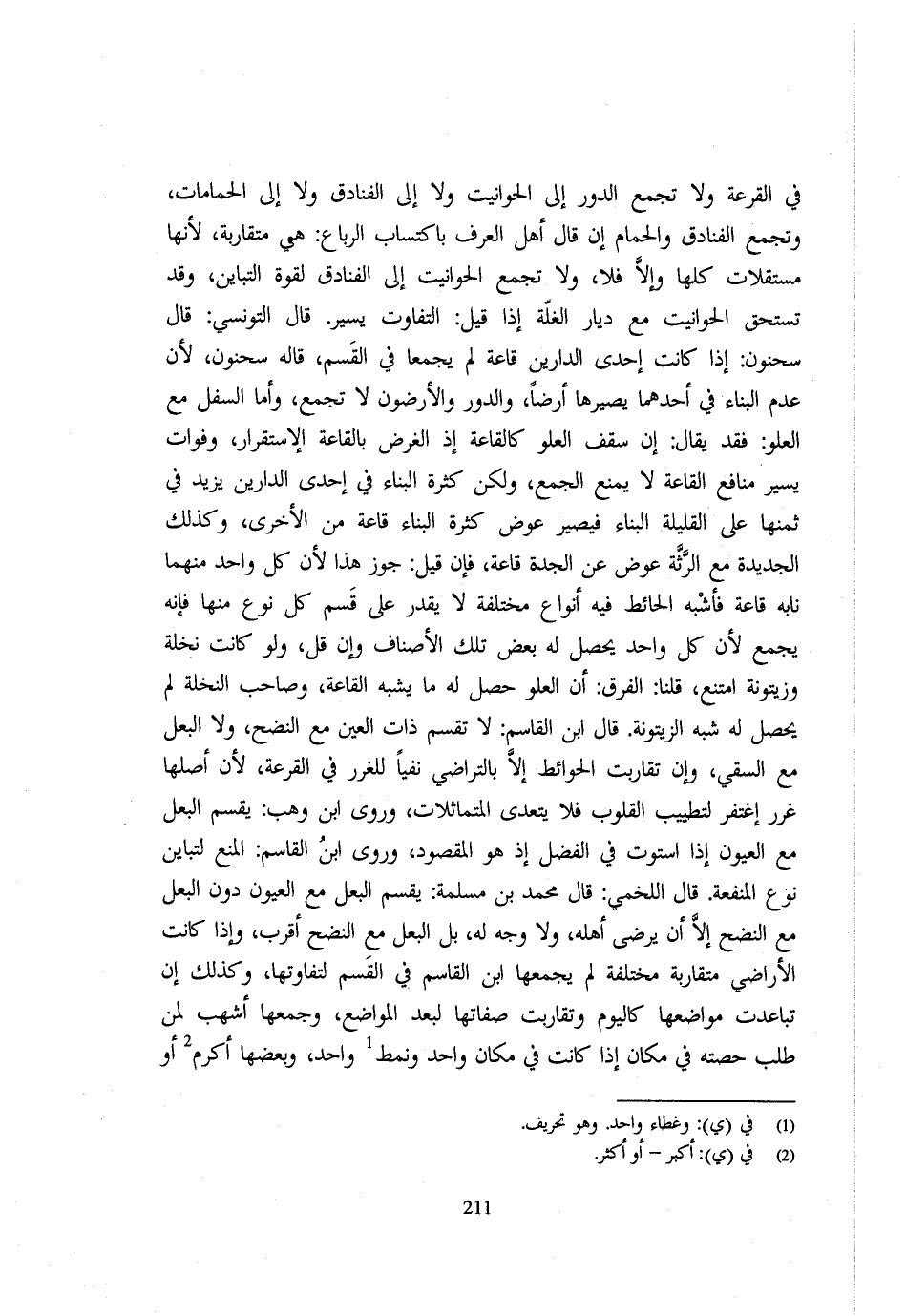 فِي الْقُرْعَةِ وَلَا تُجْمَعُ الدُّورُ إِلَى الْحَوَانِيتِ وَلَا إِلَى الْفَنَادِقِ وَلَا إِلَى الْحَمَّامَاتِ وَتُجْمَعُ الْفَنَادِقُ وَالْحَمَّامُ إِنْ قَال أَهْلُ الْعُرْفِ بِاكْتِسَابِ الرِّبَاعِ هِيَ مُتَقَارِبَةٌ لِأَنَّهَا مُسْتَقِلَّاتٌ كُلُّهَا وَإِلَّا فَلَا وَلَا تُجْمَعُ الْحَوَانِيتُ إِلَى الْفَنَادِقِ لِقُوَّةِ التَّبَايُنِ وَقَدْ تُسْتَحَقُّ الْحَوَانِيتُ مَعَ دِيَارِ الْغَلَّةِ إِذَا قِيلَ التَّفَاوُتُ يَسِيرٌ قَال التُّونِسِيُّ قَال سَحْنُون إِذَا كَانَتْ إِحْدَى الدَّارَيْنِ قَاعَةً لَمْ يُجْمَعَا فِي الْقَسْمِ قَالهُ سَحْنُون لِأَنَّ عَدَمَ الْبِنَاءِ فِي أَحَدِهِمَا يُصَيِّرُهَا أَرْضًا وَالدُّورُ وَالْأَرَضُونَ لَا تُجْمَعُ وَأَمَّا السُّفْلُ مَعَ الْعُلُوِّ فَقَدْ يُقَال إِنَّ سَقْفَ الْعُلُوِّ كَالْقَاعَةِ إِذِ الْغَرَضُ بِالْقَاعَةِ الِاسْتِقْرَارُ وَفَوَاتُ يَسِيرِ مَنَافِعِ الْقَاعَةِ لَا يَمْنَعُ الْجَمْعَ وَلَكِنْ كَثْرَةُ الْبِنَاءِ فِي إِحْدَى الدَّارَيْنِ يَزِيدُ فِي ثَمَنِهَا عَلَى الْقَلِيلَةِ الْبِنَاءِ فَيَصِيرُ عِوَضُ كَثْرَةِ الْبِنَاءِ قَاعَةً مِنَ الْأُخْرَى وَكَذَلِكَ الْجَدِيدَةُ مَعَ الرَّثَّةِ عِوَضٌ عَنِ الْجِدَّةِ قَاعَةً فَإِنْ قِيلَ جُوِّزَ هَذَا لِأَنَّ كُلَّ وَاحِدٍ مِنْهُمَا نَابَهُ قَاعَةٌ فَأَشْبَهَ الْحَائِطَ فِيهِ أَنْوَاع مُخْتَلفَة لَا يقدر على الْقسم كُلِّ نَوْعٍ مِنْهَا فَإِنَّهُ يُجْمَعُ لِأَنَّ كُلَّ وَاحِدٍ يَحْصُلُ لَهُ بَعْضُ تِلْكَ الْأَصْنَافِ وَإِنْ قَلَّ وَلَوْ كَانَتْ نَخْلَةً وَزَيْتُونَةً امْتَنَعَ قُلْنَا الْفَرْقُ أَنَّ الْعُلُوَّ حَصَلَ لَهُ مَا يُشْبِهُ الْقَاعَةَ وَصَاحِب النَّخْلَةِ لَمْ يَحْصُلْ لَهُ شِبْهُ الزَّيْتُونَةِ قَال ابْنُ الْقَاسِمِ لَا تُقَسَّمُ ذَاتُ الْعين مَعَ النَّضْح وَلَا الْبَعْلُ مَعَ السَّقْيِ وَإِنْ تَقَارَبَتِ الْحَوَائِطُ إِلَّا بِالتَّرَاضِي نَفْيًا لِلْغَرَرِ فِي الْقُرْعَةِ لِأَنَّ أَصْلَهَا غَرَرٌ اغْتُفِرَ لِتَطْيِيبِ الْقُلُوبِ فَلَا يَتَعَدَّى الْمُتَمَاثِلَاتِ وَرَوَى ابْنُ وَهْب يُقَسَّمُ الْبَعْلُ مَعَ الْعُيُونِ إِذَا اسْتَوَتْ فِي الْفَضْلِ إِذْ هُوَ الْمَقْصُودُ وَرَوَى ابْنُ الْقَاسِمِ الْمَنْعُ لِتَبَايُنِ نَوْعِ الْمَنْفَعَةِ قَال الْلَخْمِيّ قَال مُحَمَّدُ بْنُ مَسْلَمَةَ يُقَسَّمُ الْبَعْلُ مَعَ الْعُيُونِ دُونَ الْبَعْلِ مَعَ النَّضْحِ إِلَّا أَنْ يَرْضَى أَهْلُهُ وَلَا وَجْهَ لَهُ بَلِ الْبَعْلُ مَعَ النَّضْحِ أَقْرَبُ وَإِذَا كَانَتِ الْأَرَاضِي مُتَقَارِبَةً مُخْتَلِفَةً لَمْ يَجْمَعْهَا ابْنُ الْقَاسِمِ فِي الْقَسْمِ لِتَفَاوُتِهَا وَكَذَلِكَ إِنْ تَبَاعَدَتْ مَوَاضِعُهَا كَالْيَوْمِ وَتَقَارَبَتْ صِفَاتُهَا لِبُعْدِ الْمَوَاضِعِ وَجَمَعَهَا أَشْهَب لِمَنْ طَلَبَ حِصَّتَهُ فِي مَكَانٍ إِذَا كَانَتْ فِي مَكَانٍ وَاحِدٍ وَنَمَطٍ وَاحِدٍ وَبَعْضُهَا اكرم أَو