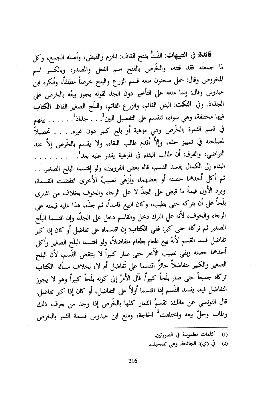 فَائِدَةٌ فِي التَّنْبِيهَات الْقَتُّ بِفَتْحِ الْقَافِ الْحَزْمُ وَالْقَبْضُ وَأَصْلُهُ الْجَمْعُ وَكُلُّ مَا جَمَعْتَهُ فَقَدْ قَتَتَّهُ وَالْخَرْصُ بِالْفَتْحِ اسْمُ الْفِعْلِ وَالْمَصْدَرُ وَبِالْكَسْرِ اسْمُ الْمَخْرُوصِ وَقَال حَمَلَ سَحْنُون مَنْعَهُ قَسْمَ الزَّرْعِ وَالْبَلَحِ خَرْصًا مُطْلَقًا وَأَنْكَرَهُ ابْنُ عَبْدُوسٍ وَقَال إِنَّمَا مَنَعَهُ عَلَى التَّأْخِيرِ دُونَ الْجَذِّ لِقَوْلهِ يَجُوزُ بَيْعُهُ بِالْخَرْصِ عَلَى الْجِذَاذِ وَفِي النُّكَتِ الْبَقْلُ الْقَائِمُ وَالزَّرْعُ الْقَائِمُ وَالْبَلَحُ الصَّغِيرُ أَلْفَاظُ الْكِتَابِ فِيهَا مُخْتَلِفَةٌ وَهِيَ سَوَاءٌ تَنْقَسِمُ على التَّفْصِيل الْبَين جذاذ بَينهم فِي قَسْمِ الثَّمَرَةِ بِالْخَرْصِ وَهِيَ مُزْهِيَةٌ أَوْ بَلَحٌ كَبِير دون غَيره تحصيلاً لمصلحته فِي تَمْيِيز حَقه والا أقدم طَالِبَ الْبَقَاءِ وَلَا يُقَسَّمُ بِالْخَرْصِ إِلَّا عِنْدَ التَّرَاضِي وَالْفَرْقُ أَنَّ طَالِبَ الْبَقَاءِ فِي الْمُزْهِيَةِ يقدر عَلَيْهِ بعد الْبَقَاءِ إِلَى الْكَمَالِ يُفْسِدُ الْقَسْمَ قَالهُ بَعْضُ الْقَرَوِيِّينَ وَلَوِ اقْتَسَمَا الْبَلَحَ الصَّغِيرَ ثُمَّ أَكَلَ أَحدهمَا حِصَّته أَو بعضهما وازهى نصيب الاخرى انتقضت الْقِسْمَة وَيُرِيد الْأَوَّلُ قِيمَةَ مَا قَبَضَ عَلَى الْجَذِّ لَا عَلَى الرَّجَاءِ وَالْخَوْفِ بِخِلَافِ مَنِ اشْتَرَى بَلَحًا عَلَى أَنْ يَتْرُكَهُ حَتَّى يَطِيبَ وَكَانَ الْبَيْعُ فَاسِدًا ثُمَّ جَذَّهُ هَذَا عَلَيْهِ قِيمَتُهُ عَلَى الرَّجَاء وَالْخَوْف لِأَنَّهُ عَليّ التّرْك دخل وَالقَاسِم دَخَلَ عَلَى الْجَذِّ وَإِنِ اقْتَسَمَا الْبَلَحَ الصَّغِيرَ ثمَّ تركاه حَتَّى يكبر فَفِي الْكِتَابِ إِنِ اقْتَسَمَاهُ عَلَى تَفَاضُلٍ أَوْ كَانَ إِذَا كَبُرَ تَفَاضَلَ فَسَدَ الْقَسْمُ لِأَنَّهُ بَيْعُ طَعَامٍ بِطَعَامٍ مُتَفَاضِلًا وَلَوِ اقْتَسَمَا الْبَلَحَ الصَّغِيرَ وَأَكَلَ أَحَدُهُمَا حِصَّتَهُ وَبَقِيَ نَصِيبُ الْآخَرِ حَتَّى صَارَ كَبِيرًا لَا يَنْتَقِضُ الْقَسْمُ لِأَنَّ الْبَلَحَ الصَّغِيرَ وَالْكَبِيرَ مُتَفَاضِلًا جَائِزٌ اقْتَسَمَا عَلَى تُفَاضِلٍ أَمْ لَا بِخِلَافِ مَسْأَلَةِ الْكِتَابِ تَرَكَاهُ جَمِيعًا حَتَّى صَارَ بَلَحًا كَبِيرًا فَآلَ الْأَمْرُ إِلَى كَوْنِهِ بَلَحًا كَبِيرًا وَهُوَ لَا يَجُوزُ التَّفَاضُلُ فِيهِ يَفْسَدُ الْقَسْمُ إِذَا اقْتَسَمَا أَوَّلًا عَلَى التَّفَاضُلِ أَوْ كَانَ إِذَا كَبُرَ تَفَاضَلَ قَال التُّونِسِيُّ عَنْ مَالِك تُقَسَّمُ الثِّمَارُ كُلُّهَا بِالْخَرْصِ إِذَا وُجِدَ مَنْ يَعْرِفُ ذَلِكَ وَطَابَ وَحَلَّ بَيْعُهُ وَاخْتَلَفَتِ الْحَاجَةُ وَمَنَعَ ابْنُ عَبْدُوسٍ قِسْمَةَ الثَّمَرِ بِالْخَرْصِ