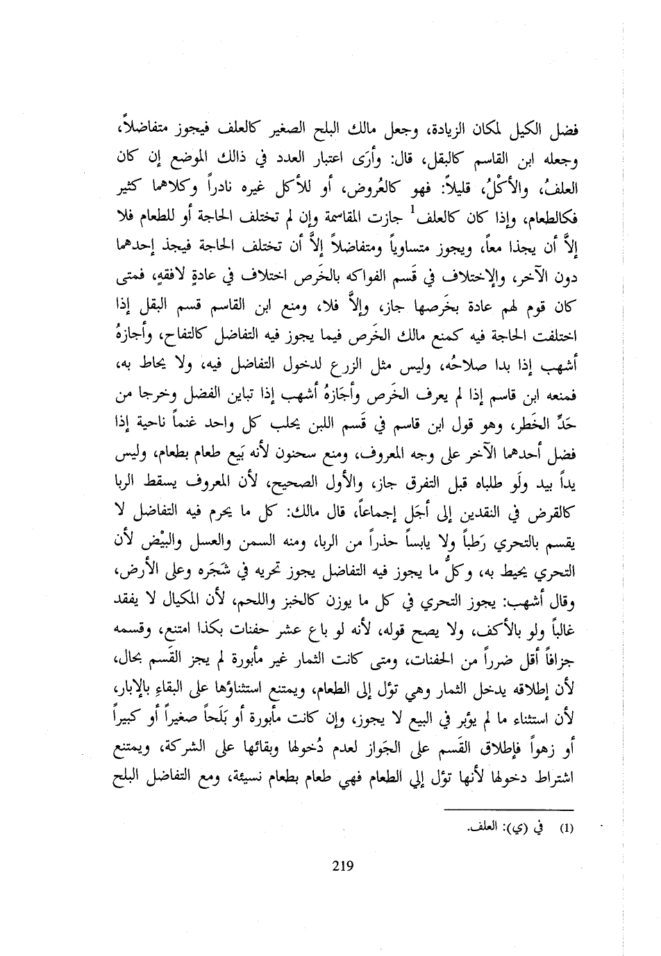 فَضْلُ الْكَيْلِ لِمَكَانِ الزِّيَادَةِ وَجَعَلَ مَالِك الْبَلَحَ الصَّغِيرَ كَالْعَلَفِ فَيَجُوزُ مُتَفَاضِلًا وَجَعَلَهُ ابْنُ الْقَاسِمِ كالبقل قَالَ وَأرى اعْتِبَار الْعدَد فِي ذَلِك الْموضع ان كَانَ الْعلف والاكل قَلِيلا فَهُوَ كالعروض أَو للاكل غَيره نَادرا وَكِلَاهُمَا كثير فكالطعام واذا كَانَ كالحلف جَازَتِ الْمُقَاسَمَةُ وَإِنْ لَمْ تَخْتَلِفِ الْحَاجَةُ أَوْ لِلطَّعَامِ فَلَا إِلَّا أَنْ يُجَذَّا مَعًا وَيَجُوزُ مُتَسَاوِيًا وَمُتَفَاضِلًا إِلَّا أَنْ تَخْتَلِفَ الْحَاجَةُ فَيُجَذُّ إِحْدَاهمَا دُونَ الْآخَرِ وَالِاخْتِلَافُ فِي قَسْمِ الْفَوَاكِهِ بِالْخَرْصِ اخْتِلَاف فِي عَادَة لافقه فَمَتَى كَانَ قَوْمٌ لَهُمْ عَادَةٌ بِخَرْصِهَا جَازَ وَإِلَّا فَلَا وَمَنَعَ ابْنُ الْقَاسِمِ قَسْمَ الْبَقْلِ إِذَا اخْتَلَفَتِ الْحَاجَةُ فِيهِ كَمَنْعِ مَالِك الْخَرْصَ فِيمَا يَجُوزُ فِيهِ التَّفَاضُلُ كَالتُّفَّاحِ وَأَجَازَهُ أَشْهَب إِذَا بَدَا صَلَاحُهُ وَلَيْسَ مِثْلَ الزَّرْعِ لِدُخُولِ التَّفَاضُلِ فِيهِ وَلَا يُحَاطُ بِهِ فَمَنَعَهُ ابْنُ قَاسم إِذَا لَمْ يُعْرَفِ الْخَرْصُ وَأَجَازَهُ أَشْهَب إِذَا تبَاين الْفضل وخرجا من حد الْخطر وَهُوَ قَول ابْن قَاسم فِي قَسْمِ اللَّبَنِ يَحْلُبُ كُلُّ وَاحِدٌ غَنَمًا نَاحِيَةً إِذَا فَضَّلَ أَحَدُهُمَا الْآخَرَ عَلَى وَجْهِ الْمَعْرُوفِ وَمَنَعَ سَحْنُون لِأَنَّهُ بَيْعُ طَعَامٍ بِطَعَامٍ وَلَيْسَ يدا بيد وَلَو طلباه قَبْلَ التَّفَرُّقِ جَازَ وَالْأَوَّلُ الصَّحِيحُ لِأَنَّ الْمَعْرُوفَ يُسْقِطُ الرِّبَا كَالْقَرْضِ فِي النَّقْدَيْنِ إِلَى أَجَلٍ إِجْمَاعًا قَال مَالِك كُلُّ مَا يُحْرُمُ فِيهِ التَّفَاضُلُ لَا يُقَسَّمُ بِالتَّحَرِّي رَطْبًا وَلَا يَابِسًا حَذَرًا مِنَ الرِّبَا وَمِنْهُ السَّمْنُ وَالْعَسَلُ وَالْبَيْضُ لِأَن التَّحَرِّي يُحِيطُ بِهِ وَكُلُّ مَا يَجُوزُ فِيهِ التَّفَاضُلُ يَجُوزُ تَحَرِّيهِ فِي شَجَرِهِ وَعَلَى الْأَرْضِ وَقَال أَشْهَب يَجُوزُ التَّحَرِّي فِي كُلِّ مَا يُوزَنُ كَالْخُبْزِ وَاللَّحْمِ لِأَنَّ الْمِكْيَالَ لَا يُفْقَدُ غَالِبًا وَلَوْ بِالْأَكُفِّ وَلَا يَصِحُّ قَوْلهُ لِأَنَّهُ لَوْ بَاعَ عَشْرَ حَفْنَاتٍ بِكَذَا امْتَنَعَ وَقَسْمُهُ جُزَافًا أَقَلُّ ضَرَرًا مِنَ الْحَفْنَاتِ وَمَتَى كَانْتِ الثِّمَارُ غَيْر مَأْبُورَةٍ لَمْ يَجُزِ الْقَسْمُ بِحَالٍ لِأَنَّ اطلاقه يدْخل الثِّمَار وَهِي تؤل إِلَى الطَّعَامِ وَيَمْتَنِعُ اسْتِثْنَاؤُهَا عَلَى الْبَقَاءِ بِالْإِبَّارِ لِأَنَّ اسْتِثْنَاءَ مَا لَمْ يُؤَبَّرْ فِي الْبَيْعِ لَا يَجُوزُ وَإِنْ كَانَتْ مَأْبُورَةً أَوْ بَلَحًا صَغِيرًا أَوْ كَبِيرًا أَوْ زَهْوًا فَإِطْلَاقُ الْقَسْمِ عَلَى الْجَوَازِ لِعَدَمِ دُخُولِهَا وَبَقَائِهَا عَلَى الشَّرِكَةِ وَيمْتَنع اشْتِرَاط دُخُولهَا لِأَنَّهَا تؤل إِلَى الطَّعَامِ فَهِيَ طَعَامٌ بِطَعَامٍ نَسِيئَةً وَمَعَ التَّفَاضُل البلح