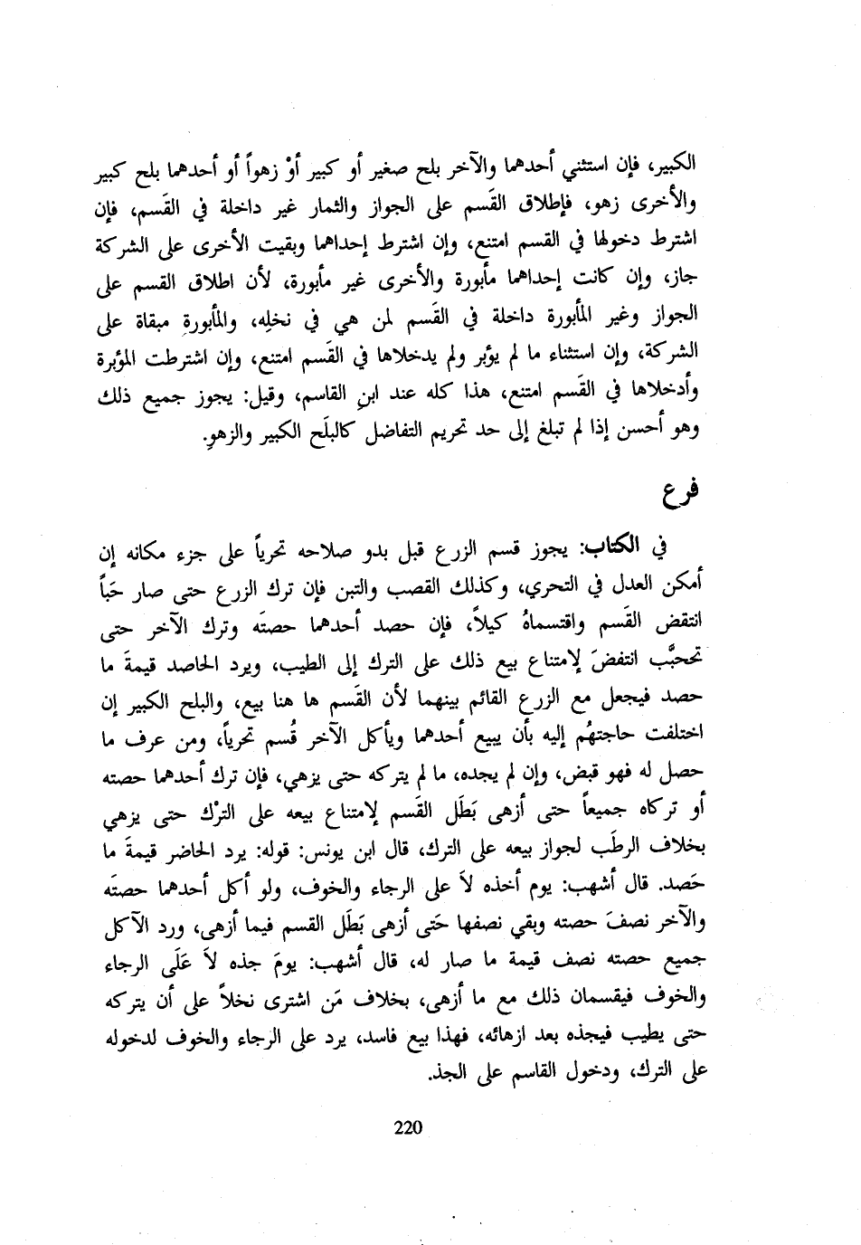 الْكَبِيرُ فَإِنِ اسْتُثْنِيَ أَحَدُهُمَا وَالْآخَرُ بَلَحٌ صَغِيرٌ أَو كَبِير أَو زهواً أَو أَحدهمَا بلح كَبِير والاخرى زَهْوٌ فَإِطْلَاقُ الْقَسْمِ عَلَى الْجَوَازِ وَالثِّمَارُ غَيْر دَاخِلَةٍ فِي الْقَسْمِ فَإِنِ اشْتَرَطَ دُخُولَهَا فِي الْقسم امْتنع وَإِن اشْترط إِحْدَاهُمَا وَبَقِيَتِ الْأُخْرَى عَلَى الشَّرِكَةِ جَازَ وَإِنْ كَانَتْ إِحْدَاهُمَا مَأْبُورَةً وَالْأُخْرَى غَيْر مَأْبُورَةٍ لِأَنَّ إِطْلَاقَ الْقَسْمِ عَلَى الْجَوَازِ وَغَيْر الْمَأْبُورَةِ دَاخِلَةٌ فِي الْقَسْمِ لِمَنْ هِيَ فِي نَخْلِهِ وَالْمَأْبُورَةُ مبقاة على الشّركَة وان اسْتثِْنَاء مَا لَمْ يُؤَبَّرْ وَلَمْ يُدْخِلَاهَا فِي الْقَسْمِ امْتَنَعَ وَإِنِ اشْتُرِطَتِ الْمُؤَبَّرَةُ وَأَدْخَلَاهَا فِي الْقَسْمِ امْتَنَعَ هَذَا كُلُّهُ عِنْدَ ابْنُ الْقَاسِمِ وَقِيلَ يَجُوزُ جَمِيعُ ذَلِكَ وَهُوَ أَحْسَنُ إِذَا لَمْ تَبْلُغْ إِلَى حَدِّ تَحْرِيمِ التَّفَاضُلِ كَالْبَلَحِ الْكَبِيرِ وَالزَّهْوِ