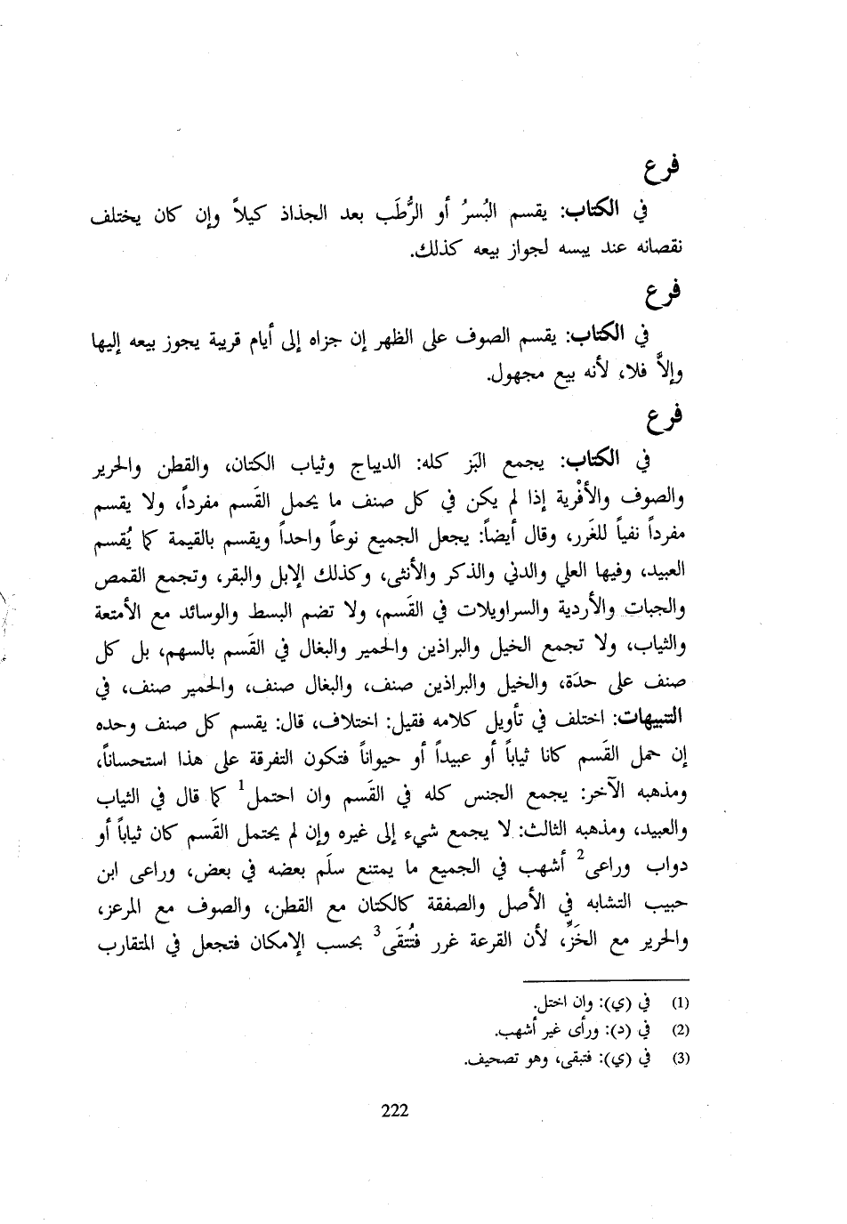 فِي الْكِتَابِ يُجْمَعُ الْبَزُّ كُلُّهُ الدِّيبَاجُ وَثِيَابُ الْكِتَّانِ وَالْقُطْنِ وَالْحَرِيرِ وَالصُّوفِ وَالْأَفْرِيَةِ إِذَا لَمْ يَكُنْ فِي كل صنف مَا يحمل الْقسم مُفردا وَلَا يقسم مُفْرَدًا نَفْيًا لِلْغَرَرِ وَقَال أَيْضًا يُجْعَلُ الْجَمِيعُ نوعا وَاحِدًا وَيقسم بِالْقيمَةِ كَمَا يقسم الْعَبِيدُ وَفِيهَا الْعَلِيُّ وَالدَّنِيُّ وَالذَّكَرُ وَالْأُنْثَى وَكَذَلِكَ الابل وَالْبَقر وَتجمع الْقَصَص والجبات وَالْأَرْدِيَةُ وَالسَّرَاوِيلَاتُ فِي الْقَسْمِ وَلَا تُضَمُّ الْبُسُطُ وَالْوَسَائِدُ مَعَ الْأَمْتِعَةِ وَالثِّيَابِ وَلَا تُجْمَعُ الْخَيْلُ وَالْبَرَاذِينُ وَالْحَمِيرُ وَالْبِغَالُ فِي الْقَسْمِ بِالسَّهْمِ بَلْ كُلُّ صِنْفٍ عَلَى حِدَةٍ وَالْخَيْلُ وَالْبَرَاذِينُ صِنْفٌ وَالْبِغَالُ صِنْفٌ وَالْحَمِيرُ صِنْفٌ فِي التَّنْبِيهَات اخْتُلِفَ فِي تَأْوِيلِ كَلَامِهِ فَقِيلَ اخْتِلَافٌ قَال يُقَسَّمُ كل صنف وَحده ان حمل الْقسم كَانَا ثِيَابًا أَوْ عَبِيدًا أَوْ حَيَوَانًا فَتَكُونُ التَّفْرِقَةُ عَلَى هَذَا اسْتِحْسَانًا وَمَذْهَبُهُ الْآخَرُ يُجْمَعُ الْجِنْسُ كُلُّهُ فِي الْقَسْمِ وَإِنِ احْتَمَلَ كَمَا قَال فِي الثِّيَابِ وَالْعَبِيدِ وَمَذْهَبُهُ الثَّالِثُ لَا يُجْمَعُ شَيْءٌ إِلَى غَيْرهِ وَإِنْ لَمْ يَحْتَمِلِ الْقَسْمَ كَانَ ثيابًا أَو دَوَاب وَرَاعَى أَشْهَب فِي الْجَمِيعِ مَا يَمْتَنِعُ سَلَمُ بَعْضِهِ فِي بَعْضٍ وَرَاعَى ابْنُ حَبِيب التَّشَابُهَ فِي الْأَصْلِ وَالصَّفْقَةِ كَالْكَتَّانِ مَعَ الْقُطْنِ وَالصُّوفِ مَعَ الْمعز وَالْحَرِير مَعَ الْخَزّ لَان الْقرعَة غرر فَتبقى بِحَسْبِ الْإِمْكَانِ فَتُجْعَلُ فِي الْمُتَقَارِبِ