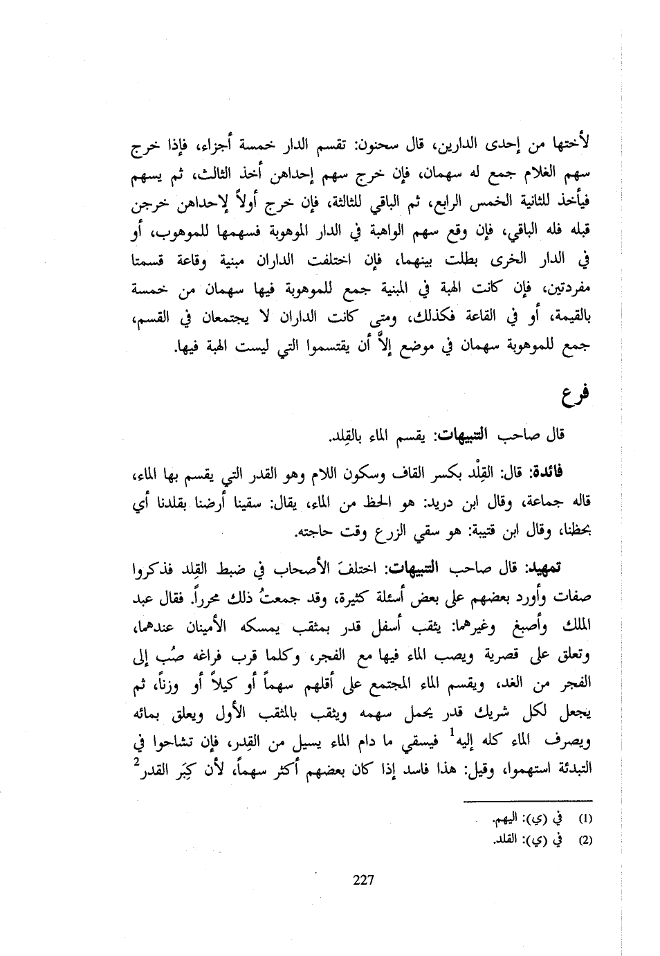 قَال صَاحِب التَّنْبِيهَات يُقَسَّمُ الْمَاءُ بِالْقِلْدِ فَائِدَةٌ قَال الْقِلْدُ بِكَسْرِ الْقَافِ وَسُكُونِ اللَّامِ وَهُوَ الْقِدْرُ الَّتِي يُقَسَّمُ بِهَا الْمَاءُ قَالهُ جَمَاعَةٌ وَقَال ابْنُ دُرَيْدٍ هُوَ الْحَظ من المَاء يُقَال سقينا أَرْضنَا بِقِلْدِنَا أَيْ بِحَظِّنَا وَقَال ابْنُ قُتَيْبَةَ هُوَ سَقْيُ الزَّرْعِ وَقْتَ حَاجَتِهِ تَمْهِيدٌ قَال صَاحِب التَّنْبِيهَات اخْتَلَفَ الْأَصْحَابُ فِي ضَبْطِ الْقِلْدِ فَذَكَرُوا صِفَاتٍ وَأَوْرَدَ بَعْضُهُمْ عَلَى بَعْضٍ أَسْئِلَةً كَثِيرَةً وَقَدْ جَمَعْتُ ذَلِكَ مُحَرَّرًا فَقَال عَبْدُ الْمَلِكِ وَأَصْبَغُ وَغَيْرهُمَا يُثْقَبُ أَسْفَلَ قِدْرٍ بِمِثْقَبٍ يَمْسِكُهُ الأمنيان عِنْدَهُمَا وَتُعَلَّقُ عَلَى قَصْرِيَّةٍ وَيُصَبُّ الْمَاءُ فِيهَا مَعَ الْفَجْرِ وَكُلَّمَا قَرُبَ فَرَاغُهُ صُبَّ إِلَى الْفجْر من الْغَد وَيُقَسَّمُ الْمَاءُ الْمُجْتَمِعُ عَلَى أَقَلِّهِمْ سَهْمًا أَوْ كَيْلًا أَوْ وَزْنًا ثُمَّ يُجْعَلُ لِكُلِّ شَرِيكٍ قِدْرٌ يَحْمِلُ سَهْمَهُ وَيُثْقَبُ بِالْمِثْقَبِ الْأَوَّلِ وَيُعَلَّقُ بِمَائِهِ وَيُصَرَّفُ الْمَاءُ كُلُّهُ إِلَيْهِ فَيَسْقِي مَا دَامَ الْمَاءُ يَسِيلُ مِنَ الْقِدْرِ فَإِنْ تَشَاحُّوا فِي التَّبْدِئَةِ اسْتَهَمُوا وَقِيلَ هَذَا فَاسِدٌ إِذَا كَانَ بَعْضُهُمْ أَكْثَرَ سَهْمًا لِأَنَّ كِبَرَ الْقِدْرِ