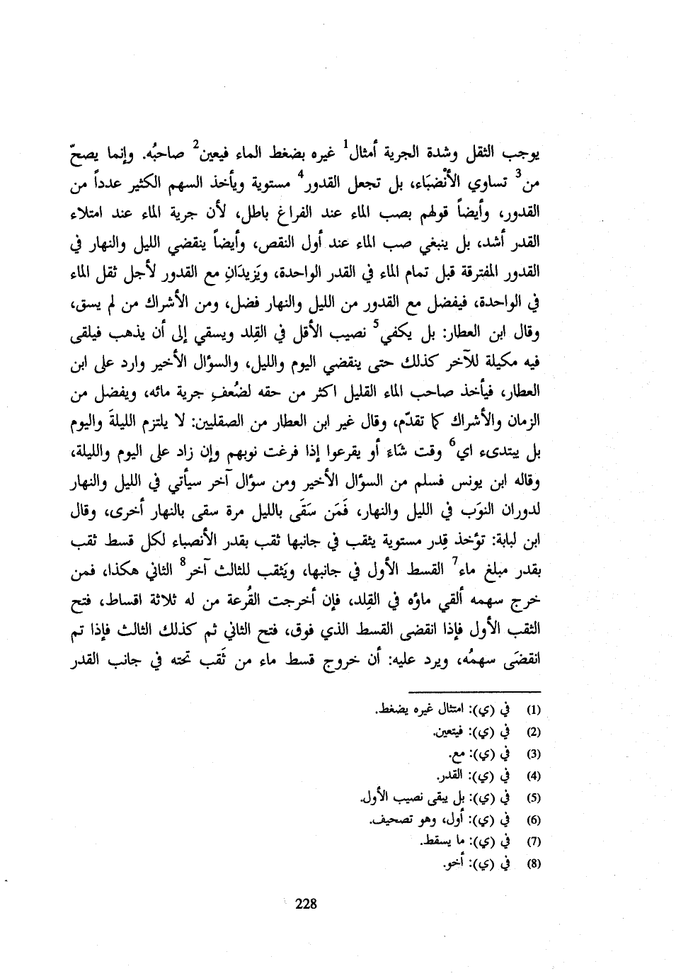 يُوجِبُ الثِّقَلُ وَشِدَّةُ الْجَرْيَةِ أَمْثَالَ غَيْرهِ بِضَغْطِ الْمَاءِ فَيُعِينُ صَاحِبهُ وَإِنَّمَا يَصِحُّ مِنْ تَسَاوِي الأنضباء بَلْ تُجْعَلُ الْقُدُورُ مُسْتَوِيَةً وَيُأْخَذُ السَّهْمُ الْكَثِيرُ عددا من الْقُدُور وَأَيْضًا قَوْلهم بصب الْمَاءِ عِنْدَ الْفَرَاغِ بَاطِلٌ لِأَنَّ جَرْيَةَ الْمَاءِ عِنْدَ امْتِلَاءِ الْقِدْرِ أَشَدُّ بَلْ يَنْبَغِي صَبُّ المَاء عِنْد أول النَّقْص وايضاً يقْضِي اللَّيْل وَالنَّهَار فِي الْقُدُور المتفرقة قَبْلَ تَمَامِ الْمَاءِ فِي الْقِدْرِ الْوَاحِدَةِ وَيَزِيدَانِ مَعَ الْقُدُورِ لِأَجْلِ ثِقَلِ الْمَاءِ فِي الْوَاحِدَةِ فَيَفْضُلُ مَعَ الْقُدُورِ مِنَ اللَّيْلِ وَالنَّهَارِ فَضْلٌ وَمِنَ الْأَشْرَاكِ مَنْ لَمْ يَسْقِ وَقَال ابْنُ الْعَطَّارِ بَلْ يَكْفِي نَصِيبُ الْأَقَلِّ فِي الْقِلْدِ وَيَسْقِي إِلَى أَنْ يَذْهَبَ فَيُلْقَى فِيهِ مَكِيلَةٌ لِلْآخَرِ كَذَلِكَ حَتَّى يَنْقَضِيَ الْيَوْمُ وَاللَّيْلُ وَالسُّؤَالُ الْأَخِيرُ وَارِدٌ عَلَى ابْنِ الْعَطَّارِ فَيَأْخُذُ صَاحِب الْمَاءِ الْقَلِيلِ أَكْثَرَ مِنْ حَقِّهِ لِضَعْفِ جَرْيَةِ مِائَهِ وَيَفْضُلُ مِنَ الزَّمَانِ وَالْأَشْرَاكِ كَمَا تَقَدَّمَ وَقَال غَيْر ابْنِ الْعَطَّارِ مِنَ الصِّقَلِّيِّينَ لَا يلْتَزم اللَّيْلَة وَالْيَوْمَ بَلْ يَبْتَدِئُ أَيَّ وَقْتٍ شَاءَ أَوْ يُقْرِعُوا إِذَا فَرَغَتْ نُوَبُهُمْ وَإِنْ زَادَ عَلَى الْيَوْمِ وَاللَّيْلَةِ وَقَالهُ ابْنُ يُونُسَ فَسَلَمَ مِنَ السُّؤَالِ الْأَخِيرِ وَمِنْ سُؤَالٍ آخَرَ سَيَأْتِي فِي اللَّيْلِ وَالنَّهَارِ لِدَوَرَانِ النُّوَبِ فِي اللَّيْلِ وَالنَّهَارِ فَمَنْ سَقَى بِاللَّيْلِ مَرَّةً سَقَى بِالنَّهَارِ أُخْرَى وَقَال ابْنُ لُبَابَةَ تُؤْخَذُ قِدْرٌ مُسْتَوِيَةٌ يُثْقَبُ فِي جَانِبِهَا ثُقْب بِقَدْرِ الْأَنْصِبَاءِ لِكُلِّ قِسْطٍ ثُقْبٌ بِقَدْرِ مَبْلَغِ مَاءِ الْقِسْطِ الْأَوَّلِ فِي جَانبهَا ويثقب لِلثَّالِثِ آخِرَ الثَّانِي هَكَذَا فَمَنْ خَرَجَ سَهْمُهُ أُلْقِيَ مَاؤُهُ فِي الْقِلْدِ فَإِنْ أَخْرَجَتِ الْقَرْعَةُ من لَهُ ثَلَاثَة اقساط فنح الثُّقْبُ الْأَوَّلُ فَإِذَا انْقَضَى الْقِسْطُ الَّذِي فَوْقَ فُتِحَ الثَّانِي ثُمَّ كَذَلِكَ الثَّالِثُ فَإِذَا تَمَّ انْقَضَى سَهْمُهُ وَيُرَدُّ عَلَيْهِ أَنَّ خُرُوجَ قِسْطِ مَاءٍ مِنْ ثُقْبٍ تَحْتَهُ فِي جَانِبِ الْقَدْرِ