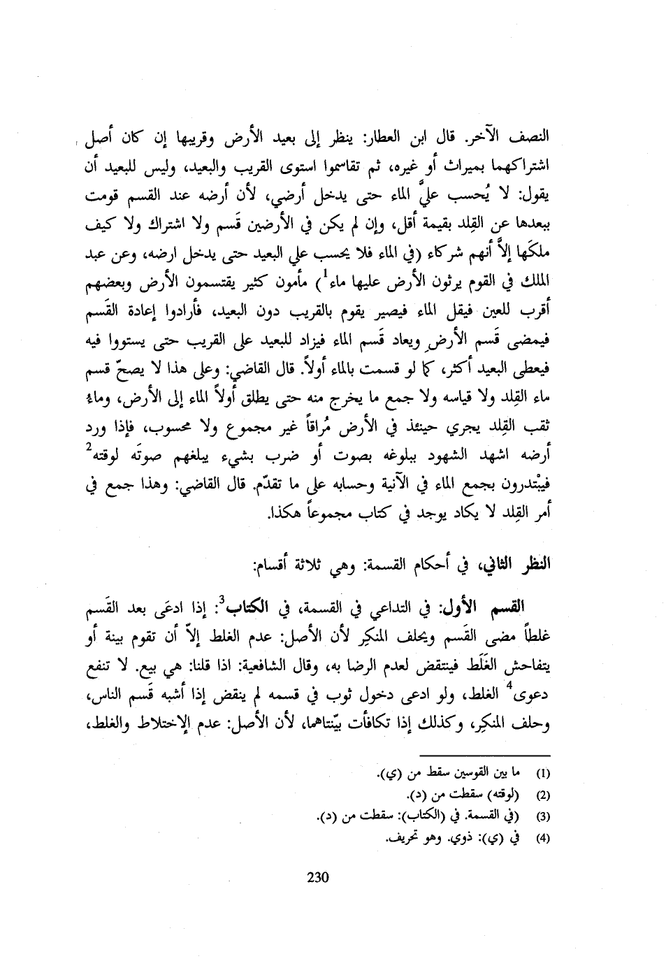 النِّصْفُ الْآخَرُ قَال ابْنُ الْعَطَّارِ يُنْظَرُ إِلَى بَعِيدِ الْأَرْضِ وَقَرِيبِهَا إِنْ كَانَ أَصْلُ اشْتِرَاكِهِمَا بِمِيرَاثٍ أَوْ غَيْرهِ ثُمَّ تَقَاسَمُوا اسْتَوَى الْقَرِيبُ وَالْبَعِيدُ وَلَيْسَ لِلْبَعِيدِ أَنْ يَقُولَ لَا يُحْسَبُ عَلَيَّ الْمَاءُ حَتَّى يَدْخُلَ أَرْضِي لِأَنَّ أَرْضَهُ عِنْدَ الْقَسْمِ قُوِّمَتْ بِبُعْدِهَا عَنِ الْقِلْدِ بِقِيمَةٍ أَقَلَّ وَإِنْ لَمْ يَكُنْ فِي الْأَرَضِينَ قَسْمٌ وَلَا اشْتِرَاكٌ وَلَا كَيْفَ مَلَكَهَا إِلَّا أَنَّهُمْ شُرَكَاء وَفِي الْمَاءِ فَلَا يُحْسَبُ عَلَى الْبَعِيدِ حَتَّى يَدْخُلَ ارضه وَعَن عَبْدِ الْمَلِكِ فِي الْقَوْمِ يَرِثُونَ الْأَرْضَ عَلَيْهَا مَاءٌ مَأْمُونٌ كَثِيرٌ يَقْتَسِمُونَ الْأَرْضَ وَبَعْضُهُمْ أَقْرَبُ للعين فَقيل الْمَاءُ فَيَصِيرُ يُقَوَّمُ بِالْقَرِيبِ دُونَ الْبَعِيدِ فَأَرَادُوا إِعَادَةَ الْقَسْمِ فَيُمْضَى قَسْمُ الْأَرْضِ وَيُعَادُ قَسْمُ الْمَاءِ فَيُزَادُ لِلْبَعِيدِ عَلَى الْقَرِيبِ حَتَّى يَسْتَوُوا فِيهِ فَيعْطى الْبعيد اكثر كَمَا لَو قسكت بِالْمَاءِ أَوَّلًا قَال الْقَاضِي وَعَلَى هَذَا لَا يَصِحُّ قَسْمُ مَاءِ الْقِلْدِ وَلَا قِيَاسُهُ وَلَا جَمْعُ مَا يَخْرُجُ مِنْهُ حَتَّى يُطْلَقَ أَوَّلًا المَاء الى الأَرْض وَمَاء ثقب الْقِلْدِ يَجْرِي حِينَئِذٍ فِي الْأَرْضِ مُرَاقًا غَيْر مَجْمُوعٍ وَلَا مَحْسُوبٍ فَإِذَا وَرَدَ أَرْضَهُ أَشْهَدَ الشُّهُودَ بِبُلُوغِهِ بِصَوْتٍ أَوْ ضَرَبَ بِشَيْءٍ يَبْلُغُهُمْ صَوْتُهُ لِوَقْتِهِ فَيَبْتَدِرُونَ بِجَمْعِ الْمَاءِ فِي الْآنِيَةِ وَحِسَابِهِ عَلَى مَا تَقَدَّمَ قَال الْقَاضِي وَهَذَا يجمع فِي أَمْرِ الْقِلْدِ لَا يَكَادُ يُوجَدُ فِي كِتَابٍ مَجْمُوعًا هَكَذَا النَّظَرُ الثَّانِي فِي أَحْكَامِ الْقِسْمَةِ وَهِيَ ثَلَاثَةُ أَقْسَامٍ الْقِسْمُ الْأَوَّلُ فِي التداعي فِي الْقِسْمَة فِي الْكِتَابِ إِذَا ادَّعَى بَعْدَ الْقَسْمِ غَلَطًا مَضَى الْقَسْمُ وَيَحْلِفُ الْمُنْكِرُ لِأَنَّ الْأَصْلَ عَدَمُ الْغَلَطِ إِلَّا أَنْ تَقُومَ بَيِّنَةٌ أَوْ يَتَفَاحَشَ الْغَلَطُ فَيَنْتَقِضُ لِعَدَمِ الرِّضَا بِهِ وَقَال الشَّافِعِيَّةُ إِذَا قُلْنَا هِيَ بَيْعٌ لَا تَنْفَعُ دَعْوَى الْغَلَطِ وَلَوِ ادَّعَى دُخُولَ ثَوْبٍ فِي قَسْمِهِ لم ينتفض إِذَا أَشْبَهَ قَسْمَ النَّاسِ وَحَلَفَ الْمُنْكِرُ وَكَذَلِكَ إِذا تكافأت بينتهما لَان الأَصْل عد الإختلاط والغلط