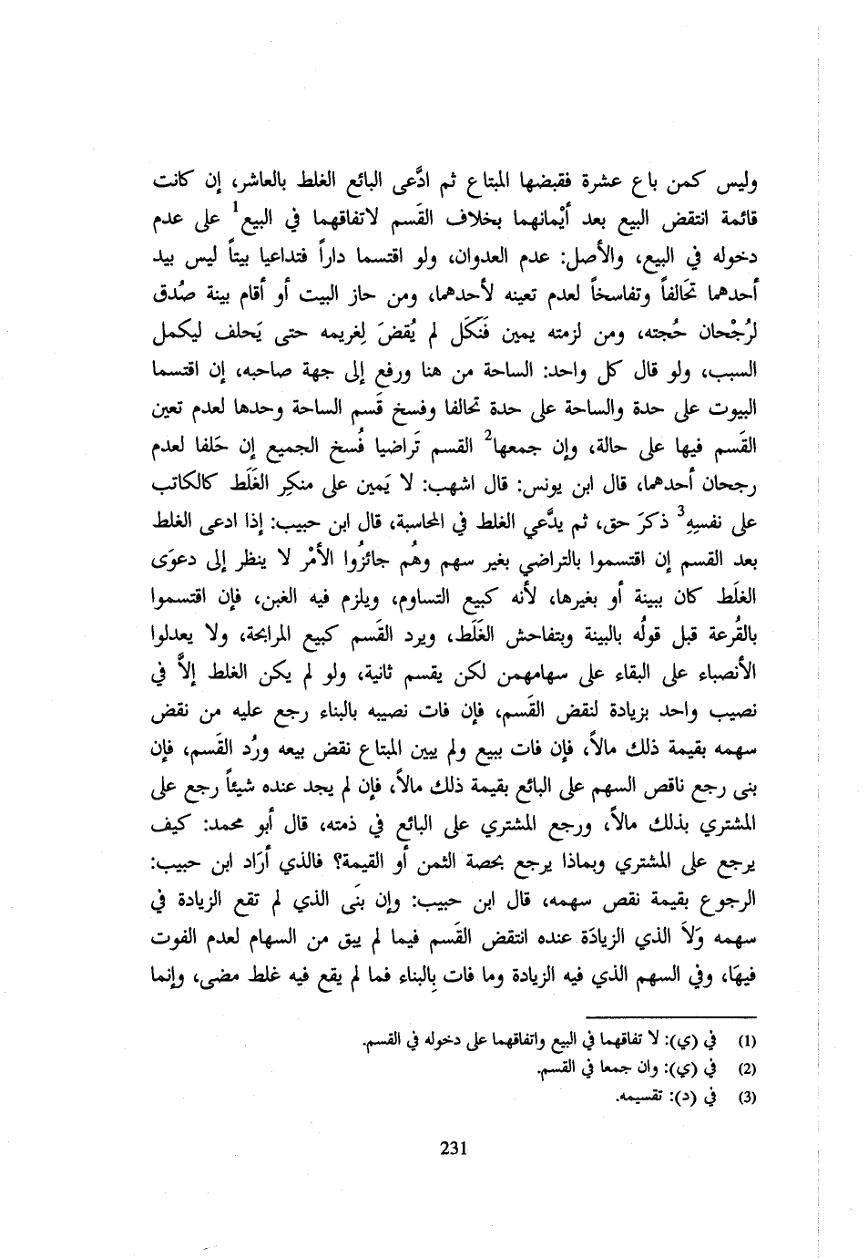 وَلَيْسَ كَمَنْ بَاعَ عَشَرَةً فَقَبَضَهَا الْمُبْتَاعُ ثُمَّ ادَّعَى الْبَائِعُ الْغَلَطَ بِالْعَاشِرِ إِنْ كَانَتْ قَائِمَةً انتفض الْبَيْعُ بَعْدَ أَيْمَانِهِمَا بِخِلَافِ الْقَسْمِ لِاتِّفَاقِهِمَا فِي الْبَيْعِ عَلَى عَدَمِ دُخُولِهِ فِي الْبَيْعِ وَالْأَصْلُ عَدَمُ الْعُدْوَانِ وَلَوِ اقْتَسَمَا دَارًا فَتَدَاعَيَا بَيْتًا لَيْسَ بِيَدِ أَحَدِهِمَا تَحَالَفَا وَتَفَاسَخَا لِعَدَمِ تَعَيُّنِهِ لِأَحَدِهِمَا وَمَنْ حَازَ الْبَيْتَ أَوْ أَقَامَ بَيِّنَةً صُدِّقَ لِرُجْحَانِ حُجَّتِهِ وَمَنْ لَزِمَتْهُ يَمِينٌ فَنَكَلَ لَمْ يُقْضَ لِغَرِيمِهِ حَتَّى يَحْلِفَ لِيُكْمِلَ السَّبَبَ وَلَوْ قَال كُلُّ وَاحِدٍ السَّاحَةُ مِنْ هُنَا وَرفع إِلَى جِهَةِ صَاحِبهِ إِنِ اقْتَسَمَا الْبُيُوتَ عَلَى حِدَةٍ وَالسَّاحَةَ عَلَى حِدَةٍ تَحَالَفَا وَفُسِخَ قَسْمُ الساحة وَحدهَا لعدم تعين الْقَسْمِ فِيهَا عَلَى حَالَه وَإِنْ جَمَعَهَا الْقَسْمُ تَرَاضيا فسخ الْجَمِيع ان حلفا لِعَدَمِ رُجْحَانِ أَحَدِهِمَا قَال ابْنُ يُونُسَ قَال أَشْهَب لَا يَمِينَ عَلَى مُنْكِرِ الْغَلَطِ كَالْكَاتِبِ على نَفسه ذِكْرَ حَقٍّ ثُمَّ يَدَّعِي الْغَلَطَ فِي الْمُحَاسَبَةِ قَال ابْنُ حَبِيب إِذَا ادَّعَى الْغَلَطَ بَعْدَ الْقسم وان اقتسموا بِالتَّرَاضِي بِغَيْر سهم وهم جائزوا الْأَمْرِ لَا يُنْظَرُ إِلَى دَعْوَى الْغَلَطِ كَانَ بِبَيِّنَةٍ أَوْ بِغَيْرهَا لِأَنَّهُ كَبَيْعِ التَّسَاوُمِ وَيَلْزَمُ فِيهِ الْغَبْنُ فَإِنِ اقْتَسَمُوا بِالْقُرْعَةِ قُبِلَ قَوْلهُ بِالْبَيِّنَةِ وَبِتَفَاحُشِ الْغَلَطِ وَيُرَدُّ الْقَسْمُ كَبَيْعِ الْمُرَابَحَةِ وَلَا يعدلُوا الْأَنْصِبَاء على الْبَقَاء على سهامهمن لَكِنْ يُقَسَّمُ ثَانِيَةً وَلَوْ لَمْ يَكُنِ الْغَلَطُ إِلَّا فِي نَصِيبٍ وَاحِدٍ بِزِيَادَةٍ لَنَقَضَ الْقَسْمُ فَإِنْ فَاتَ نَصِيبُهُ بِالْبِنَاءِ رَجَعَ عَلَيْهِ مَنْ نَقَضَ سَهْمَهُ بِقِيمَةِ ذَلِكَ مَالًا فَإِنْ فَاتَ بِبيع وَلم يبين الْمُبْتَاعُ نُقِضَ بَيْعُهُ وَرُدَّ الْقَسْمُ فَإِنْ بَنَى رَجَعَ نَاقِصُ السَّهْمِ عَلَى الْبَائِعِ بِقِيمَةِ ذَلِكَ مَالًا فَإِنْ لَمْ يَجِدْ عِنْدَهُ شَيْئًا رَجَعَ عَلَى الْمُشْتَرِي بِذَلِكَ مَالًا وَرَجَعَ الْمُشْتَرِي عَلَى الْبَائِعِ فِي ذِمَّتِهِ قَال أَبُو مُحَمَّدٍ كَيْفَ يُرْجَعُ عَلَى الْمُشْتَرِي وَبِمَاذَا يُرْجَعُ بِحِصَّةِ الثَّمَنِ أَوِ الْقِيمَةِ فَالَّذِي أَرَادَ ابْنُ حَبِيب الرُّجُوعُ بِقِيمَةِ نَقْصِ سَهْمِهِ قَال ابْنُ حَبِيب وَإِنْ بَنَى الَّذِي لَمْ تَقَعِ الزِّيَادَةُ فِي سَهْمِهِ وَلَا الَّذِي الزِّيَادَةُ عِنْدَهُ انْتَقَضَ الْقَسْمُ فِيمَا لم يبْق مِنَ السِّهَامِ لِعَدَمِ الْفَوْتِ فِيهَا وَفِي السَّهْمِ الَّذِي فِيهِ الزِّيَادَةُ وَمَا فَاتَ بِالْبِنَاءِ فَمَا لَمْ يَقَعْ فِيهِ غَلَطٌ مَضَى وَإِنَّمَا