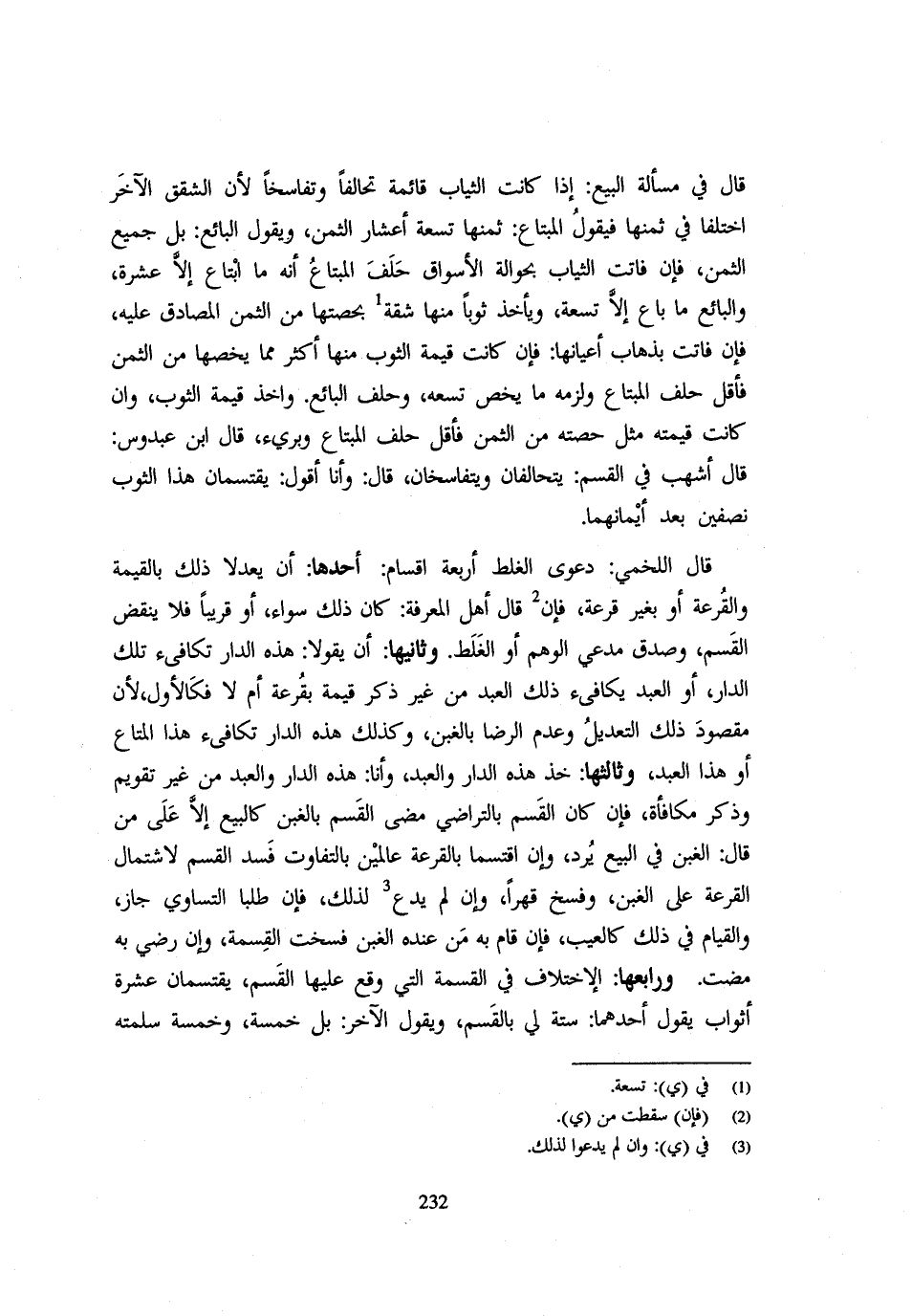 قَال فِي مَسْأَلَةِ الْبَيْعِ إِذَا كَانَتِ الثِّيَابُ قَائِمَة تحَالفا وتفاسخا لِأَن الشقق الآخر اخْتَلَفَا فِي ثَمَنِهَا فَيَقُولُ الْمُبْتَاعُ ثَمَنُهَا تِسْعَةُ أَعْشَارِ الثَّمَنِ وَيَقُولُ الْبَائِعُ بَلْ جَمِيعُ الثَّمَنِ فَإِنْ فَاتَتِ الثِّيَابُ بِحَوَالَةِ الْأَسْوَاقِ حَلَفَ الْمُبْتَاعُ أَنَّهُ مَا ابْتَاعَ إِلَّا عَشَرَةً وَالْبَائِعُ مَا بَاعَ إِلَّا تِسْعَةً وَيَأْخُذُ ثَوْبًا مِنْهَا شَقَّةً بِحِصَّتِهَا مِنَ الثَّمَنِ الْمُصَادَقِ عَلَيْهِ فَإِنْ فَاتَتْ بِذَهَابِ أَعْيَانِهَا فَإِنْ كَانَتْ قِيمَةُ الثَّوْبِ مِنْهَا اكثر مِمَّا يَخُصهَا من الثّمن فَأَقل حَلَفَ الْمُبْتَاعُ وَلَزِمَهُ مَا يَخُصُّ تُسْعَهُ وَحَلَفَ البَائِع واخذ قيمَة الثَّوْب وَإِنْ كَانَتْ قِيمَتُهُ مِثْلَ حِصَّتِهِ مِنَ الثَّمَنِ فَأَقل حلف الْمُبْتَاع وبريء قَالَ ابْن عَبدُوس قَالَ أَشْهَب فِي الْقَسْمِ يَتَحَالَفَانِ وَيَتَفَاسَخَانِ قَال وَأَنَا أَقُولُ يَقْتَسِمَانِ هَذَا الثَّوْبَ نِصْفَيْنِ بَعْدَ أَيْمَانِهِمَا قَال الْلَخْمِيّ دَعْوَى الْغَلَطِ أَرْبَعَةُ أَقْسَامٍ أَحَدُهَا أَنْ يَعْدِلَا ذَلِكَ بِالْقِيمَةِ وَالْقُرْعَةِ أَوْ بِغَيْر قُرْعَةٍ فَإِنْ قَال أَهْلُ الْمَعْرِفَةِ كَانَ ذَلِكَ سَوَاء أَو قَرِيبا فَلَا ينْتَقض الْقَسْمُ وَصُدِّقَ مُدَّعِي الْوَهْمِ أَوِ الْغَلَطِ وَثَانِيهَا أَنْ يَقُولَا هَذِهِ الدَّارُ تُكَافِئُ تِلْكَ الدَّارَ أَوِ الْعَبْدُ يُكَافِئُ ذَلِكَ الْعَبْدَ مِنْ غَيْر ذكر قيمَة بِقرْعَة أَمْ لَا فَكَالْأَوَّلِ لِأَنَّ مَقْصُودَ ذَلِكَ التَّعْدِيلُ وَعَدَمُ الرِّضَا بِالْغَبْنِ وَكَذَلِكَ هَذِهِ الدَّارُ تُكَافِئُ هَذَا الْمَتَاع أَو هَذَا العَبْد هَذَا وَثَالِثهَا خُذ هَذِه الدَّار وَالْعَبْد وانا هَذِه الدَّار وَالْعَبْد مِنْ غَيْر تَقْوِيمٍ وَذِكْرِ مُكَافَأَةٍ فَإِنْ كَانَ الْقَسْمُ بِالتَّرَاضِي مَضَى الْقَسْمُ بِالْغَبْنِ كَالْبَيْعِ إِلَّا عَلَى مَنْ قَال الْغَبْنُ فِي الْبَيْعِ يُرَدُّ وَإِنِ اقْتَسَمَا بِالْقُرْعَةِ عَالِمَيْنِ بِالتَّفَاوُتِ فَسَدَ الْقَسْمُ لِاشْتِمَالِ الْقُرْعَةِ عَلَى الْغَبْنِ وَفُسِخَ قَهْرًا وَإِنْ لَمْ يَدْعُ لِذَلِكَ فَإِنْ طَلَبَا التَّسَاوِي جَازَ وَالْقِيَامُ فِي ذَلِكَ كَالْعَيْبِ فَإِنْ قَامَ بِهِ مَنْ عِنْدَهُ الْغَبْنُ فُسِخَتِ الْقِسْمَةُ وَإِنْ رَضِيَ بِهِ مَضَت وَرَابِعهَا الإختلاف فِي الْقِسْمَة الَّتِي وَقَعَ عَلَيْهَا الْقَسْمُ يَقْتَسِمَانِ عَشَرَةَ أَثْوَابٍ يَقُولُ أَحَدُهُمَا سِتَّةٌ لِي بِالْقَسْمِ وَيَقُولُ الْآخَرُ بل خَمْسَة وَخَمْسَة سلمته