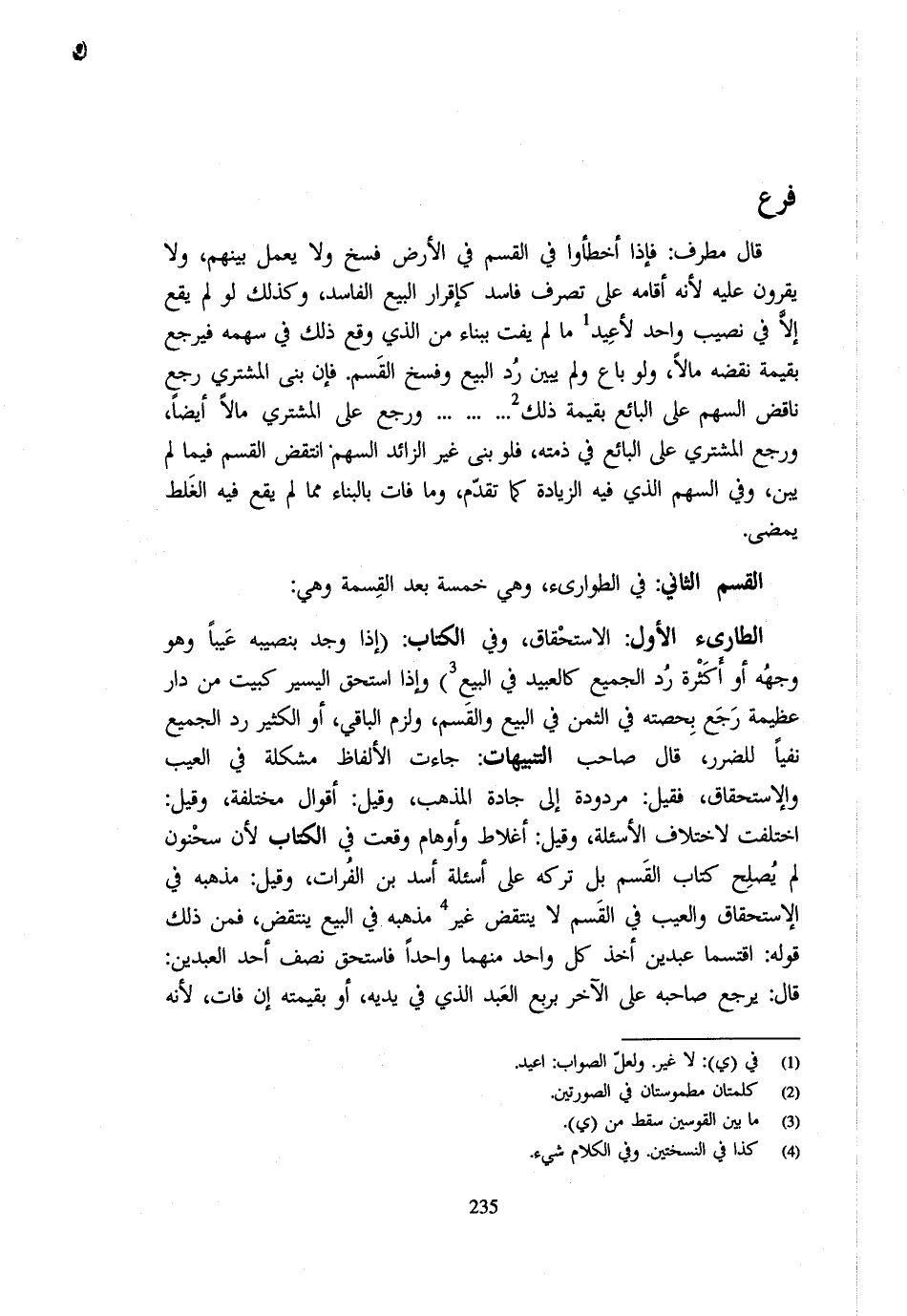 قَالَ مطرف فَإِذا اخطأوا فِي الْقسم فِي الارض فسخ وَلَا يعْمل بَينهم وَلَا يقرونَ عَلَيْهِ لِأَنَّهُ إقَامَةُ عَلَى تَصَرُّفٍ فَاسِدٍ كَإِقْرَارِ الْبَيْعِ الْفَاسِدِ وَكَذَلِكَ لَوْ لَمْ يَقَعْ إِلَّا فِي نَصِيبٍ وَاحِدٍ لَأُعِيدَ مَا لَمْ يَفُتْ بِبِنَاءٍ مِنَ الَّذِي وَقَعَ ذَلِكَ فِي سَهْمِهِ فَيَرْجِعُ بِقِيمَةِ نَقْضِهِ مَالًا وَلَوْ بَاعَ وَلَمْ يبين رُدَّ الْبَيْعُ وَفُسِخَ الْقَسْمُ فَإِنْ بَنَى الْمُشْتَرِي رَجَعَ نَاقِضُ السَّهْمِ عَلَى الْبَائِعِ بِقِيمَةِ ذَلِكَ وَرجع عَلَى الْمُشْتَرِي مَالًا أَيْضًا وَرَجَعَ الْمُشْتَرِي عَلَى الْبَائِعِ فِي ذِمَّتِهِ فَلَوْ بَنَى غَيْر الزَّائِدِ السهْم انْتقض الْقسم فِيمَا لم يبين وَفِي السهْم فِيهِ الزِّيَادَةُ كَمَا تَقَدَّمَ وَمَا فَاتَ بِالْبِنَاءِ مِمَّا لَمْ يَقَعْ فِيهِ الْغَلَطُ يُمْضَى الْقِسْمُ الثَّانِي فِي الطوارئ وَهِي خَمْسَة بعد الْقِسْمَة وَهِي الطَّارِئ الأول الِاسْتِحْقَاق وَفِي الْكِتَابِ إِذَا وَجَدَ بِنَصِيبِهِ عَيْبًا وَهُوَ وَجْهُهُ أَوْ أَكْثَرُهُ رُدَّ الْجَمِيعُ كَالْعَبِيدِ فِي الْبَيْعِ وَإِذَا اسْتَحَقَّ الْيَسِيرَ كَبَيْتٍ مِنْ دَارٍ عَظِيمَةٍ رَجَعَ بِحِصَّتِهِ فِي الثَّمَنِ فِي الْبَيْعِ وَالْقَسْمِ وَلَزِمَ الْبَاقِي أَوِ الْكَثِيرَ رُدَّ الْجَمِيعُ نَفْيًا لِلضَّرَرِ قَال صَاحِب التَّنْبِيهَات جَاءَتِ الْأَلْفَاظُ مُشْكِلَةً فِي الْعَيْبِ وَالِاسْتِحْقَاقِ فَقِيلَ مَرْدُودَةٌ إِلَى جَادَّةِ الْمَذْهَبِ وَقِيلَ أَقْوَالٌ مُخْتَلَفَةٌ وَقِيلَ اخْتَلَفَتْ لِاخْتِلَافِ الْأَسْئِلَةِ وَقِيلَ أَغْلَاطٌ وَأَوْهَامٌ وَقَعَتْ فِي الْكِتَابِ لِأَنَّ سَحْنُون لَمْ يُصْلِحْ كِتَابَ الْقَسْمِ بَلْ تَرَكَهُ عَلَى أَسْئِلَةِ أَسَدِ بْنِ الْفُرَاتِ وَقِيلَ مَذْهَبُهُ فِي الِاسْتِحْقَاقِ وَالْعَيْبِ فِي الْقَسْمِ لَا يَنْتَقِضُ غَيْر مَذْهَبِهِ فِي الْبَيْعِ يَنْتَقِضُ فَمِنْ ذَلِكَ قَوْلهُ اقْتَسَمَا عَبْدَيْنِ أَخَذَ كُلُّ وَاحِدٍ مِنْهُمَا وَاحِدًا فَاسْتَحَقَّ نِصْفَ أَحَدِ الْعَبْدَيْنِ قَال يَرْجِعُ صَاحِبهُ عَلَى الْآخَرِ بِرُبْعِ الْعَبْدِ الَّذِي فِي يَدَيْهِ أَوْ بِقِيمَتِهِ إِنْ فَاتَ لِأَنَّهُ