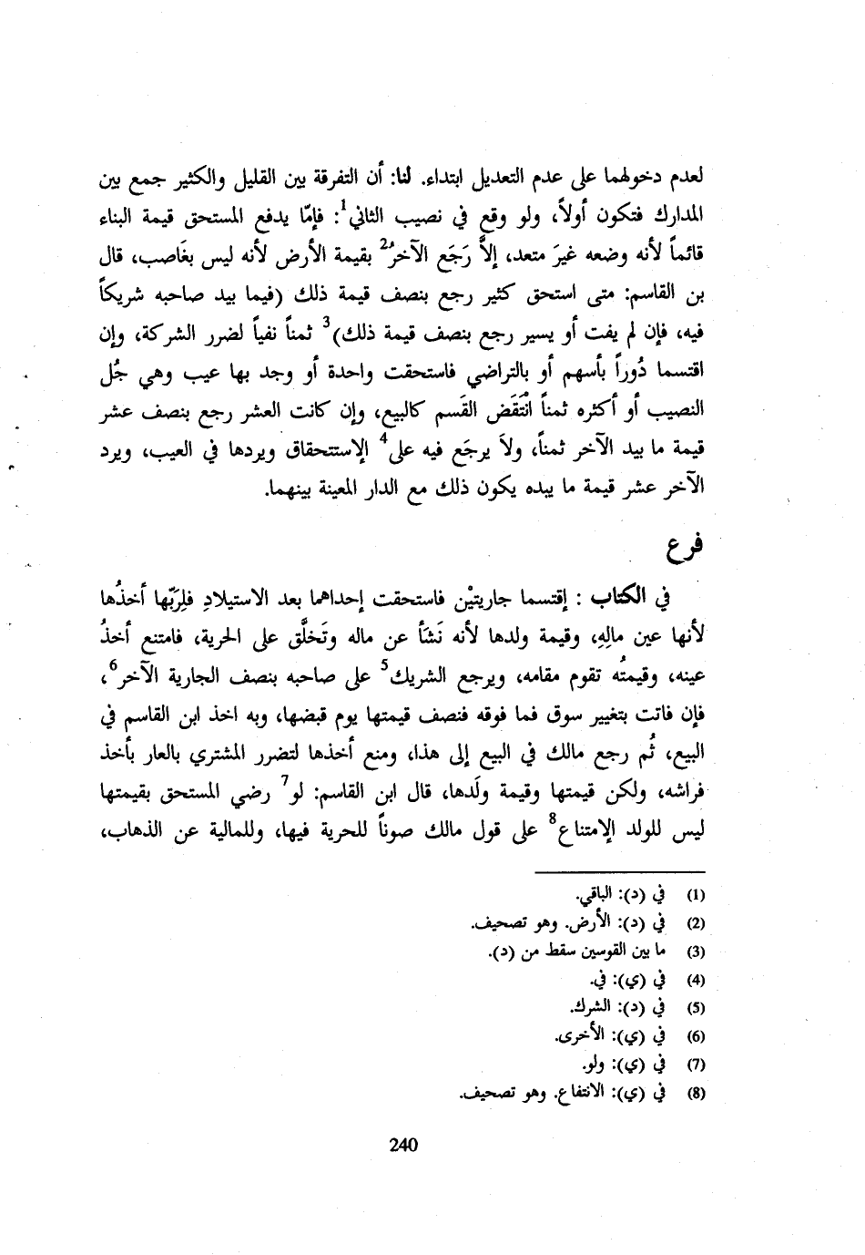 لِعَدَمِ دُخُولِهِمَا عَلَى عَدَمِ التَّعْدِيلِ ابْتِدَاءً لَنَا أَنَّ التَّفْرِقَةَ بَيْنَ الْقَلِيلِ وَالْكَثِيرِ جَمْعٌ بَيْنَ الْمَدَارِكِ فَتَكُونُ أَوَّلًا وَلَوْ وَقَعَ فِي نَصِيبِ الثَّانِي فَإِمَّا يَدْفَعُ الْمُسْتَحِقُّ قِيمَةَ الْبِنَاءِ قَائِمًا لِأَنَّهُ وَضعه غير مُتَعَدٍّ الا رَجَعَ الاخر بِقِيمَة الأَرْض لِأَنَّهُ لَيْسَ بغاصب قَالَ بن الْقَاسِمِ مَتَى اسْتَحَقَّ كَثِيرً رَجَعَ بِنِصْفِ قِيمَةِ ذَلِكَ فِيمَا بِيَدِ صَاحِبهِ شَرِيكًا فِيهِ فَإِنْ لَمْ يَفُتْ أَوْ يَسِيرً رَجَعَ بِنِصْفِ قِيمَةِ ذَلِكَ ثَمَنًا نَفْيًا لِضَرَرِ الشَّرِكَةِ وَإِنِ اقْتَسَمَا دوراً بأسهم أَوْ بِالتَّرَاضِي فَاسْتُحِقَّتْ وَاحِدَةٌ أَوْ وُجِدَ بِهَا عَيْبٌ وَهِيَ جُلُّ النَّصِيبِ أَوْ أَكْثَرُهُ ثَمَنًا انْتَقَضَ الْقَسْمُ كَالْبَيْعِ وَإِنْ كَانَتِ الْعُشْرَ رَجَعَ بِنِصْفِ عُشْرِ قَيِمَةِ مَا بِيَدِ الْآخَرِ ثَمَنًا وَلَا يَرْجِعُ فِيهِ عَلَى الِاسْتِحْقَاقِ وَيَرُدُّهَا فِي الْعَيْبِ وَيَرُدُّ الْآخَرُ عُشْرَ قِيمَةِ مَا بِيَدِهِ يكون ذَلِك مَعَ الدَّار الْمعينَة بَيْنَهُمَا