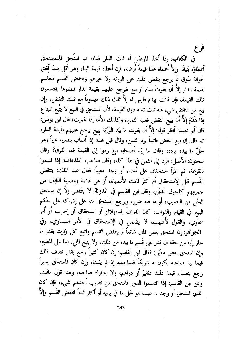 فِي الْكِتَابِ إِذَا أَخَذَ الْمُوصَى لَهُ ثُلُثَ الدَّارِ فَبَنَاهُ ثُمَّ اسْتُحِقَّ فَلِلْمُسْتَحِقِّ إِعْطَاؤُهُ بنايته وَإِلَّا أَعْطَاهُ هَذَا قِيمَةَ أَرْضِهِ فَإِنْ أَعْطَاهُ قِيمَةَ الْبِنَاءِ وَهُوَ أَقَلُّ مِمَّا أَنْفَقَ لِحَوَالَةِ سُوقٍ لَمْ يُرْجَعْ بِنَقْضِ ذَلِكَ عَلَى الْوَرَثَةِ وَلَا غَيرهم وينتقض الْقسم فيقاسم بِقِيمَة الدَّارِ إِلَّا أَنْ يَفُوتَ بِبِنَاءٍ أَوْ بَيْعٍ فَيُرْجَعَ عَلَيْهِمْ بِقِيمَةِ الدَّارِ قَبَضُوهَا يَقْتَسِمُونَ تِلْكَ الْقِيمَةَ فَإِنْ فَاتَتْ بِهَدْمٍ فَلَيْسَ لَهُ إِلَّا ثُلُثُ ذَلِكَ مَهْدُومًا مَعَ ثُلُثِ النَّقْضِ وَإِنْ بِيعَ مِنَ النَّقْضِ شَيْءٌ فَلَهُ ثُلُثُ ثَمَنِهِ دُونَ الْقِيمَةِ لِأَنَّ الْمُسْتَحِقَّ فِي الْبَيْعِ لَا يَتْبَعُ الْمُبْتَاعَ إِذَا هَدَمَ إِلَّا أَنْ يَبِيعَ النَّقْضَ فَعَلَيْهِ الثَّمَنُ وَكَذَلِكَ الْأَمَةُ إِذَا عَمِيَتْ قَال ابْنُ يُونُسَ قَال أَبُو مُحَمَّدٍ انْظُرْ قَوْلهُ إِلَّا أَنْ يَفُوتَ مَا بِيَدِ الْوَرَثَةِ بِبَيْعٍ يُرْجَعُ عَلَيْهِمْ بِقِيمَةِ الدَّارِ ثُمَّ قَال ان بيع النَّقْض قَائِما يُرَدُّ الثَّمَنُ وَقَال قَبْلَ هَذَا إِذَا أَصَابَ بِنَصِيبِهِ عَيْبًا وَهُوَ جُلُّ مَا بِيَدِهِ يَرُدُّهُ وَفَاتَ مَا بيد أَصْحَابه بيع رُدُّوا إِلَى الْقِيمَةِ فَمَا الْفَرْقُ وَقَال سَحْنُون الْأَصْلُ الرَّدُّ إِلَى الثَّمَنِ فِي هَذَا كُلِّهِ وَقَالَ صَاحب الْمُقدمَات إِذا قسموا بِالْقُرْعَةِ ثُمَّ طَرَأَ اسْتِحْقَاقٌ عَلَى أَحَدٍ أَوْ وَجَدَ مَعِيبًا فَقَال عَبْدُ الْمَلِكِ يُنْتَقَضُ الْقَسْمُ قبل الِاسْتِحْقَاقِ أَمْ كَثُرَ فَاتَتِ الْأَنْصِبَاءُ أَوْ هِيَ قَائِمَةٌ وَمُصِيبَةُ التَّالِفِ مِنْ جَمِيعِهِمْ كَلُحُوقِ الدَّيْنِ وَقَال ابْنُ الْقَاسِمِ فِي الْمُدَوَّنَةِ لَا يُنْتَقَضُ إِلَّا أَنْ يُسْتَحَقَّ الْجُلُّ مِنَ النَّصِيبِ أَوْ مَا فِيهِ ضَرَرٌ وَيَرْجِعُ الْمُسْتَحَقُّ مِنْهُ عَلَى إِشْرَاكِهِ عَلَى حُكْمِ الْبَيْعِ فِي الْقِيَامِ وَالْفَوَاتِ كَانَ الْفَوَاتُ بِاسْتِهْلَاكٍ أَوِ اسْتِحْقَاقٍ أَوِ إِخْرَابٍ أَوْ أَمْرٍ سَمَاوِيٍّ وَالْقَوْل لِأَشْهَب لَا يُضَمَّنُ فِي الِاسْتِحْقَاقِ فِي الْأَمْرِ السَّمَاوِيِّ وَفِي الْجَوَاهِر إِذَا اسْتَحَقَّ بَعْضَ الْمَالِ شَائِعًا لَمْ يُنْتَقَضِ الْقَسْمُ وَاتُّبِعَ كُلُّ وَارِثٍ بِقَدْرِ مَا حَازَ إِلَيْهِ مِنْ حَقِّهِ إِنْ قَدَرَ عَلَى قَسْمِ مَا بِيَدِهِ مِنْ ذَلِكَ وَلَا يُتْبَعُ الْمَلِيءُ بِمَا عَلَى الْمُعْدَمِ وَإِنِ اسْتُحِقَّ بَعْضٌ مُعَيَّنٌ فَقَال ابْنُ الْقَاسِمِ إِنْ كَانَ كَثِيرًا رَجَعَ بِقَدْرِ نِصْفِ ذَلِكَ فِيمَا بِيَدِ صَاحِبهِ يَكُونُ بِهِ شَرِيكًا فِيمَا بِيَدِهِ إِذَا لَمْ يَفُتْ وَإِنْ كَانَ الْمُسْتَحَقُّ يَسِيرًا رَجَعَ بِنِصْفِ قِيمَةِ ذَلِكَ دَنَانِيرَ أَوْ دَرَاهِمَ وَلَا يُشَارِكُ صَاحِبهُ وَهَذَا قَوْل مَالِك وَعَنِ ابْنِ الْقَاسِمِ إِذَا اقْتَسَمُوا الدُّورَ فَاسْتُحِقَّ مِنْ نَصِيبِ أَحَدِهِمْ شَيْءٌ فَإِنْ كَانَ الَّذِي اسْتُحِقَّ أَوْ وُجِدَ بِهِ عَيْبٌ هُوَ جُلُّ مَا فِي يَدَيْهِ أَوْ أَكْثَرُ ثَمَنًا انْتُقِضَ الْقَسْمُ وَإِلَّا