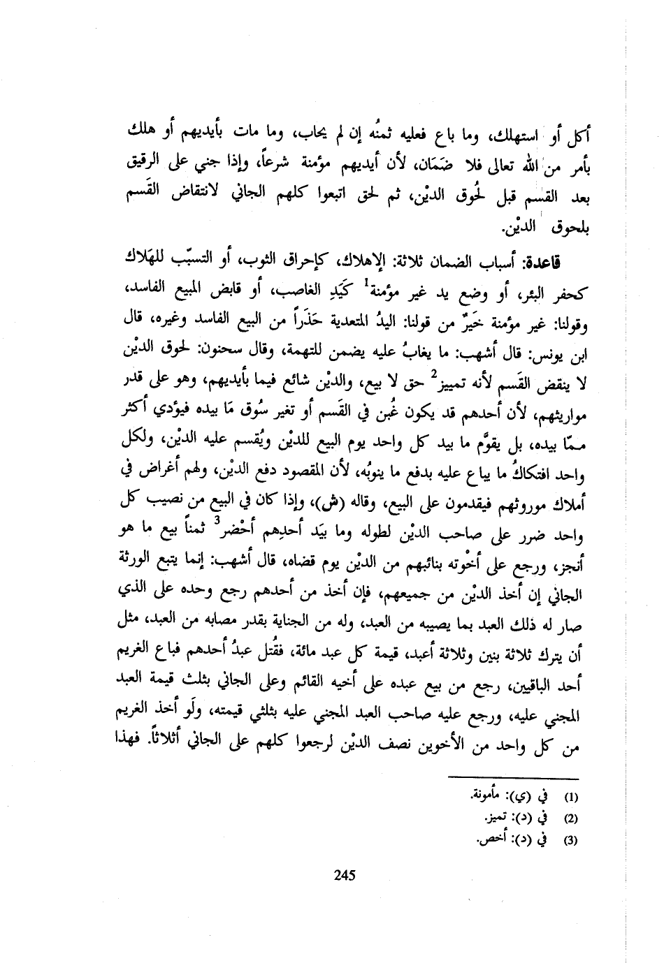 أَكَلَ أَوِ اسْتَهْلَكَ وَمَا بَاعَ فَعَلَيْهِ ثَمَنُهُ إِنْ لَمْ يُحَابِ وَمَا مَاتَ بِأَيْدِيهِمْ أَوْ هَلَكَ بِأَمْرٍ مِنَ اللَّهِ تَعَالَى فَلَا ضَمَانَ لِأَنَّ أَيْدِيَهُمْ مُؤَمَّنَةً شَرْعًا وَإِذَا جُنِيَ عَلَى الرَّقِيق بعد الْقسم قَبْلَ لُحُوقِ الدَّيْنِ ثُمَّ لَحِقَ اتَّبَعُوا كُلُّهُمُ الْجَانِيَ لِانْتِقَاضِ الْقَسْمِ بِلُحُوقِ الدَّيْنِ قَاعِدَةٌ أَسْبَابُ الضَّمَانِ ثَلَاثَةٌ الْإِهْلَاكُ كَإِحْرَاقِ الثَّوْبِ أَوِ التَّسَبُّبُ لِلْهَلَاكِ كَحَفْرِ الْبِئْرِ أَوْ وَضْعِ يَدٍ غَيْرِ مُؤَمَّنَةٍ كَيْدِ الْغَاصِبِ أَوْ قَابِضِ الْمَبِيعِ الْفَاسِدِ وَقَوْلنَا غَيْر مُؤَمَّنَةٍ خَيْرٌ مِنْ قَوْلنَا الْيَدُ المتعدية حذار مِنَ الْبَيْعِ الْفَاسِدِ وَغَيْرهِ قَال ابْنُ يُونُسَ قَال أَشْهَب مَا يُغَابُ عَلَيْهِ يُضَمَّنُ لِلتُّهْمَةِ وَقَال سَحْنُون لُحُوقُ الدَّيْنِ لَا يَنْقُضُ الْقَسْمَ لِأَنَّهُ تَمْيِيزُ حَقٍّ لَا بَيْعٍ وَالدَّيْنُ شَائِعٌ فِيمَا بِأَيْدِيهِم وَهُوَ على قدر مواريثهم لِأَنَّهُ أَحَدَهُمْ قَدْ يَكُونُ غَبِنَ فِي الْقَسْمِ أَوْ تَغَيَّرَ سُوقُ مَا بِيَدِهِ فَيُؤَدِّي أَكْثَرَ مِمَّا بِيَدِهِ بَلْ يُقَوَّمُ مَا بِيَدِ كُلِّ وَاحِدٍ يَوْمَ الْبَيْعِ لِلدَّيْنِ وَيُقَسَّمُ عَلَيْهِ الدَّيْنُ وَلِكُلِّ وَاحِدٍ افْتِكَاكُ مَا يُبَاعُ عَلَيْهِ بِدَفْعِ مَا ينوبه لِأَنَّهُ الْمَقْصُود دفع الدّين وَلَهُم أغرض فِي أَمْلَاك مُورثهم فَيُقَدَّمُونَ عَلَى الْبَيْعِ وَقَالهُ ش وَإِذَا كَانَ فِي الْبَيْعِ مِنْ نَصِيبِ كُلِّ وَاحِدٍ ضَرَرٌ عَلَى صَاحِب الدَّيْنِ لِطُولِهِ وَمَا بِيَدِ أَحَدِهِمْ أحضر ثَمَنًا بِيعَ مَا هُوَ أَنْجَزُ وَرَجَعَ عَلَى أخواته بنائهم من الدّين يَوْم قَضَاهُ قَال أَشْهَب إِنَّمَا يُتْبِعُ الْوَرَثَةُ الْجَانِيَ إِنْ أُخِذَ الدَّيْنُ مِنْ جَمِيعِهِمْ فَإِنْ أُخِذَ مِنْ أَحَدِهِمْ رَجَعَ وَحْدَهُ عَلَى الَّذِي صَارَ لَهُ ذَلِكَ الْعَبْدُ بِمَا يُصِيبُهُ مِنَ الْعَبْدِ وَلَهُ مِنَ الْجِنَايَةِ بِقَدْرِ مُصَابِهِ مِنَ الْعَبْدِ مِثْلَ أَنْ يَتْرُكَ ثَلَاثَةَ بَنِينَ وَثَلَاثَةَ أَعْبُدٍ قِيمَةُ كُلِّ عَبْدٍ مِائَةٌ فَقُتِلَ عَبْدُ أَحَدِهِمْ فَبَاعَ الْغَرِيم اُحْدُ الباقيين رَجَعَ مَنْ بِيعَ عَبْدُهُ عَلَى أَخِيهِ الْقَائِمِ وَعَلَى الْجَانِي بِثُلُثِ قِيمَةِ الْعَبْدِ الْمَجْنِيِّ عَلَيْهِ وَرَجَعَ عَلَيْهِ صَاحِب الْعَبْدِ الْمَجْنِيِّ عَلَيْهِ بِثُلُثَيْ قِيمَتِهِ وَلَوْ أَخَذَ الْغَرِيمُ مِنْ كُلِّ وَاحِدٍ من الأوخوين نِصْفَ الدَّيْنِ لَرَجَعُوا كُلُّهُمْ عَلَى الْجَانِي أَثْلَاثًا فَهَذَا