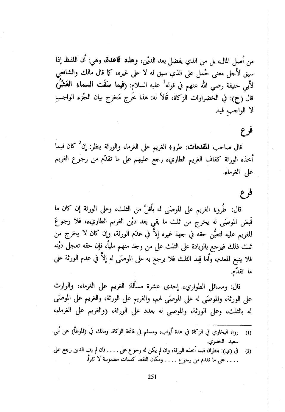 مِنْ أَصْلِ الْمَالِ بَلْ مِنَ الَّذِي يَفْضُلُ بَعْدَ الدَّيْنِ وَهَذِهِ قَاعِدَةٌ وَهِيَ أَنَّ اللَّفْظَ إِذَا سِيقَ لِأَجْلِ مَعْنًى حُمِلَ عَلَى الَّذِي سبق لَهُ لَا عَلَى غَيْرهِ كَمَا قَال مَالِك وَالشَّافِعِيّ لابي حنيفَة رَضِي الله عَنْهُم فِي قَوْله - صَلَّى اللَّهُ عَلَيْهِ وَسَلَّم َ - فِيمَا سَقَتِ السَّمَاءُ الْعُشْرُ قَال ح فِي الْخُضْرَوَاتِ الزَّكَاةُ قَالا لَهُ هَذَا خَرَجَ مَخْرَجَ بَيَانِ الْجُزْءِ الْوَاجِبِ لَا الْوَاجِبَ فِيهِ