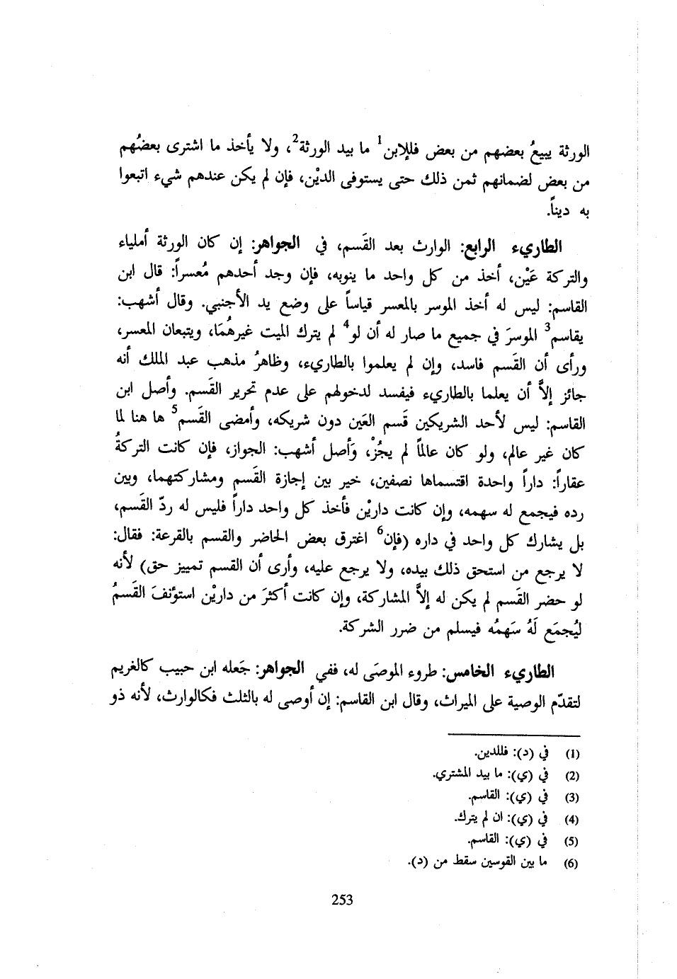 الْوَرَثَة يَبِيع بَعضهم من بعض فللإبن مَا بِيَدِ الْوَرَثَةِ وَلَا يَأْخُذُ مَا اشْتَرَى بَعْضُهُمْ مِنْ بَعْضٍ لِضَمَانِهِمْ ثَمَنَ ذَلِكَ حَتَّى يُسْتَوْفَى الدَّيْنُ فَإِنْ لَمْ يَكُنْ عِنْدَهُمْ شَيْءٌ اتَّبَعُوا بِهِ دَيْنًا الطَّارِئُ الرَّابِعُ الْوَارِثُ بَعْدَ الْقَسْمِ فِي الْجَوَاهِر ان كَانَ الْوَرَثَة أملياء والتركة عين أَخَذَ مِنْ كُلِّ وَاحِدٍ مَا يَنُوبُهُ فَإِنْ وَجَدَ أَحَدَهُمْ مُعْسِرًا قَال ابْنُ الْقَاسِمِ لَيْسَ لَهُ أَخْذُ الْمُوسِرِ بِالْمُعْسِرِ قِيَاسًا عَلَى وَضْعِ يَدِ الْأَجْنَبِيِّ وَقَال أَشْهَب يُقَاسِمُ الْمُوسِرَ فِي جَمِيع مَا صَار لَهُ ان لَو لم يتْرك الْمَيِّت غَيرهمَا ويتبعان المعسرورأى أَنَّ الْقَسْمَ فَاسِدٌ وَإِنْ لَمْ يَعْلَمُوا بِالطَّارِئِ وَظَاهِرُ مَذْهَبِ عَبْدِ الْمَلِكِ أَنَّهُ جَائِزٌ إِلَّا أَنْ يَعْلَمَا بِالطَّارِئِ فَيَفْسِدُ لِدُخُولِهِمْ عَلَى عَدَمِ تَحْرِيرِ الْقَسْمِ وَأَصْلُ ابْنِ الْقَاسِمِ لَيْسَ لِأَحَدِ الشَّرِيكَيْنِ قَسْمُ الْعَيْنِ دُونَ شَرِيكِهِ وَأَمْضَى الْقَسْمَ هَاهُنَا لَمَّا كَانَ غَيْر عَالِمٍ وَلَوْ كَانَ عَالِمًا لَمْ يَجُزْ وَأَصْلُ أَشْهَب الْجَوَازُ فَإِنْ كَانَتِ التَّرِكَةُ عَقَارًا دَارًا وَاحِدَةً اقْتَسَمَاهَا نِصْفَيْنِ خُيِّرَ بَيْنَ إِجَازَةِ الْقَسْمِ وَمُشَارَكَتِهِمَا وَبَيْنَ رَدِّهِ فَيُجْمَعُ لَهُ سَهْمُهُ وَإِنْ كَانَتْ دَارَيْنِ فَأَخَذَ كُلُّ وَاحِدٍ دَارًا فَلَيْسَ لَهُ رَدُّ الْقَسْمِ بَلْ يُشَارِكُ كُلَّ وَاحِدٍ فِي دَارِهِ فَإِنِ اغترق بعض الْحَاضِر وَالْقسم بِالْقُرْعَةِ فَقَالَ لَا يَرْجِعُ مَنِ اسْتَحَقَّ ذَلِكَ بِيَدِهِ وَلَا يُرْجَعُ عَلَيْهِ وَأَرَى أَنَّ الْقَسْمَ تَمْيِيزُ حَقٍّ لِأَنَّهُ لَو حضر الْقسم لَمْ يَكُنْ لَهُ إِلَّا الْمُشَارَكَةَ وَإِنْ كَانَتْ أَكْثَرَ مِنْ دَارَيْنِ اسْتُؤْنِفَ الْقَسْمُ لِيُجْمَعَ لَهُ سَهْمُهُ فَيَسْلَمَ مِنْ ضَرَرِ الشَّرِكَةِ الطَّارِئُ الْخَامِسُ طروء الْمُوصى لَهُ فَفِي الْجَوَاهِر جَعَلَهُ ابْنُ حَبِيب كَالْغَرِيمِ لِتَقَدُّمِ الْوَصِيَّةِ على الْمِيرَاث وَقَالَ ابْن الْقَاسِم ان أتوصى لَهُ بِالثُّلُثِ فَكَالْوَارِثِ لِأَنَّهُ ذُو