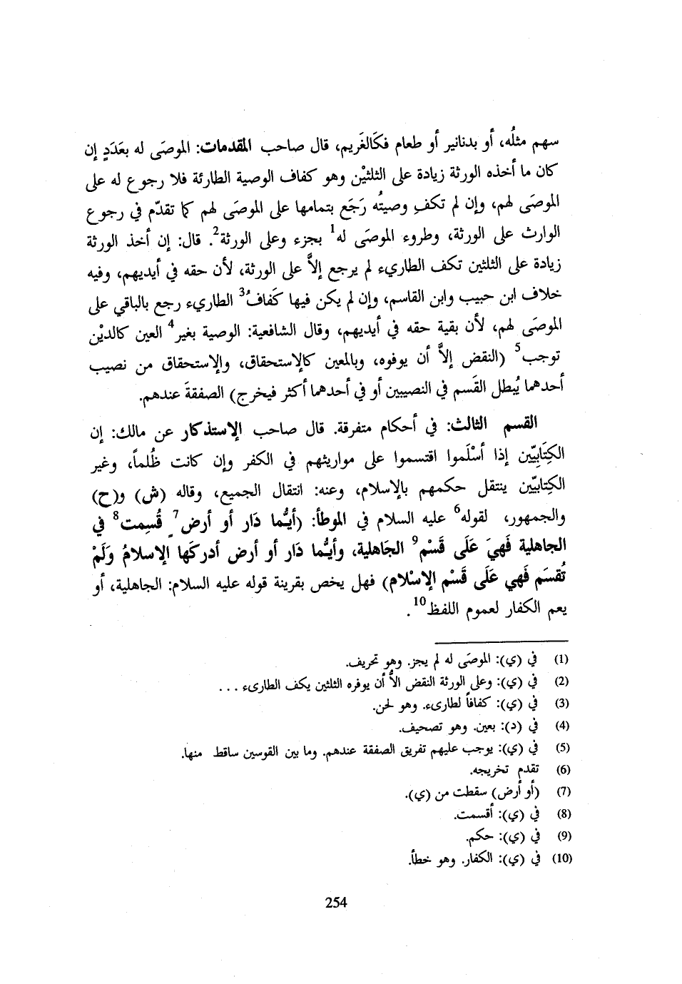 سَهْمٍ مِثْلُهُ أَوْ بِدَنَانِيرَ أَوْ طَعَامٍ فَكَالْغَرِيمِ قَال صَاحِب الْمُقَدِّمَات الْمُوصَى لَهُ بِعَدَدٍ إِنْ كَانَ مَا أَخَذَهُ الْوَرَثَةُ زِيَادَةً عَلَى الثُّلُثَيْنِ وَهُوَ كَفَافُ الْوَصِيَّةِ الطَّارِئَةِ فَلَا رُجُوعَ لَهُ عَلَى الْمُوصَى لَهُمْ وَإِنْ لَمْ تَكْفِ وَصِيَّتُهُ رَجَعَ بِتَمَامِهَا عَلَى الْمُوصَى لَهُمْ كَمَا تَقَدَّمَ فِي رُجُوعِ الْوَارِثِ عَلَى الْوَرَثَةِ وَطُرُوءِ الْمُوصَى لَهُ بِجُزْءٍ وَعَلَى الْوَرَثَةِ قَال إِنْ أَخَذَ الْوَرَثَةُ زِيَادَةً عَلَى الثُّلُثَيْنِ تَكْفِ الطَّارِئُ لَمْ يَرْجِعْ إِلَّا عَلَى الْوَرَثَةِ لِأَنَّ حَقَّهُ فِي أَيْدِيهِمْ وَفِيهِ خِلَافُ ابْنُ حَبِيب وَابْنُ الْقَاسِمِ وَإِنْ لَمْ يَكُنْ فِيهَا كَفَافُ الطَّارِئِ رَجَعَ بِالْبَاقِي عَلَى الْمُوصَى لَهُمْ لِأَنَّ بَقِيَّةَ حَقِّهِ فِي أَيْديهم وَقَالَ الشَّافِعِيَّة الْوَصِيَّة بِغَيْر الْعين كَالدَّيْنِ تُوجِبُ النَّقْضَ إِلَّا أَنْ يُوَفُّوهُ وَبِالْمُعَيَّنِ كَالِاسْتِحْقَاقِ وَالِاسْتِحْقَاقُ مِنْ نَصِيبِ أَحَدِهِمَا يُبْطِلُ الْقَسْمَ فِي النَّصِيبَيْنِ أَوْ فِي أَحَدِهِمَا أَكْثَرُ فَيَخْرُجُ الصَّفْقَةَ عِنْدَهُمْ الْقِسْمُ الثَّالِثُ فِي أَحْكَامٍ مُتَفَرِّقَةٍ قَالَ صَاحب الإستذكار عَن مَالك ان الْكِتَابَيْنِ إِذَا أَسْلَمُوا اقْتَسَمُوا عَلَى مَوَارِيثِهِمْ فِي الْكُفْرِ وان كَانَت ظلما وَغير الْكِتَابَيْنِ يَنْتَقِلُ حُكْمُهُمْ بِالْإِسْلَامِ وَعَنْهُ انْتِقَال الْجَمِيعِ وَقَالهُ ش وح وَالْجُمْهُور لقَوْله - صَلَّى اللَّهُ عَلَيْهِ وَسَلَّم َ - فِي الْمُوَطَّأ أَيّمَا دَار أَو أَرض قسمت فِي الْجَاهِلِيَّةِ فَهِيَ عَلَى قَسْمِ الْجَاهِلِيَّةِ وَأَيُّمَا دَار أَو ارْض ادركهما الْإِسْلَام وَلم تقسم فَهِيَ على قسم الْإِسْلَام فَهَل يخص بقرينه قَوْله - صَلَّى اللَّهُ عَلَيْهِ وَسَلَّم َ - الْجَاهِلِيَّةِ أَوْ يَعُمُّ الْكُفَّارَ لِعُمُومِ اللَّفْظِ