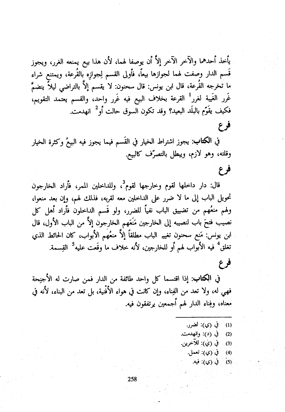 يَأْخُذ أَحَدَهُمَا وَالْآخَرُ الْآخَرَ إِلَّا أَنْ يُوصَفَا لَهُمَا لِأَنَّ هَذَا بَيْعٌ يَمْنَعُهُ الْغَرَرُ وَيَجُوزُ قَسْمُ الدَّارِ وُصِفَتْ لَهُمَا لِجَوَازِهَا بَيْعًا فَأَوْلَى الْقَسْمُ لِجَوَازِهِ بِالْقُرْعَةِ وَيُمْتَنَعُ شِرَاءُ مَا تُخْرِجُهُ الْقُرْعَةُ قَال ابْنُ يُونُسَ قَال سَحْنُون لَا يُقَسَّمُ الا بِالتَّرَاضِي لَيْلًا يَنْضَمَّ غَرَرُ الْغَيْبَةِ لِغَرَرِ الْقُرْعَةِ بِخِلَافِ الْبَيْعِ فِيهِ غَرَرٌ وَاحِدٌ وَالْقَسْمُ يَعْتَمِدُ التَّقْوِيمَ فَكَيْفَ يَقُومُ بِالْبَلَدِ الْبَعِيدِ وَقَدْ تَكُونُ السُّوقُ حَالَتْ أَو انْهَدَمت