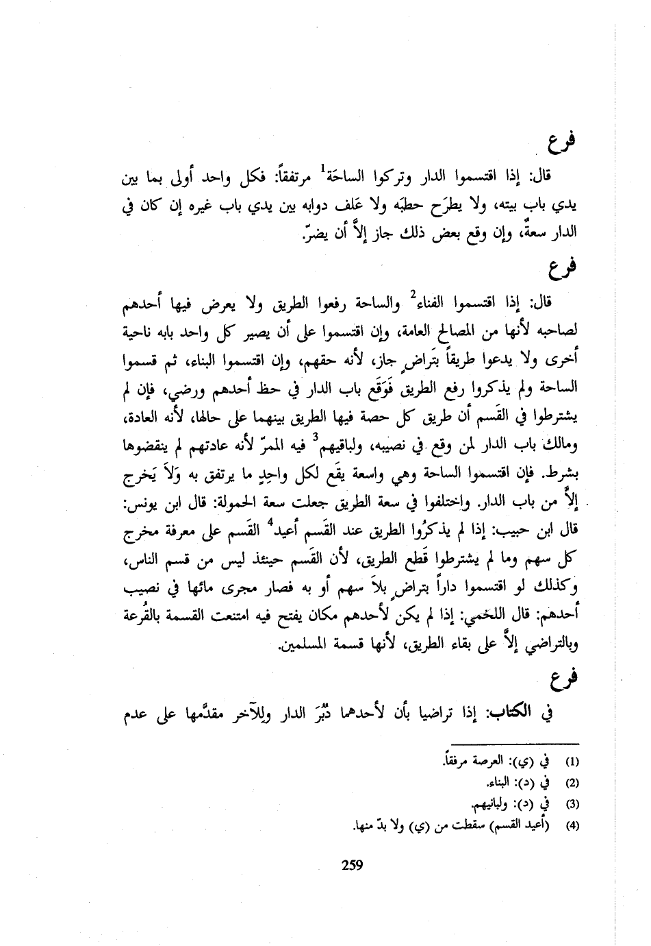 قَال إِذَا اقْتَسَمُوا الْفِنَاءَ وَالسَّاحَةَ رَفَعُوا الطَّرِيقَ وَلَا يَعْرِضُ فِيهَا أَحَدُهُمْ لِصَاحِبهِ لِأَنَّهَا مِنَ الْمَصَالِحِ الْعَامَّةِ وَإِنِ اقْتَسَمُوا عَلَى أَنْ يُصَيِّرَ كُلُّ وَاحِدٍ بَابَهُ نَاحِيَةً أُخْرَى وَلَا يَدَعُوا طَرِيقًا بِتَرَاضٍ جَازَ لِأَنَّهُ حَقُّهُمْ وَإِنِ اقْتَسَمُوا الْبِنَاءَ ثُمَّ قَسَّمُوا السَّاحَةَ وَلَمْ يَذْكُرُوا رَفْعَ الطَّرِيقِ فَوَقَعَ بَابُ الدَّارِ فِي حَظِّ أَحَدِهِمْ وَرَضِيَ فَإِنْ لَمْ يَشْتَرِطُوا فِي الْقَسْمِ أَنَّ طَرِيقَ كل حِصَّة فِيهَا الطَّرِيق بَينهمَا على حَالهَا لانه الْعَادة وَمَالك بَابِ الدَّارِ لِمَنْ وَقَعَ فِي نَصِيبِهِ وَلِبَاقِيهِمْ فِيهِ الْمَمَرُّ لِأَنَّهُ عَادَتُهُمْ لَمْ يَنْقُضُوهَا بِشَرْطٍ فَإِنِ اقْتَسَمُوا السَّاحَةَ وَهِيَ وَاسِعَةٌ يَقَعُ لِكُلِّ وَاحِدٍ مَا يَرْتَفِقُ بِهِ وَلَا يَخْرُجُ إِلَّا مِنْ بَابِ الدَّارِ وَاخْتَلَفُوا فِي سِعَةِ الطَّرِيقِ جُعِلَتْ سِعَةَ الْحُمُولَةِ قَالَ ابْنُ يُونُسَ قَالَ ابْنُ حَبِيبٍ إِذَا لَمْ يَذْكُرُوا الطَّرِيقَ عِنْدَ الْقَسْمِ أُعِيدَ الْقَسْمُ عَلَى مَعْرِفَةِ مَخْرَجِ كُلِّ سهم وَمَا لَمْ يَشْتَرِطُوا قَطْعَ الطَّرِيقِ لِأَنَّ الْقَسْمَ حِينَئِذٍ لَيْسَ مِنْ قَسْمِ النَّاسِ وَكَذَلِكَ لَوِ اقْتَسَمُوا دَارًا بِتَرَاضٍ بِلَا سَهْمٍ أَوْ بِهِ فَصَارَ مَجْرَى مَائِهَا فِي نَصِيبِ أَحَدِهِمْ قَال الْلَخْمِيّ إِذَا لَمْ يَكُنْ لِأَحَدِهِمْ مَكَانٌ يَفْتَحُ فِيهِ امْتُنِعَتِ الْقِسْمَةُ بِالْقُرْعَةِ وَبِالتَّرَاضِي إِلَّا عَلَى بَقَاءِ الطَّرِيقِ لِأَنَّهَا قِسْمَةُ الْمُسْلِمِينَ