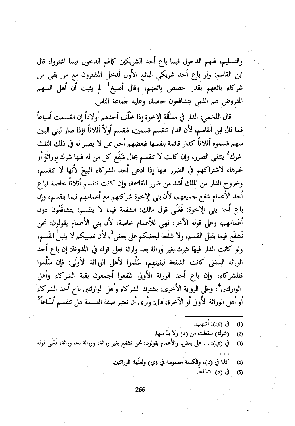 وَالتَّسْلِيمُ فَلَهُمُ الدُّخُولُ فِيمَا بَاعَ أَحَدُ الشَّرِيكَيْنِ كَمَا لَهُمُ الدُّخُولُ فِيمَا اشْتَرَوْا قَال ابْنُ الْقَاسِمِ وَلَوْ بَاعَ أَحَدُ شَرِيكَيِ الْبَائِعِ الْأَوَّلِ لدُخُول الْمُشْتَرُونَ مَعَ مَنْ بَقِيَ مِنْ شُرَكَاءِ بَائِعِهِمْ بِقَدْرِ حِصَصِ بَائِعِهِمْ وَقَال أَصْبَغُ لَمْ يَثْبُتْ أَنَّ أَهْلَ السَّهْمِ الْمَفْرُوضِ هُمُ الَّذِينَ يَتَشَافَعُونَ خَاصَّةً وَعَلَيْهِ جَمَاعَةُ النَّاسِ قَال الْلَخْمِيّ الدَّارُ فِي مَسْأَلَةِ الْإِخْوَةِ إِذَا خَلَّفَ أَحَدُهُمْ أَوْلَادًا إِنِ انْقَسَمَتْ أَسْبَاعًا فَمَا قَال ابْنُ الْقَاسِمِ لِأَنَّ الدَّارَ تَنْقَسِمُ قِسْمَيْنِ فَتُقَسَّمُ أَوَّلًا أَثْلَاثًا فاذا صَار لبني الْبَنِينَ سهم قَسَّمُوهُ أَثْلَاثًا كَدَارٍ قَائِمَةٍ بِنَفْسِهَا فَبَعْضُهُمْ أَحَقُّ مِمَّنْ لَا يَصِيرُ لَهُ فِي ذَلِكَ الثُّلُثُ شِرْكٌ يَنْتَفِي الضَّرَرُ وَإِنْ كَانَتْ لَا تَنْقَسِمُ بِحَالٍ شَفَعَ كُلُّ مَنْ لَهُ فِيهَا شِرْكٌ بوارثة أَوْ غَيْرهَا لِاشْتِرَاكِهِمْ فِي الضَّرَرِ فِيهَا إِذَا ادَّعَى أَحَدُ الشُّرَكَاءِ الْبَيْعَ لِأَنَّهَا لَا تَنْقَسِمُ وَخُرُوجُ الدَّارِ مِنَ الْمِلْكِ أَشَدُّ مِنْ ضَرَرِ الْمُقَاسَمَةِ وَإِنْ كَانَتْ تَنْقَسِمُ أَثْلَاثًا خَاصَّةً فَبَاعَ أَحَدُ الْأَعْمَامِ شَفَعَ جَمِيعُهُمْ لِأَنَّ بَنِي الْإِخْوَةِ شَرِكَتُهُمْ مَعَ أَعْمَامِهِمْ فِيمَا يَنْقَسِمُ وَإِنْ بَاعَ أَحَدُ بَنِي الْإِخْوَةِ فَعَلَى قَوْل مَالِك الشُّفْعَةُ فِيمَا لَا يَنْقَسِمُ يَتَشَافَعُونَ دُونَ أَعْمَامِهِمْ وَعَلَى قَوْلهِ الْآخَرِ فَهِيَ لِلْأَعْمَامِ خَاصَّةً لِأَنَّ بَنِي الْأَعْمَامِ يَقُولُونَ نَحْنُ نَشْفَعُ فِيمَا يَقْبَلُ الْقَسْمَ وَلَا شُفْعَةَ لِبَعْضِكُمْ عَلَى بَعْضٍ لِأَنَّ نَصِيبَكُمْ لَا يَقْبَلُ الْقَسْمَ وَلَوْ كَانَتِ الدَّارُ فِيهَا شرك بِغَيْر وَارثه بعد وَارثه فَعَلَى قَوْلهِ فِي الْمُدَوَّنَةِ إِنْ بَاعَ أَحَدُ الْوَرَثَة السُّفْلى كَانَت الشُّفْعَة لبقيتهم سلمُوا لأهل الوارثة الْأُولَى فَإِنْ سَلَّمُوا فَلِلشُّرَكَاءِ وَإِنْ بَاعَ أَحَدُ الْوَرَثَةِ الْأُولَى شَفَعُوا أَجْمَعُونَ بَقِيَّةُ الشُّرَكَاءِ وَأَهْلُ الوارثتين وعَلى الرِّوَايَة الْأُخْرَى يشْتَرك الشُّرَكَاء واهل الوارثتين بَاعَ اُحْدُ الشُّرَكَاء أَو اهل الوارثة الْأُولَى أَوِ الْآخِرَةِ قَال وَأَرَى أَنْ تُعْتَبَرَ صِفَةُ الْقِسْمَةِ هَلْ تَنْقَسِمُ أَسْبَاعًا