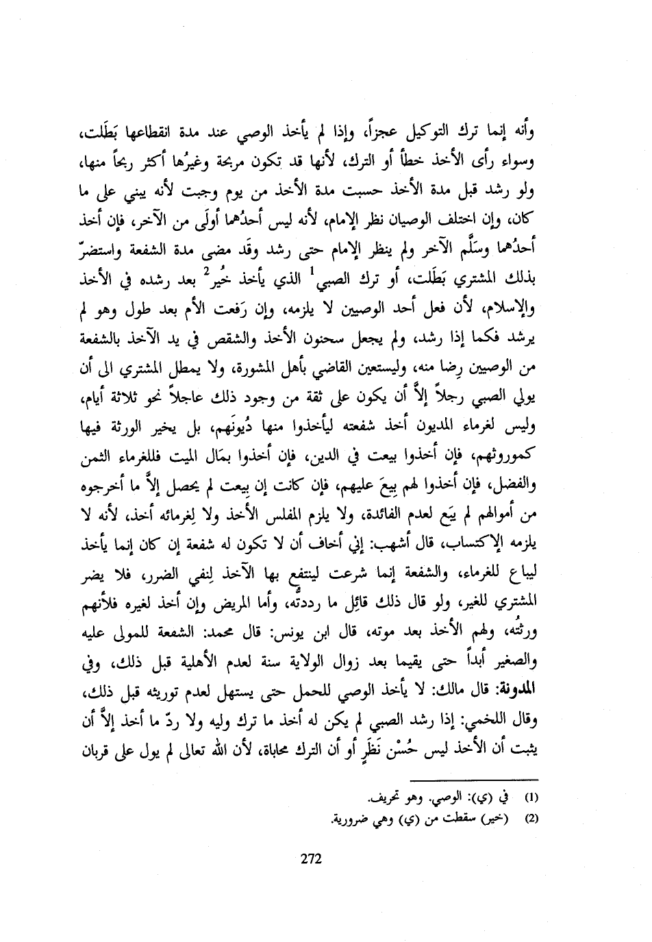 وَأَنَّهُ إِنَّمَا تَرَكَ التَّوْكِيلَ عَجْزًا وَإِذَا لَمْ يَأْخُذِ الْوَصِيُّ عِنْدَ مُدَّةِ انْقِطَاعِهَا بَطَلَتْ وَسَوَاءٌ رَأَى الْأَخْذَ خَطَأً أَوِ التَّرْكَ لِأَنَّهَا قَدْ تَكُونُ مُرْبِحَةً وَغَيْرهَا أَكْثَرُ رِبْحًا مِنْهَا وَلَوْ رَشَدَ قَبْلَ مُدَّةِ الْأَخْذِ حُسِبَتْ مُدَّةُ الْأَخْذِ مِنْ يَوْمِ وَجَبَتْ لِأَنَّهُ يَبْنِي عَلَى مَا كَانَ وَإِنِ اخْتَلَفَ الْوَصِيَّانِ نَظَرَ الْإِمَامُ لِأَنَّهُ لَيْسَ أَحَدُهُمَا أَوْلَى مِنَ الْآخَرِ فَإِنْ أَخَذَ أَحَدُهُمَا وَسَلَّمَ الْآخَرُ وَلَمْ يَنْظُرِ الْإِمَامُ حَتَّى رَشَدَ وَقَدْ مَضَى مُدَّةُ الشُّفْعَةِ وَاسْتَضَرَّ بِذَلِكَ الْمُشْتَرِي بَطَلَتْ أَوْ تُرِكَ الصَّبِيُّ الَّذِي يَأْخُذُ خُيِّرَ بَعْدَ رُشْدِهِ فِي الْأَخْذِ وَالْإِسْلَامِ لِأَنَّ فِعْلَ أَحَدِ الْوَصِيَّيْنِ لَا يَلْزَمُهُ وَإِنْ رَفَعَتِ الْأُمُّ بَعْدَ طُولٍ وَهُوَ لَمْ يَرْشُدْ فَكَمَا إِذَا رَشَدَ وَلَمْ يَجْعَلْ سَحْنُون الْأَخْذَ وَالشِّقْصَ فِي يَدِ الْآخِذِ بِالشُّفْعَةِ مِنَ الْوَصِيَّيْنِ رِضًا مِنْهُ وليستعين الْقَاضِي بِأَهْلِ الْمَشُورَةِ وَلَا يَمْطُلُ الْمُشْتَرِي إِلَى أَنْ يُوَلِّيَ الصَّبِيُّ رَجُلًا إِلَّا أَنْ يَكُونَ عَلَى ثِقَةٍ مِنْ وُجُودِ ذَلِكَ عَاجِلًا نَحْوَ ثَلَاثَةِ أَيَّامٍ وَلَيْسَ لِغُرَمَاءِ الْمَدْيُونِ أَخْذُ شُفْعَتِهِ لِيَأْخُذُوا مِنْهَا دُيُونَهُمْ بَلْ يُخَيَّرُ الْوَرَثَةُ فِيهَا كَمُورُوثِهِمْ فَإِنْ أَخَذُوا بِيعَتْ فِي الدَّيْنِ فَإِنْ أَخَذُوا بِمَالِ الْمَيِّتِ فَلِلْغُرَمَاءِ الثَّمَنُ وَالْفَضْلُ فَإِنْ أَخَذُوا لَهُمْ بِيعَ عَلَيْهِمْ فَإِنْ كَانَتْ إِنْ بِيعَتْ لَمْ يَحْصُلْ إِلَّا مَا أَخْرَجُوهُ مِنْ أَمْوَالِهِمْ لَمْ يَبِعْ لِعَدَمِ الْفَائِدَةِ وَلَا يَلْزَمُ الْمُفْلِسَ الْأَخْذُ وَلَا لِغُرَمَائِهِ أَخْذٌ لِأَنَّهُ لَا يَلْزَمُهُ الِاكْتِسَابُ قَال أَشْهَب إِنِّي أَخَافُ أَنْ لَا تَكُونَ لَهُ شُفْعَةٌ إِنْ كَانَ إِنَّمَا يَأْخُذُ لِيُبَاعَ لِلْغُرَمَاءِ وَالشُّفْعَةُ إِنَّمَا شُرِّعَتْ لِيَنْتَفِعَ بِهَا الْآخِذُ لِنَفْيِ الضَّرَرِ فَلَا يَضُرُّ الْمُشْتَرِيَ لِلْغَيْر وَلَوْ قَال ذَلِكَ قَائِلٌ مَا رَدَدْتُهُ وَأَمَّا الْمَرِيضُ وَإِنْ أَخَذَ لِغَيْرهِ فَلِأَنَّهُمْ وَرَثَتُهُ وَلَهُمُ الْأَخْذُ بَعْدَ مَوْتِهِ قَال ابْنُ يُونُسَ قَال مُحَمَّدٌ الشُّفْعَةُ لِلْمُوَلَّى عَلَيْهِ وَالصَّغِيرِ أَبَدًا حَتَّى يُقِيمَا بَعْدَ زَوَالِ الْوِلَايَةِ سَنَةً لِعَدَمِ الْأَهْلِيَّةِ قَبْلَ ذَلِكَ وَفِي الْمُدَوَّنَةِ قَال مَالِك لَا يَأْخُذُ الْوَصِيُّ لِلْحَمْلِ حَتَّى يَسْتَهِلَّ لِعَدَمِ تَوْرِيثِهِ قَبْلَ ذَلِكَ وَقَال الْلَخْمِيّ إِذَا رَشَدَ الصَّبِيُّ لَمْ يَكُنْ لَهُ أَخْذُ مَا تَرَكَ وَلِيُّهُ وَلَا رَدُّ مَا أَخَذَ إِلَّا أَنْ يُثْبِتَ أَنَّ الْأَخْذَ لَيْسَ حُسْنَ نَظَرٍ أَوْ أَنَّ التَّرْكَ مُحَابَاةٌ لِأَنَّ اللَّهَ تَعَالَى لَمْ يول على قرْبَان