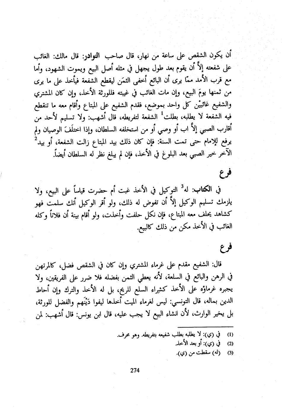 أَنْ يَكُونَ الشِّقْصُ عَلَى سَاعَةٍ مِنْ نَهَارٍ قَالَ صَاحِبُ النَّوَادِرِ قَالَ مَالِكٌ الْغَائِبُ عَلَى شُفْعَتِهِ إِلَّا أَنْ يَقُومَ بَعْدَ طُولٍ يُجْهَلُ فِي مِثْلِهِ أَصْلُ الْبَيْعِ وَيَمُوتُ الشُّهُودُ وَأَمَّا مَعَ قُرْبِ الْأَمَدِ مِمَّا يَرَى أَنَّ الْبَائِعَ أَخْفَى الثَّمَنَ لِيَقْطَعَ الشُّفْعَةَ فَيَأْخُذُ عَلَى مَا يَرَى مِنْ ثَمَنِهَا يَوْمَ الْبَيْعِ وَإِنْ مَاتَ الْغَائِبُ فِي غَيْبَتِهِ فَلِلْوَرَثَةِ الْأَخْذُ وَإِنْ كَانَ الْمُشْتَرِي وَالشَّفِيعُ غَائِبَيْنِ كُلُّ وَاحِدٍ بِمَوْضِعٍ فَقَدِمَ الشَّفِيعُ عَلَى الْمُبْتَاعِ وَأَقَامَ مَعَهُ مَا تَنْقَطِعُ فِيهِ الشُّفْعَة لَا يُبطلهُ بَطَلَتِ الشُّفْعَةُ لِتَفْرِيطِهِ قَالَ أَشْهَبُ وَلَا تَسْلِيمَ لِأَحَدٍ مِنْ أَقَارِبِ الصَّبِيِّ إِلَّا أَبٌ أَوْ وَصِيٌّ أَوْ مَنِ اسْتَخْلَفَهُ السُّلْطَانُ وَإِذَا اخْتَلَفَ الْوَصِيَّانِ وَلَمْ يُرْفَعْ لِلْإِمَامِ حَتَّى تَمَّتِ السَّنَةُ فَإِنْ كَانَ ذَلِكَ بِيَدِ الْمُبْتَاعِ زَالَتِ الشُّفْعَةُ أَوْ بِيَدِ الْآخَرِ خُيِّرَ الصَّبِيُّ بَعْدَ الْبُلُوغِ فِي الْأَخْذِ فَإِنْ لَمْ يَبْلُغْ نَظَرَ لَهُ السُّلْطَانُ أَيْضًا