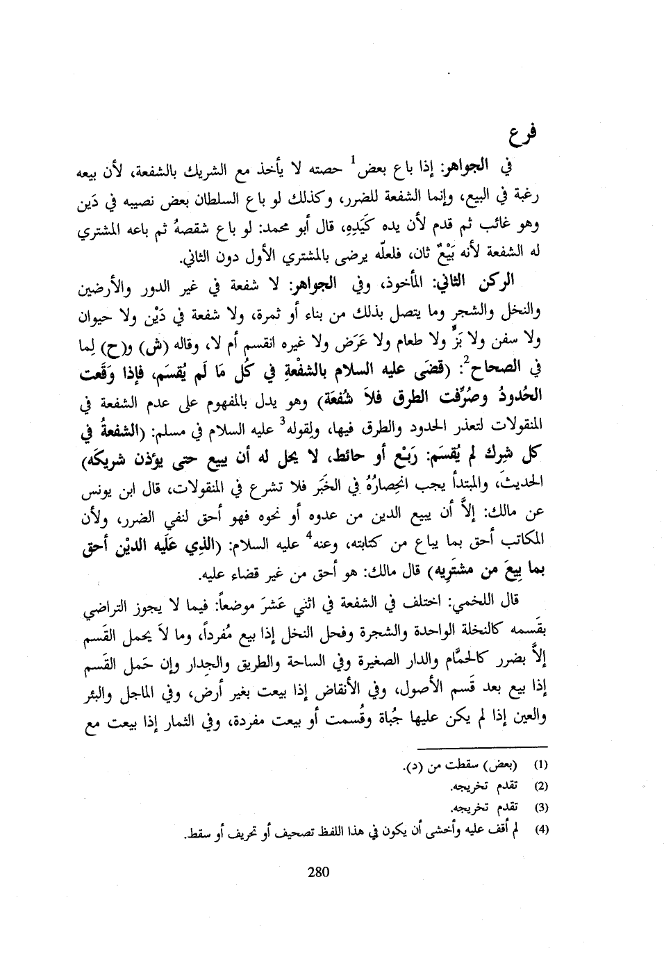 فِي الْجَوَاهِرِ إِذَا بَاعَ بَعْضَ حِصَّتِهِ لَا يَأْخُذُ مَعَ الشَّرِيكِ بِالشُّفْعَةِ لِأَنَّ بَيْعَهُ رَغْبَةٌ فِي الْبَيْعِ وَإِنَّمَا الشُّفْعَةُ لِلضَّرَرِ وَكَذَلِكَ لَوْ بَاعَ السُّلْطَانُ بَعْضَ نَصِيبِهِ فِي دَيْنٍ وَهُوَ غَائِبٌ ثُمَّ قَدِمَ لِأَنَّ يَدَهُ كَيَدِهِ قَالَ أَبُو مُحَمَّدٍ لَوْ بَاعَ شِقْصَهُ ثُمَّ بَاعَهُ الْمُشْتَرِي لَهُ الشُّفْعَةُ لِأَنَّهُ بَيْعٌ ثَانٍ فَلَعَلَّهُ يَرْضَى بِالْمُشْتَرِي الْأَوَّلِ دُونَ الثَّانِي الرُّكْن الثَّانِي الْمَأْخُوذ وَفِي الْجَوَاهِرِ لَا شُفْعَةَ فِي غَيْرِ الدُّورِ وَالْأَرَضِينَ وَالنَّخْلِ وَالشَّجَرِ وَمَا يَتَّصِلُ بِذَلِكَ مِنْ بِنَاءٍ أَوْ ثَمَرَةٍ وَلَا شُفْعَةَ فِي دَيْنٍ وَلَا حَيَوَانٍ وَلَا سُفُنٍ وَلَا بَزٍّ وَلَا طَعَامٍ وَلَا عَرَضٍ وَلَا غَيْرِهِ انْقَسَمَ أَمْ لَا وَقَالَهُ ش وح لما فِي الصِّحَاح قضى - صَلَّى اللَّهُ عَلَيْهِ وَسَلَّم َ - بِالشُّفْعَة فِي كل مَا لم يقسم فَإِذا وَقَعَتِ الْحُدُودُ وَصُرِّفَتِ الطَّرْقُ فَلَا شُفْعَةَ وَهُوَ يَدُلُّ بِالْمَفْهُومِ عَلَى عَدَمِ الشُّفْعَةِ فِي الْمَنْقُولَاتِ لتعذر الْحُدُود والطرق فِيهَا وَلقَوْله - صَلَّى اللَّهُ عَلَيْهِ وَسَلَّم َ - فِي مُسْلِمٍ الشُّفْعَةُ فِي كُلِّ شِرْكٍ لَمْ يقسم ربع أَو حَائِط لَا يحل لَهُ أَنْ يَبِيعَ حَتَّى يُؤْذِنَ شَرِيكَهُ الْحَدِيثَ وَالْمُبْتَدَأُ يَجِبُ انْحِصَارُهُ فِي الْخَبَرِ فَلَا تُشْرَعُ فِي الْمَنْقُولَاتِ قَالَ ابْنُ يُونُسَ عَنْ مَالِكٍ إِلَّا أَنْ يَبِيعَ الدَّيْنَ مِنْ عَدُوِّهِ أَوْ نَحْوَهُ فَهُوَ أَحَقُّ لِنَفْيِ الضَّرَرِ وَلِأَنَّ الْمُكَاتَبَ أَحَقُّ بِمَا يُبَاع من كِتَابَته وَعنهُ - صَلَّى اللَّهُ عَلَيْهِ وَسَلَّم َ - الَّذِي عَلَيْهِ الدَّيْنُ أَحَقُّ بِمَا بِيعَ مِنْ مُشْتَرِيهِ قَالَ مَالِكٌ هُوَ أَحَقُّ مِنْ غَيْرِ قَضَاءٍ عَلَيْهِ قَالَ الْلَخْمِيُّ اخْتُلِفَ فِي الشُّفْعَةِ فِي اثْنَيْ عَشَرَ مَوْضِعًا فِيمَا لَا يَجُوزُ التَّرَاضِي بِقَسْمِهِ كَالنَّخْلَةِ الْوَاحِدَةِ وَالشَّجَرَةِ وَفَحْلِ النَّخْلِ إِذا بيع مُفردا وَمَا لَا يَحْمِلُ الْقَسْمَ إِلَّا بِضَرَرٍ كَالْحَمَّامِ وَالدَّارِ الصَّغِيرَةِ وَفِي السَّاحَةِ وَالطَّرِيقِ وَالْجِدَارِ وَإِنْ حَمَلَ الْقَسْمَ إِذَا بِيعَ بَعْدَ قَسْمِ الْأُصُولِ وَفِي الْأَنْقَاضِ إِذَا بِيعَتْ بِغَيْرِ أَرْضٍ وَفِي الْمَاجِلِ وَالْبِئْرِ وَالْعَيْنِ إِذَا لَمْ يَكُنْ عَلَيْهَا جُبَاةٌ وَقُسِّمَتْ أَوْ بِيعَتْ مُفْرَدَةً وَفِي الثِّمَارِ إِذَا بِيعَتْ مَعَ
