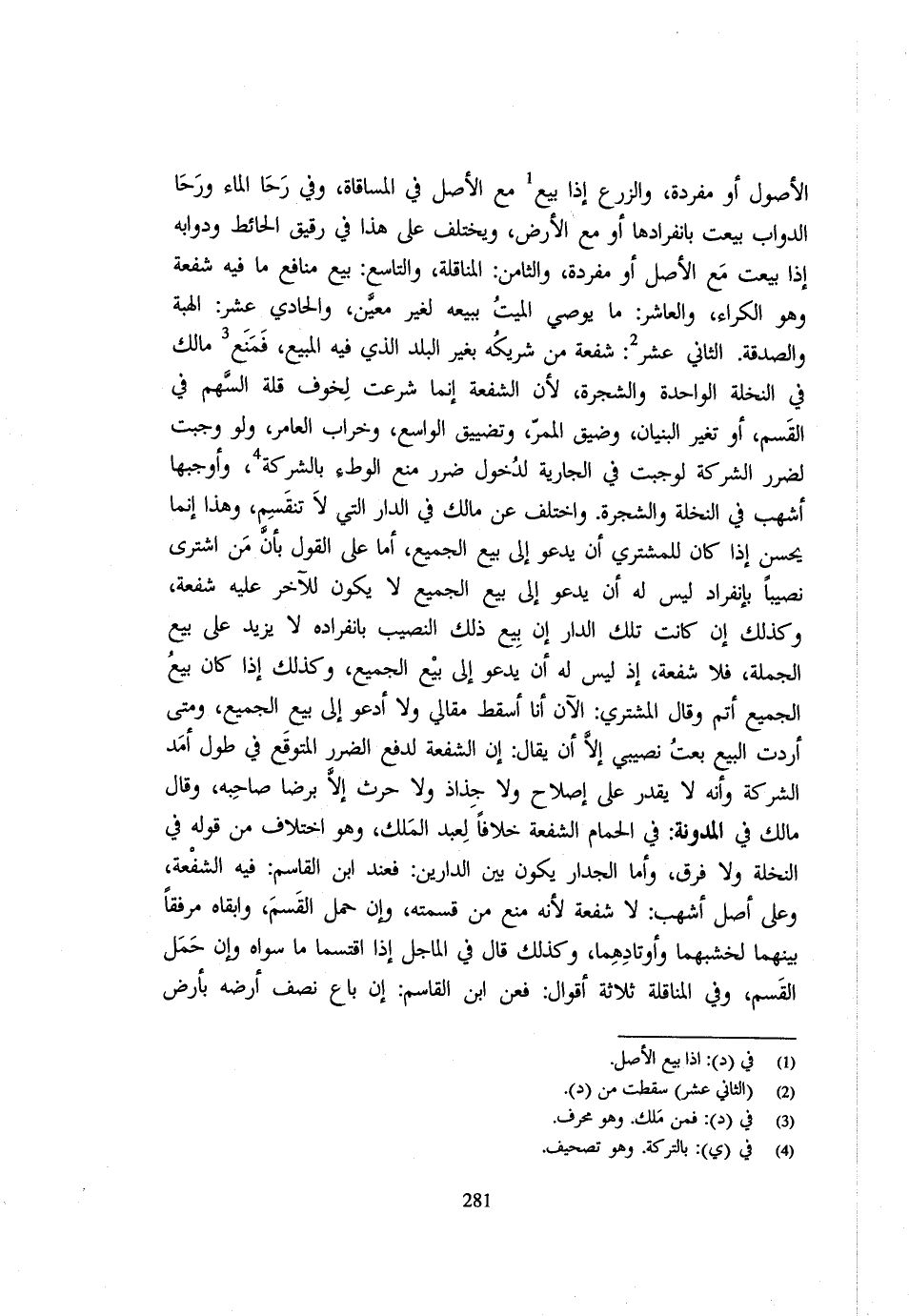 الْأُصُولِ أَوْ مُفْرَدَةً وَالزَّرْعِ إِذَا بِيعَ مَعَ الْأَصْلِ فِي الْمُسَاقَاةِ وَفِي رَحَا الْمَاءِ وَرَحَا الدَّوَابِّ بِيعَتْ بِانْفِرَادِهَا أَوْ مَعَ الْأَرْضِ وَيُخْتَلَفُ عَلَى هَذَا فِي رَقِيقِ الْحَائِطِ وَدَوَابِّهِ إِذَا بِيعَتْ مَعَ الْأَصْلِ أَوْ مُفْرَدَةً وَالثَّامِنُ الْمُنَاقَلَةُ وَالتَّاسِعُ بَيْعُ مَنَافِعِ مَا فِيهِ شُفْعَةٌ وَهُوَ الْكِرَاءُ وَالْعَاشِرُ مَا يُوصِي الْمَيِّتُ بِبَيْعِهِ لِغَيْرِ مُعَيَّنٍ وَالْحَادِي عَشَرَ الْهِبَةُ وَالصَّدَقَةُ الثَّانِي عَشَرَ شُفْعَةُ مَنْ شَرِيكُهُ بِغَيْرِ الْبَلَدِ الَّذِي فِيهِ الْمَبِيعُ فَمَنَعَ مَالِكٌ فِي النَّخْلَةِ الْوَاحِدَةِ وَالشَّجَرَةِ لِأَنَّ الشُّفْعَةَ إِنَّمَا شُرِّعَتْ لِخَوْفِ قِلَّةِ السَّهْمِ فِي الْقَسْمِ أَوْ تَغَيُّرِ الْبُنْيَانِ وَضِيقِ الْمَمَرِّ وَتَضْيِيقِ الْوَاسِعِ وَخَرَابِ الْعَامِرِ وَلَوْ وَجَبَتْ لِضَرَرِ الشَّرِكَةِ لَوَجَبَتْ فِي الْجَارِيَةِ لِدُخُولِ ضَرَرِ مَنْعِ الْوَطْءِ بِالشَّرِكَةِ وَأَوْجَبَهَا أَشْهَبُ فِي النَّخْلَةِ وَالشَّجَرَةِ وَاخْتُلِفَ عَنْ مَالِكٍ فِي الدَّارِ الَّتِي لَا تَنْقَسِمُ وَهَذَا إِنَّمَا يَحْسُنُ إِذَا كَانَ لِلْمُشْتَرِي أَنْ يَدْعُوَ إِلَى بَيْعِ الْجَمِيعِ أَمَّا عَلَى الْقَوْلِ بِأَنَّ مَنِ اشْتَرَى نَصِيبًا بِانْفِرَادٍ لَيْسَ لَهُ أَنْ يَدْعُوَ إِلَى بَيْعِ الْجَمِيعِ لَا يَكُونُ لِلْآخَرِ عَلَيْهِ شُفْعَةٌ وَكَذَلِكَ إِنْ كَانَتْ تِلْكَ الدَّارُ إِنْ بِيعَ ذَلِكَ النَّصِيبُ بِانْفِرَادِهِ لَا يَزِيدُ عَلَى بَيْعِ الْجُمْلَةِ فَلَا شُفْعَةَ إِذْ لَيْسَ لَهُ أَنْ يَدْعُوَ إِلَى بَيْعِ الْجَمِيعِ وَكَذَلِكَ إِذَا كَانَ بَيْعُ الْجَمِيعِ أَتَمَّ وَقَالَ الْمُشْتَرِي الْآنَ أَنَا أُسْقِطُ مَقَالِي وَلَا أَدْعُو إِلَى بَيْعِ الْجَمِيعِ وَمَتَى أَرَدْتُ الْبَيْعَ بِعْتُ نَصِيبِي إِلَّا أَنْ يُقَالَ إِنَّ الشُّفْعَةَ لِدَفْعِ الضَّرَرِ الْمُتَوَقَّعِ فِي طُولِ أَمَدِ الشَّرِكَةِ وَإِنَّهُ لَا يَقْدِرُ عَلَى إِصْلَاحٍ وَلَا جِذَاذٍ وَلَا حَرْثٍ إِلَّا بِرِضَا صَاحِبِهِ وَقَالَ مَالِكٌ فِي الْمُدَوَّنَةِ فِي الْحَمَّامِ الشُّفْعَةُ خِلَافًا لِعَبْدِ الْمَلِكِ وَهُوَ اخْتِلَافٌ مِنْ قَوْلِهِ فِي النَّخْلَةِ وَلَا فَرْقَ وَأَمَّا الْجِدَارُ يَكُونُ بَيْنَ الدَّارَيْنِ فَعِنْدَ ابْنِ الْقَاسِمِ فِيهِ الشُّفْعَةُ وَعَلَى أَصْلِ أَشْهَبَ لَا شُفْعَةَ لِأَنَّهُ مَنَعَ مِنْ قِسْمَتِهِ وَإِنْ حَمَلَ الْقَسْمَ وَأَبْقَاهُ مِرْفَقًا بَيْنَهُمَا لِخَشَبِهِمَا وَأَوْتَادِهِمَا وَكَذَلِكَ قَالَ فِي الْمَاجِلِ إِذَا اقْتَسَمَا مَا سِوَاهُ وَإِنْ حَمَلَ الْقَسْمَ وَفِي الْمُنَاقَلَةِ ثَلَاثَةُ أَقْوَالٍ فَعَنِ ابْنِ الْقَاسِمِ إِنْ بَاعَ نِصْفَ أَرْضِهِ بِأَرْضٍ