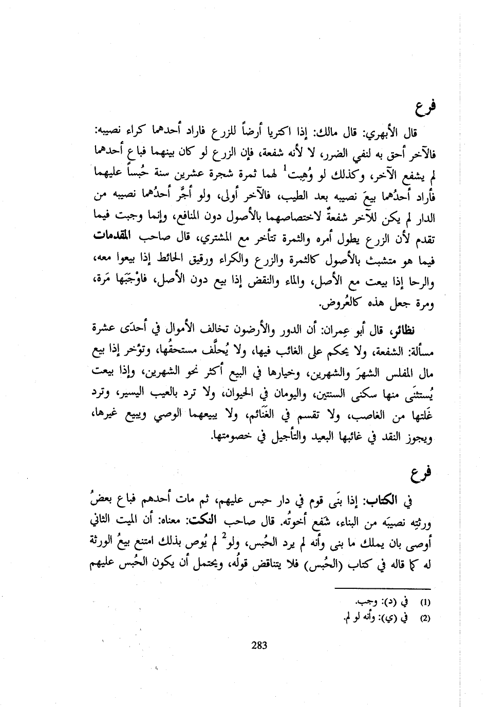 قَالَ الْأَبْهَرِيُّ قَالَ مَالِكٌ إِذَا اكْتَرَيَا أَرْضًا لِلزَّرْعِ فَأَرَادَ أَحَدُهُمَا كِرَاءَ نَصِيبِهِ فَالْآخَرُ أَحَقُّ بِهِ لِنَفْيِ الضَّرَرِ لَا لِأَنَّهُ شُفْعَةٌ فَإِنَّ الزَّرْعَ لَوْ كَانَ بَيْنَهُمَا فَبَاعَ أَحَدُهُمَا لَمْ يَشْفَعِ الْآخَرُ وَكَذَلِكَ لَوْ وُهِبَتْ لَهُمَا ثَمَرَةُ شَجَرَةٍ عِشْرِينَ سَنَةٍ حُبْسًا عَلَيْهِمَا فَأَرَادَ أَحَدُهُمَا بَيْعَ نَصِيبِهِ بَعْدَ الطِّيبِ فَالْآخَرُ أَوْلَى وَلَوْ أَجَّرَ أَحَدُهُمَا نَصِيبَهُ مِنَ الدَّارِ لَمْ يَكُنْ لِلْآخَرِ شُفْعَةٌ لِاخْتِصَاصِهِمَا بِالْأُصُولِ دُونَ الْمَنَافِعِ وَإِنَّمَا وَجَبَتْ فِيمَا تَقَدَّمَ لِأَنَّ الزَّرْعَ يَطُولُ أَمْرُهُ وَالثَّمَرَةُ تَتَأَخَّرُ مَعَ الْمُشْتَرِي قَالَ صَاحِبُ الْمُقَدِّمَاتِ فِيمَا هُوَ مُتَشَبِّثٌ بِالْأُصُولِ كَالثَّمَرَةِ وَالزَّرْعِ وَالْكِرَاءِ وَرَقِيقِ الْحَائِطِ إِذَا بِيعُوا مَعَهُ وَالرَّحَا إِذَا بِيعَتْ مَعَ الْأَصْلِ وَالْمَاءُ وَالنَّقْضُ إِذَا بيع دُونَ الْأَصْلِ فَأَوْجَبَهَا مَرَّةً وَمَرَّةً جَعَلَ هَذِهِ كَالْعُرُوضِ نَظَائِرُ قَالَ أَبُو عِمْرَانَ إِنَّ الدُّورَ والأرضون تُخَالِفُ الْأَمْوَالَ فِي إِحْدَى عَشْرَةَ مَسْأَلَةً الشُّفْعَةُ وَلَا يُحْكَمُ عَلَى الْغَائِبِ فِيهَا وَلَا يَحْلِفُ مُسْتَحِقُّهَا وَتُؤَخَّرُ إِذَا بِيعَ مَالُ الْمُفْلِسِ الشَّهْرَ وَالشَّهْرَيْنِ وَخِيَارُهَا فِي الْبَيْعِ أَكْثَرَ نَحْوَ الشَّهْرَيْنِ وَإِذَا بِيعَتْ يُسْتَثْنَى مِنْهَا سُكْنَى السَّنَتَيْنِ وَالْيَوْمَانِ فِي الْحَيَوَانِ وَلَا تُرَدُّ بِالْعَيْبِ الْيَسِيرِ وَتُرَدُّ غَلَّتُهَا مِنَ الْغَاصِبِ وَلَا تُقَسَّمُ فِي الْغَنَائِمِ وَلَا يَبِيعُهُمَا الْوَصِيُّ وَيَبِيعُ غَيْرَهَا وَيَجُوزُ النَّقْدُ فِي غَائِبِهَا الْبَعِيدِ وَالتَّأْجِيلُ فِي خُصُومَتِهَا