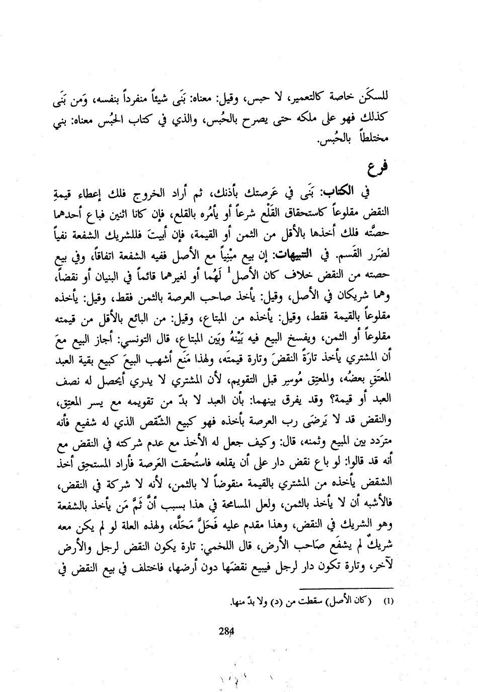 فِي الْكِتَابِ بَنَى فِي عَرْصَتِكَ بِإِذْنِكَ ثُمَّ أَرَادَ الْخُرُوجَ فَلَكَ إِعْطَاءُ قِيمَةِ النَّقْضِ مَقْلُوعًا كَاسْتِحْقَاقِ الْقَلْعِ شَرْعًا أَوْ يَأْمُرُهُ بِالْقَلْعِ فَإِنْ كَانَا اثْنَيْنِ فَبَاعَ أَحَدُهُمَا حِصَّتَهُ فَلَكَ أَخْذُهَا بِالْأَقَلِّ مِنَ الثَّمَنِ أَوِ الْقِيمَةِ فَإِنْ أَبَيْتَ فَلِلشَّرِيكِ الشُّفْعَةُ نَفْيًا لِضَرَرِ الْقَسْمِ فِي التَّنْبِيهَاتِ إِنْ بِيعَ مَبْنِيًّا مَعَ الْأَصْلِ فَفِيهِ الشُّفْعَةُ اتِّفَاقًا وَفِي بَيْعِ حِصَّتِهِ مِنَ النَّقْضِ خِلَافٌ كَانَ الْأَصْلُ لَهُمَا أَوْ لِغَيْرِهِمَا قَائِمًا فِي الْبُنْيَانِ أَوْ نَقْضًا وَهُمَا شَرِيكَانِ فِي الْأَصْلِ وَقِيلَ يَأْخُذُ صَاحِبُ الْعَرْصَةِ بِالثَّمَنِ فَقَطْ وَقِيلَ يَأْخُذُهُ مَقْلُوعًا بِالْقِيمَةِ فَقَطْ وَقِيلَ يَأْخُذُهُ مِنَ الْمُبْتَاعِ وَقِيلَ مِنَ الْبَائِعِ بِالْأَقَلِّ مِنْ قِيمَتِهِ مَقْلُوعًا أَوِ الثَّمَنِ وَيُفْسَخُ الْبَيْعُ فِيهِ بَيْنَهُ وَبَيْنَ الْمُبْتَاعِ قَالَ التُّونِسِيُّ أَجَازَ الْبَيْعَ مَعَ أَنَّ الْمُشْتَرِيَ يَأْخُذُ تَارَةً النَّقْضَ وَتَارَةً قِيمَتَهُ وَلِهَذَا مَنَعَ أَشْهَبُ الْبَيْعَ كَبَيْعِ بَقِيَّةِ الْعَبْدِ الْمُعْتَقِ بَعْضُهُ وَالْمُعْتِقُ مُوسِرٌ قَبْلَ التَّقْوِيمِ لِأَنَّ الْمُشْتَرِيَ لَا يَدْرِي أَيَحْصُلُ لَهُ نِصْفُ الْعَبْدِ أَوْ قِيمَةٌ وَقَدْ يُفَرَّقُ بَيْنَهُمَا بِأَنَّ الْعَبْدَ لَا بُدَّ مِنْ تَقْوِيمِهِ مَعَ يُسْرِ الْمُعْتِقِ وَالنَّقْضِ قَدْ لَا يَرْضَى رَبُّ الْعَرْصَةِ بِأَخْذِهِ فَهُوَ كَبَيْعِ الشِّقْصِ الَّذِي لَهُ شَفِيعٌ فَإِنَّهُ مُتَرَدِّدٌ بَيْنَ الْمَبِيعِ وَثَمَنِهِ قَالَ وَكَيْفَ جُعِلَ لَهُ الْأَخْذُ مَعَ عَدَمِ شَرِكَتِهِ فِي النَّقْضِ مَعَ أَنَّهُ قَدْ قَالُوا لَوْ بَاعَ نَقْضَ دَارٍ عَلَى أَنْ يَقْلَعَهُ فَاسْتَحَقَّتِ الْعَرْصَةُ فَأَرَادَ الْمُسْتَحق أَخذ الشقض يَأْخُذُهُ مِنَ الْمُشْتَرِي بِالْقِيمَةِ مَنْقُوضًا لَا بِالثَّمَنِ لِأَنَّهُ لَا شَرِكَةَ فِي النَّقْضِ فَالْأَشْبَهُ أَنْ لَا يَأْخُذَ بِالثَّمَنِ وَلَعَلَّ الْمُسَامَحَةَ فِي هَذَا بِسَبَبِ أَنَّ ثَمَّ مَنْ يَأْخُذُ بِالشُّفْعَةِ وَهُوَ الشَّرِيكُ فِي النَّقْضِ وَهَذَا مُقَدَّمٌ عَلَيْهِ فَحَلَّ مَحَلَّهُ وَلِهَذِهِ الْعِلَّةِ لَوْ لَمْ يَكُنْ مَعَهُ شَرِيكٌ لَمْ يَشْفَعْ صَاحِبُ الْأَرْضِ قَالَ الْلَخْمِيُّ تَارَةً يَكُونُ النَّقْضُ لِرَجُلٍ وَالْأَرْضُ لِآخَرَ وَتَارَةً تَكُونُ دَارٌ لِرَجُلٍ فَيَبِيعُ نَقْضَهَا دُونَ أَرْضِهَا فَاخْتُلِفَ فِي بَيْعِ النَّقْضِ فِي