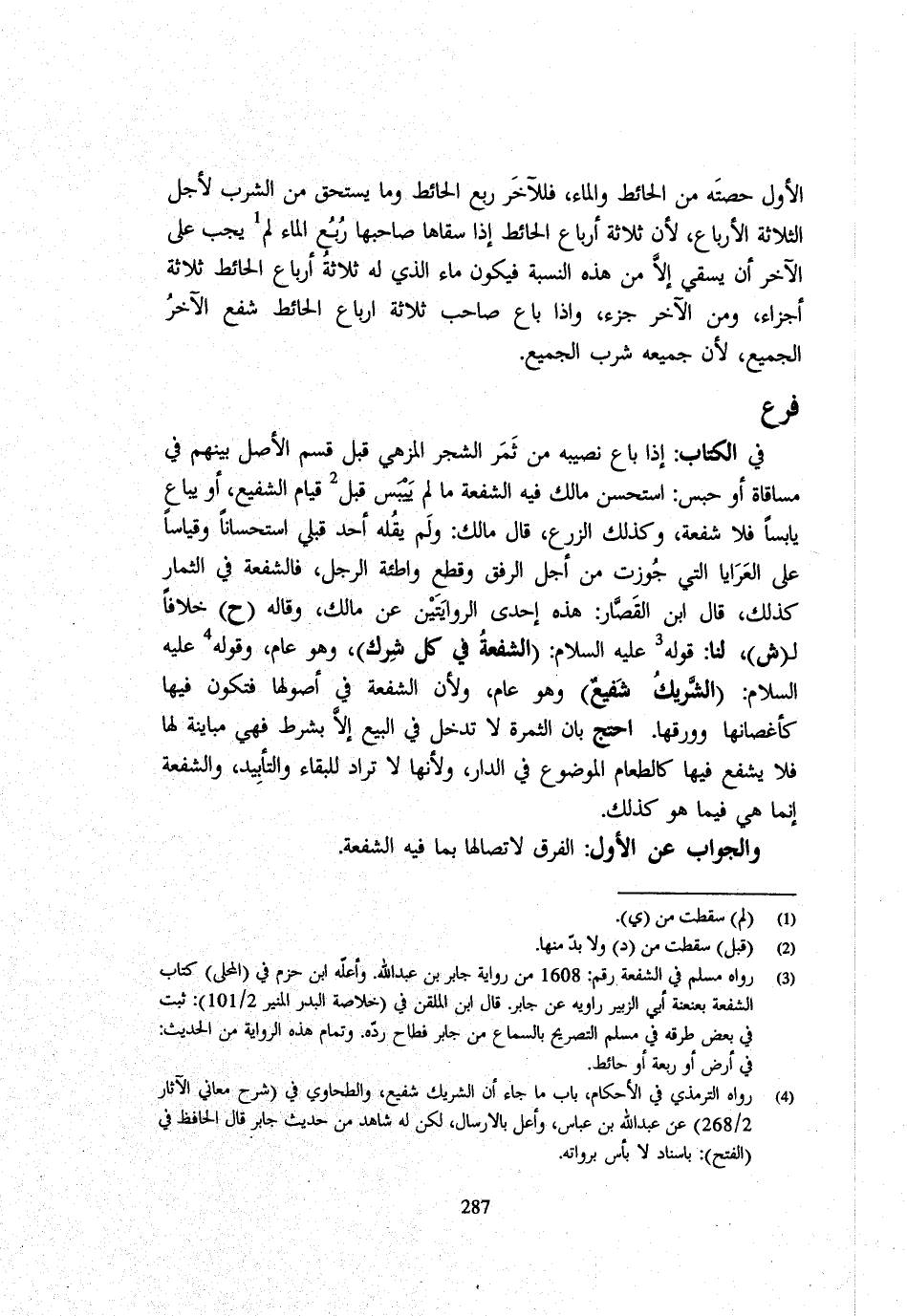 فِي الْكِتَابِ إِذَا بَاعَ نَصِيبَهُ مِنْ ثَمَرِ الشَّجَرِ الْمُزْهِي قَبْلَ قَسْمِ الْأَصْلِ بَيْنَهُمْ فِي مُسَاقَاةٍ أَوْ حُبْسٍ اسْتَحْسَنَ مَالِكٌ فِيهِ الشُّفْعَةَ مَا لَمْ يَيْبَسْ قَبْلَ قِيَامِ الشَّفِيعِ أَوْ يُبَاعُ يَابِسًا فَلَا شُفْعَةَ وَكَذَلِكَ الزَّرْعُ قَالَ مَالِكٌ وَلَمْ يَقُلْهُ أَحَدٌ قَبَلِي اسْتِحْسَانًا وَقِيَاسًا عَلَى الْعَرَايَا الَّتِي جُوِّزَتْ مِنْ أَجْلِ الرِّفْقِ وَقَطْعِ وَاطِئَةِ الرَّجُلِ فَالشُّفْعَةُ فِي الثِّمَارِ كَذَلِكَ قَالَ ابْنُ الْقَصَّارِ هَذِهِ إِحْدَى الرِّوَايَتَيْنِ عَنْ مَالِكٍ وَقَالَهُ ح خِلَافًا ل ش لَنَا قَوْلُهُ - صَلَّى اللَّهُ عَلَيْهِ وَسَلَّم َ - الشُّفْعَةُ فِي كُلِّ شِرْكٍ وَهُوَ عَامٌّ وَقَوْلُهُ - صَلَّى اللَّهُ عَلَيْهِ وَسَلَّم َ - الشَّرِيكُ شَفِيعٌ وَهُوَ عَامٌّ وَلِأَنَّ الشُّفْعَةَ فِي أُصُولِهَا فَتَكُونُ فِيهَا كَأَغْصَانِهَا وَوَرَقِهَا احْتَجَّ بِأَنَّ الثَّمَرَةَ لَا تَدْخُلُ فِي الْبَيْعِ إِلَّا بِشَرْطٍ فَهِيَ مُبَايِنَةٌ لَهَا فَلَا يُشْفَعُ فِيهَا كَالطَّعَامِ الْمَوْضُوعِ فِي الدَّارِ وَلِأَنَّهَا لَا تُرَادُ لِلْبَقَاءِ وَالتَّأْبِيدِ وَالشُّفْعَةُ إِنَّمَا هِيَ فِيمَا هُوَ كَذَلِكَ وَالْجَوَابُ عَنِ الْأَوَّلِ الْفَرْقُ لِاتِّصَالِهَا بِمَا فِيهِ الشُّفْعَة