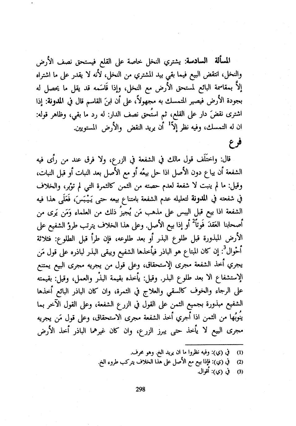 قَالَ وَاخْتَلَفَ قَوْلُ مَالِكٍ فِي الشُّفْعَةِ فِي الزَّرْعِ وَلَا فَرْقَ عِنْدَ مَنْ رَأَى فِيهِ الشُّفْعَةَ أَنْ يُبَاعَ دُونَ الْأَصْلِ إِذَا حَلَّ بَيْعُهُ أَوْ مَعَ الْأَصْلِ بَعْدَ النَّبَاتِ أَوْ قَبْلَ النَّبَاتِ وَقِيلَ مَا لم يَنْبُتْ لَا شُفْعَةَ لِعَدَمِ حِصَّتِهِ مِنَ الثَّمَنِ كَالثَّمَرَةِ الَّتِي لَمْ تُؤَبَّرْ وَالْخِلَافُ فِي شُفْعَتِهِ فِي الْمُدَوَّنَةِ لِتَعْلِيلِهِ عَدَمَ الشُّفْعَةِ بِامْتِنَاعِ بَيْعِهِ حَتَّى يَيْبَسَ فَعَلَى هَذَا فِيهِ الشُّفْعَةُ إِذَا بِيعَ قَبْلَ الْيُبْسِ عَلَى مَذْهَبِ مَنْ يُجِيزُ ذَلِكَ مِنَ الْعُلَمَاءِ وَمَنْ يَرَى مِنْ أَصْحَابِنَا الْعَقْدَ فَوْتًا أَوْ إِذَا بِيعَ الْأَصْلُ وَعَلَى هَذَا الْخلاف يَتَرَتَّب طرؤ الشَّفِيعِ عَلَى الْأَرْضِ الْمَبْذُورَةِ قَبْلَ طُلُوعِ الْبَذْرِ أَوْ بَعْدَ طُلُوعِهِ فَإِنْ طَرَأَ قَبْلَ الطُّلُوعِ فَثَلَاثَةُ أَحْوَالٍ إِنْ كَانَ الْمُبْتَاعُ هُوَ الْبَاذِرُ فَيَأْخُذُهَا الشَّفِيعُ وَيَبْقَى الْبَذْرُ لِبَاذِرِهِ عَلَى قَوْلِ مَنْ يُجْرِي أَخْذَ الشُّفْعَةِ مَجْرَى الِاسْتِحْقَاقِ وَعَلَى قَوْلِ مَنْ يُجْرِيهِ مَجْرَى الْبَيْعِ يُمْتَنَعُ الِاسْتِشْفَاعُ إِلَّا بَعْدَ طُلُوعِ الْبَذْرِ وَقِيلَ يَأْخُذُهُ بِقِيمَةِ الْبَذْرِ وَالْعَمَلِ وَقِيلَ بِقِيمَتِهِ عَلَى الرَّجَاءِ وَالْخَوْفِ كَالسَّقْيِ وَالْعِلَاجِ فِي الثَّمَرَةِ وَإِنْ كَانَ الْبَاذِرُ الْبَائِعُ أَخَذَهَا الشَّفِيعُ مَبْذُورَةً بِجَمِيعِ الثَّمَنِ عَلَى الْقَوْلِ فِي الزَّرْعِ الشُّفْعَةُ وَعَلَى الْقَوْلِ الْآخَرِ بِمَا يَنُوبُهَا مِنَ الثَّمَنِ إِذَا أُجْرِيَ أَخْذُ الشُّفْعَةِ مَجْرَى الِاسْتِحْقَاقِ وَعَلَى قَوْلِ مَنْ يُجْرِيهِ مَجْرَى الْبَيْعِ لَا يَأْخُذُ حَتَّى يَبْرُزَ الزَّرْعُ وَإِنْ كَانَ غَيْرَهُمَا الْبَاذِرُ أَخَذَ الْأَرْضَ