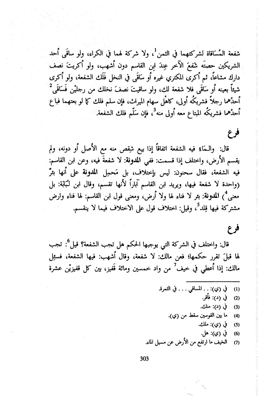 قَالَ وَالْمَاءُ فِيهِ الشُّفْعَةُ اتِّفَاقًا إِذَا بِيعَ شِقْصٌ مِنْهُ مَعَ الْأَصْلِ أَوْ دُونَهُ وَلَمْ يُقَسِّمِ الْأَرْضَ وَاخْتُلِفَ إِذَا قُسِّمَتْ فَفِي الْمُدَوَّنَةِ لَا شُفْعَةَ فِيهِ وَعَنِ ابْنِ الْقَاسِمِ فِيهِ الشُّفْعَةُ فَقَالَ سَحْنُونٌ لَيْسَ بِاخْتِلَافٍ بَلْ مَحْمِلُ الْمُدَوَّنَةِ عَلَى أَنَّهَا بِئْرٌ وَاحِدَةٌ لَا شُفْعَةَ فِيهَا وَيُرِيدُ ابْنُ الْقَاسِمِ آبَارًا لِأَنَّهَا تُقَسَّمُ وَقَالَ ابْنُ لُبَابَةَ بَلْ مَعْنَى الْمُدَوَّنَةِ بِئْرٌ لَا فِنَاءَ لَهَا وَلَا أَرْضَ وَمَعْنَى قَوْلِ ابْنِ الْقَاسِمِ لَهَا فِنَاءٌ وَأَرْضٌ مُشْتَرَكَةٌ فِيهَا قِلْدٌ وَقِيلَ اخْتِلَافُ قَوْلٍ عَلَى الِاخْتِلَافِ فِيمَا لَا يَنْقَسِمُ