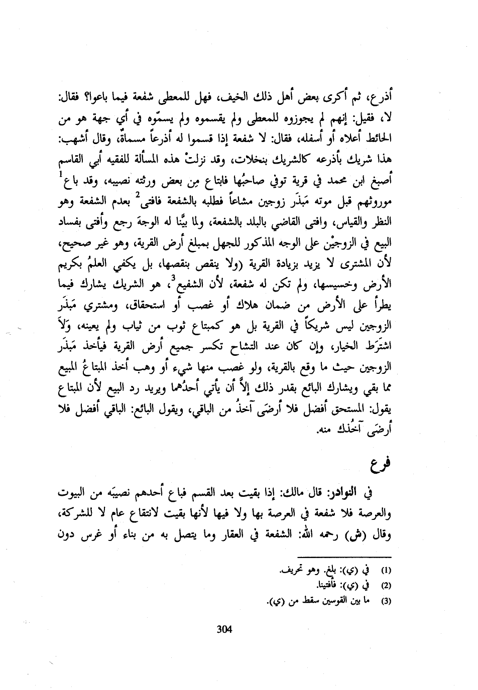 أَذْرُعٍ ثُمَّ أَكْرَى بَعْضَ أَهْلِ ذَلِكَ الْخَيْفِ فَهَلْ لِلْمُعْطَى شُفْعَةٌ فِيمَا بَاعُوا فَقَالَ لَا فَقِيلَ إِنَّهُمْ لَمْ يُجَوِّزُوهُ لِلْمُعْطَى وَلَمْ يُقَسِّمُوهُ وَلَمْ يُسَمُّوهُ فِي أَيِّ جِهَةٍ هُوَ مِنَ الْحَائِطِ أَعْلَاهُ أَوْ أَسْفَلَهُ فَقَالَ لَا شُفْعَةَ إِذَا قَسَّمُوا لَهُ أَذْرُعًا مُسَمَّاةً وَقَالَ أَشْهَبُ هَذَا شَرِيكٌ بِأَذْرُعِهِ كَالشَّرِيكِ بِنَخْلَاتٍ وَقَدْ نَزَلَتْ هَذِه المسالة للفقيه أبي الْقَاسِم اصبغ ابْن مُحَمَّدٍ فِي قَرْيَةٍ تُوُفِّيَ صَاحِبُهَا فَابْتَاعَ مِنْ بَعْضِ وَرَثَتِهِ نصِيبَهُ وَقَدْ بَاعَ مَوْرُوثُهُمْ قَبْلَ مَوْتِهِ مَبْذَرَ زَوْجَيْنِ مُشَاعًا فَطَلَبَهُ بِالشُّفْعَةِ فَأَفْتَى بِعَدَمِ الشُّفْعَةِ وَهُوَ النَّظَرُ وَالْقِيَاسُ وَأَفْتَى الْقَاضِي بِالْبَلَدِ بِالشُّفْعَةِ وَلَمَّا بَيَّنَّا لَهُ الْوَجْهَ رَجَعَ وَأَفْتَى بِفَسَادِ الْبَيْعِ فِي الزَّوْجَيْنِ عَلَى الْوَجْهِ الْمَذْكُورِ لِلْجَهْلِ بِمَبْلَغِ أَرْضِ الْقَرْيَةِ وَهُوَ غَيْرُ صَحِيحٍ لِأَنَّ الْمُشْتَرَى لَا يَزِيدُ بِزِيَادَةِ الْقَرْيَةِ وَلَا يَنْقُصُ بِنَقْصِهَا بَلْ يَكْفِي الْعِلْمُ بِكَرِيمِ الْأَرْضِ وَخَسِيسِهَا وَلَمْ تَكُنْ لَهُ شُفْعَةٌ لِأَنَّ الشَّفِيع هُوَ الشَّرِيكُ يُشَارِكُ فِيمَا يَطْرَأُ عَلَى الْأَرْضِ مِنْ ضَمَانِ هَلَاكٍ أَوْ غَصْبٍ أَوِ اسْتِحْقَاقٍ وَمُشْتَرِي مَبْذَرِ الزَّوْجَيْنِ لَيْسَ شَرِيكًا فِي الْقَرْيَةِ بَلْ هُوَ كَمُبْتَاعِ ثَوْبٍ مِنْ ثِيَابٍ وَلَمْ يُعَيِّنْهُ وَلَا اشْتَرَطَ الْخِيَارَ وَإِنْ كَانَ عِنْدَ التَّشَاحِّ تُكَسَّرُ جَمِيعُ أَرْضِ الْقَرْيَةِ فَيَأْخُذُ مَبْذَرَ الزَّوْجَيْنِ حَيْثُ مَا وَقَعَ بِالْقَرْيَةِ وَلَوْ غُصِبَ مِنْهَا شَيْءٌ أَوْ وُهِبَ أَخَذَ الْمُبْتَاعُ الْمَبِيعَ مِمَّا بَقِيَ وَيُشَارِكُ الْبَائِعَ بِقَدْرِ ذَلِكَ إِلَّا أَنْ يَأْتِيَ أَحَدُهُمَا وَيُرِيدُ رَدَّ الْبَيْعِ لِأَنَّ الْمُبْتَاعَ يَقُولُ الْمُسْتَحَقُّ أَفْضَلُ فَلَا أَرْضَى آخُذُ مِنَ الْبَاقِي وَيَقُولُ الْبَائِعُ الْبَاقِي أَفْضَلُ فَلَا أَرْضَى آخُذُكَ مِنْهُ