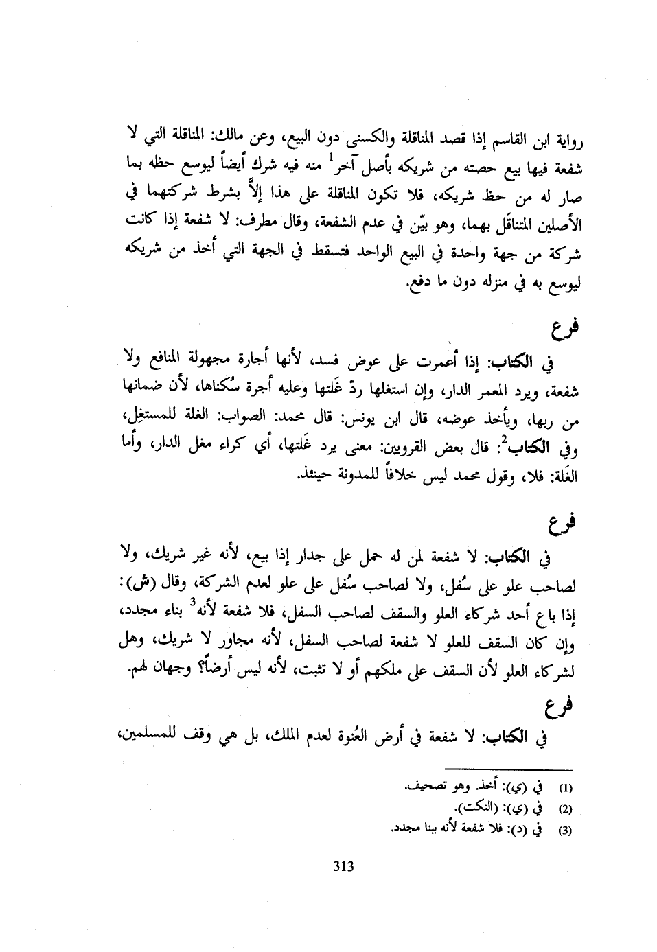 رِوَايَة ابْن الْقَاسِم إِذا قصد المناقلة والكسنى دُونَ الْبَيْعِ وَعَنْ مَالِكٍ الْمُنَاقَلَةُ الَّتِي لَا شُفْعَةَ فِيهَا بَيْعُ حِصَّتِهِ مِنْ شَرِيكِهِ بِأَصْلٍ آخَرَ مِنْهُ فِيهِ شِرْكٌ أَيْضًا لِيُوَسِّعَ حَظَّهُ بِمَا صَارَ لَهُ مِنْ حَظِّ شَرِيكِهِ فَلَا تَكُونُ الْمُنَاقَلَةُ عَلَى هَذَا إِلَّا بِشَرْطِ شَرِكَتِهِمَا فِي الْأَصْلَيْنِ الْمُتَنَاقَلِ بِهِمَا وَهُوَ بَيِّنٌ فِي عَدَمِ الشُّفْعَةِ وَقَالَ مُطَرِّفٌ لَا شُفْعَةَ إِذَا كَانَتْ شَرِكَةً مِنْ جِهَةٍ وَاحِدَةٍ فِي الْبَيْعِ الْوَاحِدِ فَتُسْقَطُ فِي الْجِهَةِ الَّتِي أَخَذَ مِنْ شَرِيكِهِ لِيُوَسِّعَ بِهِ فِي مَنْزِلِهِ دُونَ مَا دَفَعَ