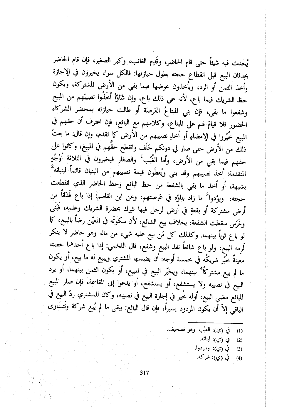 يُحْدِثْ فِيهِ شيئاَ حَتَّى قَامَ الْحَاضِرُ وَقِدَمَ الْغَائِبُ وَكَبِرَ الصَّغِيرُ فَإِنْ قَامَ الْحَاضِرُ بِحِدْثَانِ الْبَيْعِ قَبْلَ انْقِطَاعِ حُجَّتِهِ بِطُولِ حِيَازَتِهَا فَالْكُلُّ سَوَاءٌ يُخَيَّرُونَ فِي الْإِجَازَةِ وَأَخْذِ الثَّمَنِ أَوِ الرَّدِّ وَيَأْخُذُونَ عِوَضَهَا فِيمَا بَقِيَ مِنَ الْأَرْضِ الْمُشْتَرَكَةِ وَيَكُونُ حَظُّ الشَّرِيكِ فِيمَا بَاعَ لِأَنَّهُ على ذَلِك بَاعَ وَإِن شاؤا أَخَذُوا نَصِيبَهُمْ مِنَ الْمَبِيعِ وَشَفَعُوا مَا بَقِيَ فَإِنْ بَنَى الْمُبْتَاعُ الْعَرْصَةَ أَوْ طَالَتْ حِيَازَتُهُ بِمَحْضَرِ الشُّرَكَاءِ الْحُضُورِ فَلَا قِيَامَ لَهُمْ عَلَى الْمُبْتَاعِ وَكَلَامُهُمْ مَعَ الْبَائِعِ فَإِنِ اعْتَرَفَ أَنَّ حَقَّهُمْ فِي الْمَبِيعِ خُيِّرُوا فِي الْإِمْضَاءِ أَوْ أَخْذِ نَصِيبِهِمْ مِنَ الْأَرْضِ كَمَا تَقَدَّمَ وَإِنْ قَالَ مَا بِعْتُ ذَلِكَ مِنَ الْأَرْضِ حَتَّى صَارَ لِي دُونَكُمْ حَلَفَ وَانْقَطَعَ حَقُّهُمْ فِي الْمَبِيعِ وَكَانُوا عَلَى حَقِّهِمْ فِيمَا بَقِيَ مِنَ الْأَرْضِ وَأَمَّا الْغُيَّبُ وَالصِّغَارُ فَيُخَيَّرُونَ فِي الثَّلَاثَةِ أوجه الْمُتَقَدّمَة اخذ نصِيبهم وَقد بنى ويعطون قِيمَةَ نَصِيبِهِمْ مِنَ الْبُنْيَانِ قَائِمًا لِبُنْيَانِهِ بِشُبْهَةٍ أَوْ أَخْذُ مَا بَقِيَ بِالشُّفْعَةِ مِنْ حَظِّ البَائِع وحظ الْحَاضِر الَّذِي انْقَطَعت حجَّته ويؤدوا مَا زَادَ بِنَاؤُهُ فِي عَرْصَتِهِمْ وَعَنِ ابْنِ الْقَاسِمِ إِذَا بَاعَ فَدَّانًا مِنْ أَرْضٍ مُشْتَرَكَةٍ أَوْ بُقْعَةٍ فِي أَرْضٍ لِرَجُلٍ فِيهَا شِرْكٌ بِحَضْرَةِ الشَّرِيكِ وَعِلْمِهِ فَبَنَى وَغَرَسَ سَقَطَتِ الشُّفْعَةُ بِخِلَافِ بَيْعِ الشَّائِعِ لِأَنَّ سُكُوتَهُ فِي الْمُعَيَّنِ رِضًا بِالْبَيْعِ كَمَا لَوْ بَاعَ ثَوْبًا بَيْنَهُمَا وَكَذَلِكَ كُلُّ مَنْ بِيعَ عَلَيْهِ شَيْءٌ مِنْ مَالِهِ وَهُوَ حَاضِرٌ لَا يُنْكِرُ لَزِمَهُ الْبَيْعُ وَلَوْ بَاعَ شَائِعًا نَفِذَ الْبَيْعُ وَشَفَعَ قَالَ الْلَخْمِيُّ إِذَا بَاعَ أَحَدُهُمَا حِصَّتَهُ مُعَيَّنَةً خُيِّرَ شَرِيكُهُ فِي خَمْسَةِ أَوْجُهٍ أَنْ يَضْمَنَهَا الْمُشْتَرِي وَيَبِيعَ لَهُ مَا بِيعَ أَوْ يَكُونَ مَا لم يبع مُشْتَركا بَينهمَا وَيُخَير الْبَيْعَ فِي الْمَبِيعِ أَوْ يَكُونَ الثَّمَنُ بَيْنَهُمَا أَوْ يَرُدَّ الْبَيْعَ فِي نَصِيبِهِ وَلَا يَسْتَشْفِعُ أَو يستشفع أَو يدعوا إِلَى الْمُقَاسَمَةِ فَإِنْ صَارَ الْمَبِيعُ لِلْبَائِعِ مَضِيَ البيع أَوله خُيِّرَ فِي إِجَازَةِ الْبَيْعِ فِي نَصِيبِهِ وَكَانَ لِلْمُشْتَرِي رَدُّ الْبَيْعِ فِي الْبَاقِي إِلَّا أَنْ يَكُونَ الْمَرْدُودُ يَسِيرًا فَإِنْ قَالَ الْبَائِعُ يَبْقَى مَا لَمْ يَبِعْ شِرْكَةً وَنَتَسَاوَى