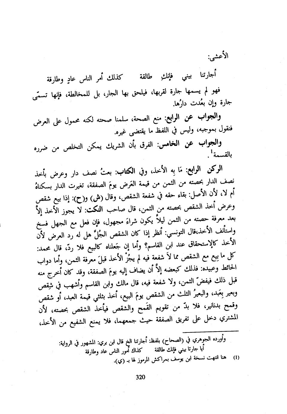 فَهُوَ لَمْ يُسَمِّهَا جَارَّةً لِقُرْبِهَا فَيَلْحَقُ بِهَا الْجَارُ بَلْ لِلْمُخَالَطَةِ فَإِنَّهَا تسمى جَارة وان بَعدت دارها وَالْجَوَاب عَن الرَّابِعِ مَنْعُ الصِّحَّةِ سَلَّمْنَا صِحَّتَهُ لَكِنَّهُ مَحْمُولٌ عَلَى الْعَرْضِ فَنَقُولُ بِمُوجَبِهِ وَلَيْسَ فِي اللَّفْظِ مَا يَقْتَضِي غَيره وَالْجَوَاب عَن الْخَامِسِ الْفَرْقُ بِأَنَّ الشَّرِيكَ يُمْكِنُ التَّخَلُّصُ مِنْ ضَرَرِهِ بِالْقِسْمَةِ الرُّكْن الرَّابِعُ مَا بِهِ الْأَخْذُ وَفِي الْكتاب بِعْت نصف دَار وَعرض بِأخذ نِصْفَ الدَّارِ بِحِصَّتِهِ مِنَ الثَّمَنِ مِنْ قِيمَةِ الْعَرَضِ يَوْمَ الصَّفْقَةِ تَغَيَّرَتِ الدَّارُ بِسُكْنَاهُ أَمْ لَا لِأَنَّ الْأَصْلَ بَقَاءُ حَقِّهِ فِي شُفْعَةِ الشّقص وَقَالَ ش وح إِذَا بِيعَ شِقْصٌ وَعَرَضٌ أَخَذَ الشِّقْصَ بِحِصَّتِهِ مِنَ الثَّمَنِ قَالَ صَاحِبُ النُّكَتِ لَا يَجُوزُ الْأَخْذُ إِلَّا بَعْدَ مَعْرِفَةِ حِصَّتِهِ مِنَ الثَّمَنِ لَيْلًا يَكُونَ شِرَاءَ مَجْهُولٍ فَإِنْ فَعَلَ مَعَ الْجَهْلِ فَسَخَ وَاسْتَأْنَفَ الْأَخْذَ قَالَ التُّونِسِيُّ انْظُرْ إِذَا كَانَ الشِّقْصُ الْجُلَّ هَلْ لَهُ رَدُّ الْعَرَضِ لِأَنَّ الْأَخْذَ كَالِاسْتِحْقَاقِ عِنْدَ ابْنِ الْقَاسِمِ وَأَمَّا إِنْ جَعَلْنَاهُ كَالْبَيْعِ فَلَا رَدَّ قَالَ مُحَمَّدٌ كُلُّ مَا بِيعَ مَعَ الشِّقْصِ مِمَّا لَا شُفْعَةَ فِيهِ لَمْ يَجُزِ الْأَخْذُ قَبْلَ مَعْرِفَةِ الثَّمَنِ وَأَمَّا دَوَابُّ الْحَائِطِ وَعَبِيدُهُ فَذَلِكَ كَبَعْضِهِ إِلَّا أَنْ يُضَافَ إِلَيْهِ يَوْمَ الصَّفْقَةِ وَقَدْ كَانَ أُخْرِجَ مِنْهُ قَبْلَ ذَلِكَ فَيُفَضُّ الثَّمَنُ وَلَا شُفْعَةَ فِيهِ قَالَ مَالِكٌ وَابْنُ الْقَاسِمِ وَأَشْهَبُ فِي شِقْصٍ وَبَعِيرٍ بِعَبْدٍ وَالْبَعِيرُ الثُّلُثُ مِنَ الشِّقْصِ يَوْمَ الْبَيْعِ أَخَذَ بِثُلُثَيْ قِيمَةِ الْعَبْدِ أَوْ شِقْصٍ وَقَمْحٍ بِدَنَانِيرَ فَلَا بُدَّ مِنْ تَقْوِيمِ الْقَمْحِ وَالشِّقْصِ فَيَأْخُذُ الشِّقْصَ بِحِصَّتِهِ لِأَنَّ الْمُشْتَرِيَ دَخَلَ عَلَى تَفْرِيقِ الصَّفْقَةِ حَيْثُ جَمَعَهُمَا فَلَا يَمْنَعُ الشَّفِيعَ مِنَ الْأَخْذِ
