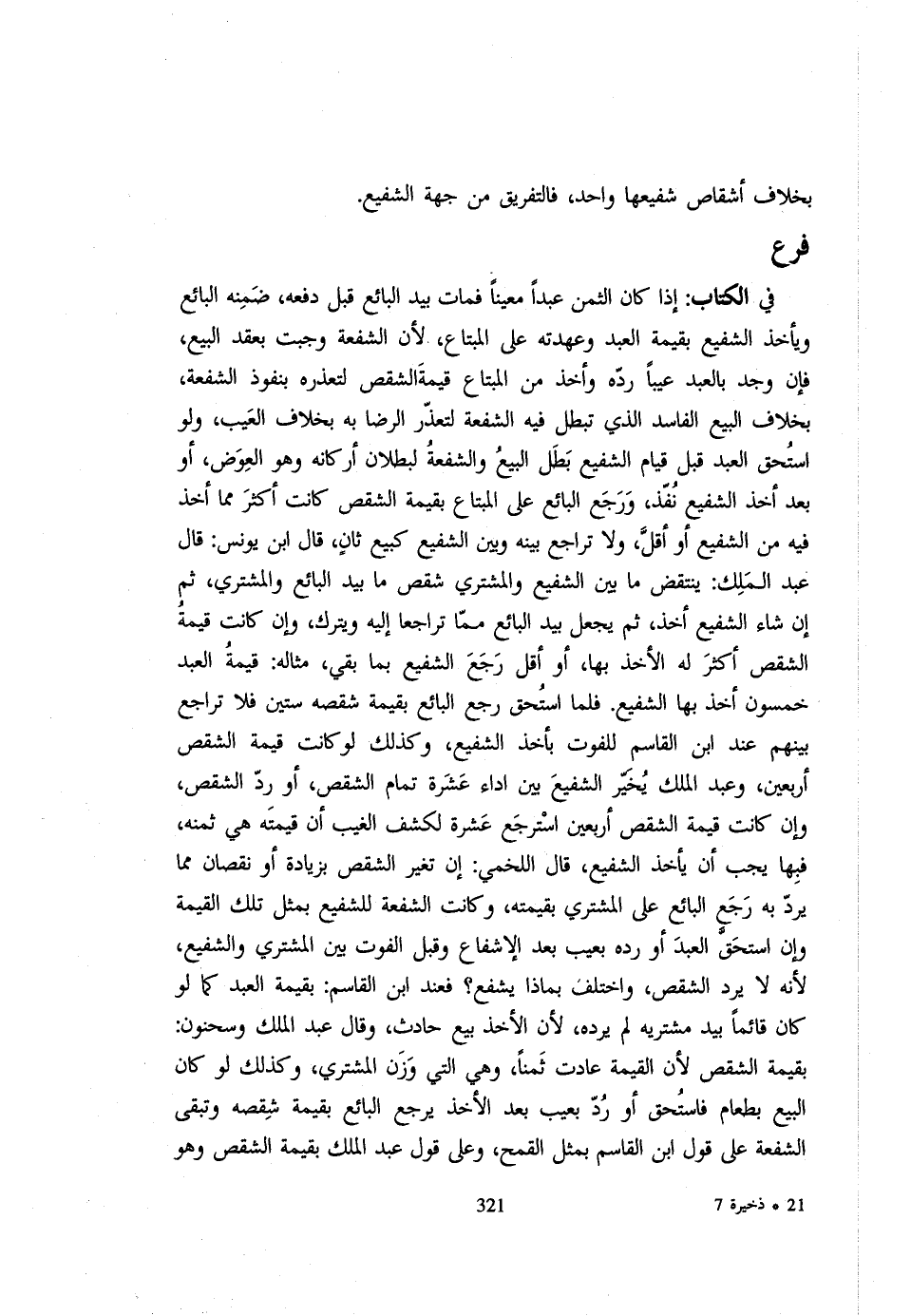 فِي الْكِتَابِ إِذَا كَانَ الثَّمَنُ عَبْدًا مُعَيَّنًا فَمَاتَ بِيَدِ الْبَائِعِ قَبْلَ دَفْعِهِ ضَمِنَهُ الْبَائِعُ وَيَأْخُذُ الشَّفِيعُ بِقِيمَةِ الْعَبْدِ وَعُهْدَتُهُ عَلَى الْمُبْتَاعِ لِأَنَّ الشُّفْعَةَ وَجَبَتْ بِعَقْدِ الْبَيْعِ فَإِنْ وَجَدَ بِالْعَبْدِ عَيْبًا رَدَّهُ وَأَخَذَ مِنَ الْمُبْتَاعِ قِيمَةَ الشِّقْصِ لِتَعَذُّرِهِ بِنُفُوذِ الشُّفْعَةِ بِخِلَافِ الْبَيْعِ الْفَاسِدِ الَّذِي تَبْطُلُ فِيهِ الشُّفْعَةُ لِتَعَذُّرِ الرِّضَا بِهِ بِخِلَافِ الْعَيْبِ وَلَوِ اسْتَحَقَّ الْعَبْدُ قَبْلَ قِيَامِ الشَّفِيعِ بَطَلَ الْبَيْعُ وَالشُّفْعَةُ لِبُطْلَانِ أَرْكَانِهِ وَهُوَ الْعِوَضُ أَوْ بَعْدَ أَخْذِ الشَّفِيعِ نَفَذَ وَرَجَعَ الْبَائِعُ عَلَى الْمُبْتَاعِ بِقِيمَةِ الشِّقْصِ كَانَتْ أَكْثَرَ مِمَّا أَخَذَ فِيهِ مِنَ الشَّفِيعِ أَوْ أَقَلَّ وَلَا تَرَاجُعَ بَيْنَهُ وَبَيْنَ الشَّفِيعِ كَبَيْعٍ ثَانٍ قَالَ ابْنُ يُونُسَ قَالَ عَبْدُ الْمَلِكِ يَنْتَقِضُ مَا بَيْنَ الشَّفِيعِ وَالْمُشْتَرِي شِقْصُ مَا بِيَدِ الْبَائِعِ وَالْمُشْتَرِي ثُمَّ إِنْ شَاءَ الشَّفِيعُ أَخَذَ ثُمَّ يُجْعَلُ بِيَدِ الْبَائِعِ مِمَّا تَرَاجَعَا إِلَيْهِ وَيُتْرَكُ وَإِنْ كَانَتْ قِيمَةُ الشِّقْصِ أَكْثَرَ لَهُ الْأَخْذُ بِهَا أَوْ أَقَلَّ رَجَعَ الشَّفِيعُ بِمَا بَقِيَ مِثَالُهُ قِيمَةُ الْعَبْدِ خَمْسُونَ أَخَذَ بِهَا الشَّفِيعُ فَلَمَّا اسْتُحِقَّ رَجَعَ الْبَائِعُ بِقِيمَة شِقْصِهِ سِتِّينَ فَلَا تَرَاجُعَ بَيْنَهُمْ عِنْدَ ابْنِ الْقَاسِمِ لِلْفَوْتِ بِأَخْذِ الشَّفِيعِ وَكَذَلِكَ لَوْ كَانَتْ قِيمَةُ الشِّقْصِ أَرْبَعِينَ وَعَبْدُ الْمَلِكِ يُخَيِّرُ الشَّفِيعَ بَيْنَ أَدَاءِ عَشَرَةٍ تَمَامَ الشِّقْصِ أَوْ رَدِّ الشِّقْصِ وَإِنْ كَانَتْ قِيمَةُ الشِّقْصِ أَرْبَعِينَ اسْتَرْجَعَ عَشَرَةً لِكَشْفِ الْغَيْبِ أَنْ قَيَّمَتَهُ هِيَ ثَمَنُهُ فَبِهَا يَجِبُ أَنْ يَأْخُذَ الشَّفِيعُ قَالَ الْلَخْمِيُّ إِنْ تَغَيَّرَ الشِّقْصُ بِزِيَادَةٍ أَوْ نُقْصَانٍ مِمَّا يَرُدُّ بِهِ رَجَعَ الْبَائِعُ عَلَى الْمُشْتَرِي بِقِيمَتِهِ وَكَانَتِ الشُّفْعَةُ لِلشَّفِيعِ بِمِثْلِ تِلْكَ الْقِيمَةِ وَإِنِ اسْتَحَقَّ الْعَبْدَ أَوْ رَدَّهُ بِعَيْبٍ بَعْدَ الْإِشْفَاعِ وَقَبْلَ الْفَوْتِ بَيْنَ الْمُشْتَرِي وَالشَّفِيعِ لِأَنَّهُ لَا يَرُدُّ الشِّقْصَ وَاخْتُلِفَ بِمَاذَا يَشْفَعُ فَعِنْدَ ابْنِ الْقَاسِمِ بِقِيمَةِ الْعَبْدِ كَمَا لَوْ كَانَ قَائِمًا بِيَدِ مُشْتَرِيهِ لَمْ يَرُدَّهُ لِأَنَّ الْأَخْذَ بَيْعٌ حَادِثٌ وَقَالَ عَبْدُ الْمَلِكِ وَسَحْنُونٌ بِقِيمَةِ الشِّقْصِ لِأَنَّ الْقِيمَةَ عَادَتْ ثَمَنًا وَهِيَ الَّتِي وَزَنَ الْمُشْتَرِي وَكَذَلِكَ لَوْ كَانَ الْبَيْعُ بِطَعَامٍ فَاسْتُحِقَّ أَوْ رُدَّ بِعَيْبٍ بَعْدَ الْأَخْذِ يَرْجِعُ الْبَائِعُ بِقِيمَةِ شَقْصِهِ وَتَبْقَى الشُّفْعَةُ عَلَى قَوْلِ ابْنِ الْقَاسِمِ بِمِثْلِ الْقَمْحِ وَعَلَى قَوْلِ عَبْدِ الْمَلِكِ بِقِيمَةِ الشِّقْصِ وَهُوَ