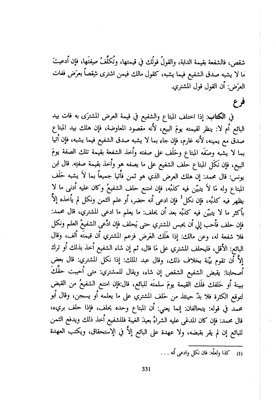 فِي الْكِتَابِ إِذَا اخْتَلَفَ الْمُبْتَاعُ وَالشَّفِيعُ فِي قِيمَةِ الْعَرَضِ الْمُشْتَرَى بِهِ فَاتَ بِيَدِ الْبَائِعِ أَمْ لَا يُنْظَرُ لِقِيمَتِهِ يَوْمَ الْبَيْعِ لِأَنَّهُ مَقْصُودُ الْمُعَاوَضَةِ فَإِنْ هَلَكَ بِيَدِ الْمُبْتَاعِ صُدِّقَ مَعَ يَمِينِهِ لِأَنَّهُ غَارِمٌ فَإِنْ جَاءَ بِمَا لَا يُشْبِهُ صُدِّقَ الشَّفِيعُ فِيمَا يُشْبِهُ فَإِنْ أَتَيَا بِمَا لَا يُشْبِهُ وَصْفُهُ الْمُبْتَاعَ وَحَلَفَ عَلَى صِفَتِهِ وَأَخَذَ الشُّفْعَةَ بِقِيمَةِ تِلْكَ الصِّفَةِ يَوْمَ الْبَيْعِ فَإِنْ نَكَلَ الْمُبْتَاعُ حَلَفَ الشَّفِيعُ عَلَى مَا يَصِفُهُ هُوَ وَأَخَذَ بِقِيمَةِ صِفَتِهِ قَالَ ابْنُ يُونُسَ قَالَ مُحَمَّدٌ إِنْ هَلَكَ الْعَرَضُ الَّذِي هُوَ ثَمَنٌ فَأَتَيَا جَمِيعًا بِمَا لَا يُشْبِهُ حَلَفَ الْمُبْتَاعُ وَلَهُ مَا لَا يَتَبَيَّنُ فِيهِ كَذِبُهُ فَإِنِ امْتَنَعَ حَلَفَ الشَّفِيعُ وَكَانَ عَلَيْهِ أَدْنَى مَا لَا يَظْهَرُ فِيهِ كَذِبُهُ فَإِنْ نَكَلَ فَإِنِ ادَّعَى أَنَّهُ حَضَرَ أَوْ عَلِمَ الثَّمَنَ وَنَكَلَ لَمْ يَأْخُذْهُ إِلَّا بِأَكْثَرِ مَا لَا يَتَبَيَّنُ فِيهِ كَذِبُهُ بَعْدَ أَنْ يَحْلِفَ مَا يَعْلَمُ مَا ادَّعَى الْمُشْتَرِي قَالَ مُحَمَّدٌ فَإِنْ حَلَفَ فَأَحَبُّ إِلَيَّ أَنْ يُحْبَسَ الْمُشْتَرِي حَتَّى يَحْلِفَ فَإِنِ ادَّعَى الشَّفِيعُ الْعِلْمَ وَنَكَلَ فَلَا شُفْعَةَ لَهُ وَعَنْ مَالِكٍ إِذَا هَلَكَ الْعَرَضُ فَزَعَمَ الْمُشْتَرِي أَنَّ قِيمَتَهُ أَلْفٌ وَقَالَ الْبَائِعُ الْأَقَلُّ فَلْيَحْلِفِ الْمُشْتَرِي عَلَى مَا قَالَ ثُمَّ إِنْ شَاءَ الشَّفِيعُ أَخَذَ بِذَلِكَ أَوْ تَرَكَ إِلَّا أَنْ تَقُومَ بَيِّنَةٌ بِخِلَافِ ذَلِكَ وَقَالَ عَبْدُ الْمَلِكِ إِذَا نَكَلَ الْمُشْتَرِي قَالَ بَعْضُ أَصْحَابِنَا يَقْبِضُ الشَّفِيعُ الشِّقْصَ إِنْ شَاءَ وَيُقَالُ لِلْمُشْتَرِي مَتَى أَحْبَبْتَ حَقَّكَ بِبَيِّنَةٍ أَوْ حَلِفِكَ فَلَكَ الْقِيمَةُ يَوْمَ سَلَّمْتَهُ لِلْبَائِعِ قَالَ فَإِنِ امْتَنَعَ الشَّفِيعُ مِنَ الْقَبْضِ لِتَوَقُّعِ الْكَثْرَةِ فَلَا بُدَّ حِينَئِذٍ مِنْ حَلِفِ الْمُشْتَرِي عَلَى مَا يَعْلَمُهُ أَوْ يُسْجَنُ وَقَالَ أَبُو مُحَمَّدٍ فِي قَوْلِهِ يَتَحَالَفَانِ إِنَّمَا يَعْنِي أَنَّ الْمُبْتَاعَ وَحْدَهُ يحلف فَإِذا حلف بَرِيء قَالَ مُحَمَّدٌ فَإِنْ كَانَ الْمُدَّعَى عَلَيْهِ الشِّرَاءُ بَعِيدَ الْغَيْبَةِ فَلِلشَّفِيعِ أَخْذُ ذَلِكَ وَيَدْفَعُ الثَّمَنَ للْبَائِع لَمْ يُقِرَّ بِقَبْضِهِ وَلَا عُهْدَةَ عَلَى الْبَائِعِ إِلَّا فِي الِاسْتِحْقَاقِ وَيَكْتُبُ الْعُهْدَةَ